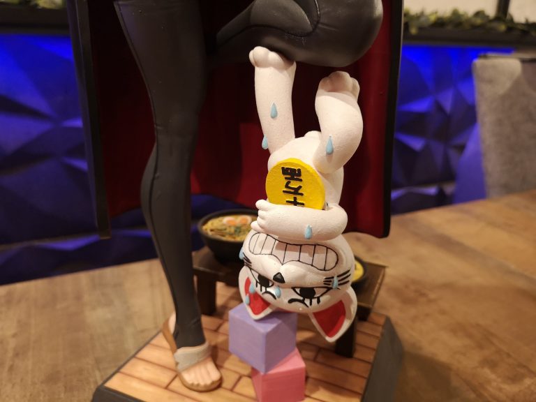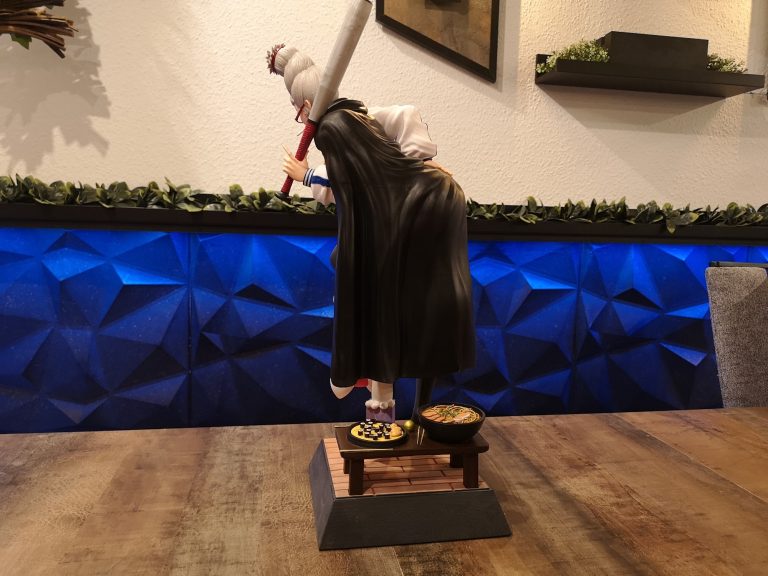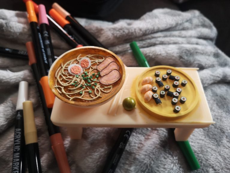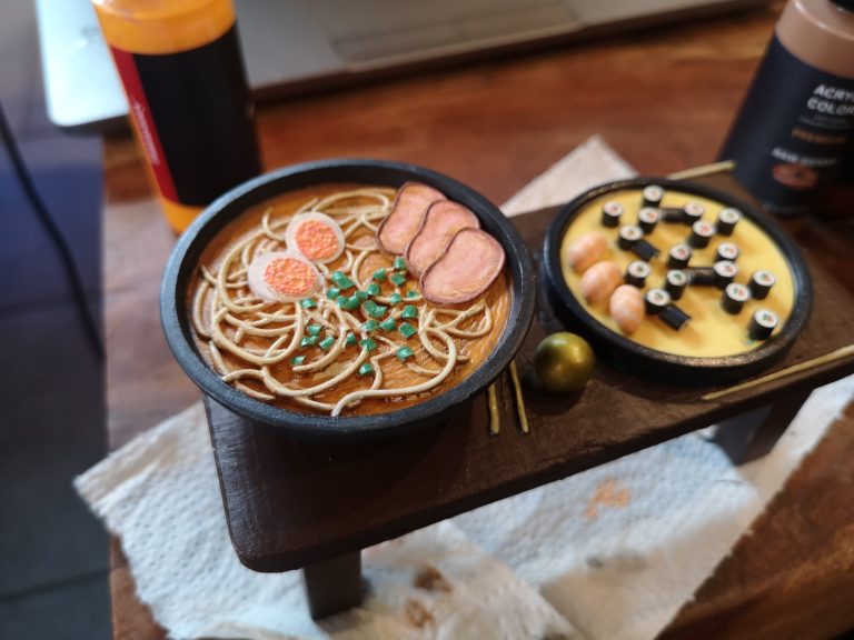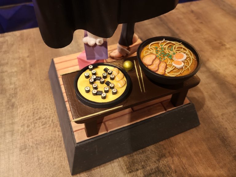 Nachdem alle Komponenten bemalt wurden, habe ich sie mit Sekundenkleber verbunden. Hier musste ich den ein oder anderen Verbund-Keil etwas anpassen, damit keine Spalte am Verbund entstehen. Den Sockel noch fix mit Wischtechnik coloriert um die Holzdielen-Optik hin zu bekommen. Die letzte Hürde war der Tisch mit Ramen und Sushi-Platte. Der Detailgrad ist sehr hoch und alles ein Teil, heißt ungewollte Farbtupferl sind vorprogrammiert. Zudem ist eine realistische Darstellung von Fleisch und der Brühe gar nicht so leicht. Das Ergebnis doch sehr zufriedenstellend geworden. Verläufe habe ich mit einem feuchten Wattestäbchen auf der mit den Markern aufgetragenen Farbe realisiert, diese dadurch etwas weicher gestaltet. Um alles zu fixieren und noch etwas Tiefe zu erreichen, habe ich alles noch mit Seiden-Matt Acryl Klarlack besprüht. Gerade die Maschen im Strickpulli oder die einzelnen Zutaten der Speisen kommt dann noch realistischer rüber.