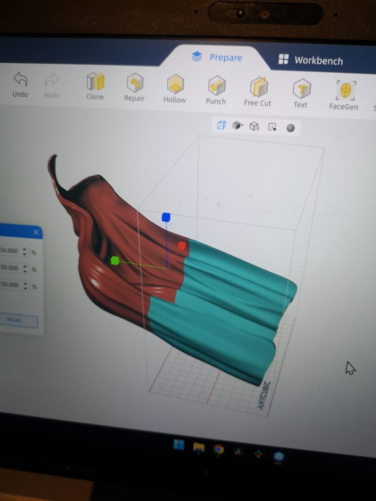 Dateien begutachtet und entschieden, wir können größer! Original ist in 1:6 ausgelegt. Mein Drucker schafft bei Teilung des Capes jedoch auch 1:4. Also 150% Scale. Super, das wird Richtwert. Also getüftelt, ausgerichtet, verschachtelt und losgedruckt... Doch was ist das, kein Druck... Nach einigem Testen die Erkenntnis, Display defekt, nach 2,5 Jahren... Neues Display nur noch über Retailer für 150 € + Versand. Neuer aktueller Drucker inkl. Versand 289 €. Also "leider" ein Neukauf. Doch der hat sich gelohnt! Die Qualität saust von 6k Auflösung auf ganze 14k hoch, das Druckvolumen steigt an, also mehr Platz und die Geschwindigkeit hat sich mehr als verdoppelt!