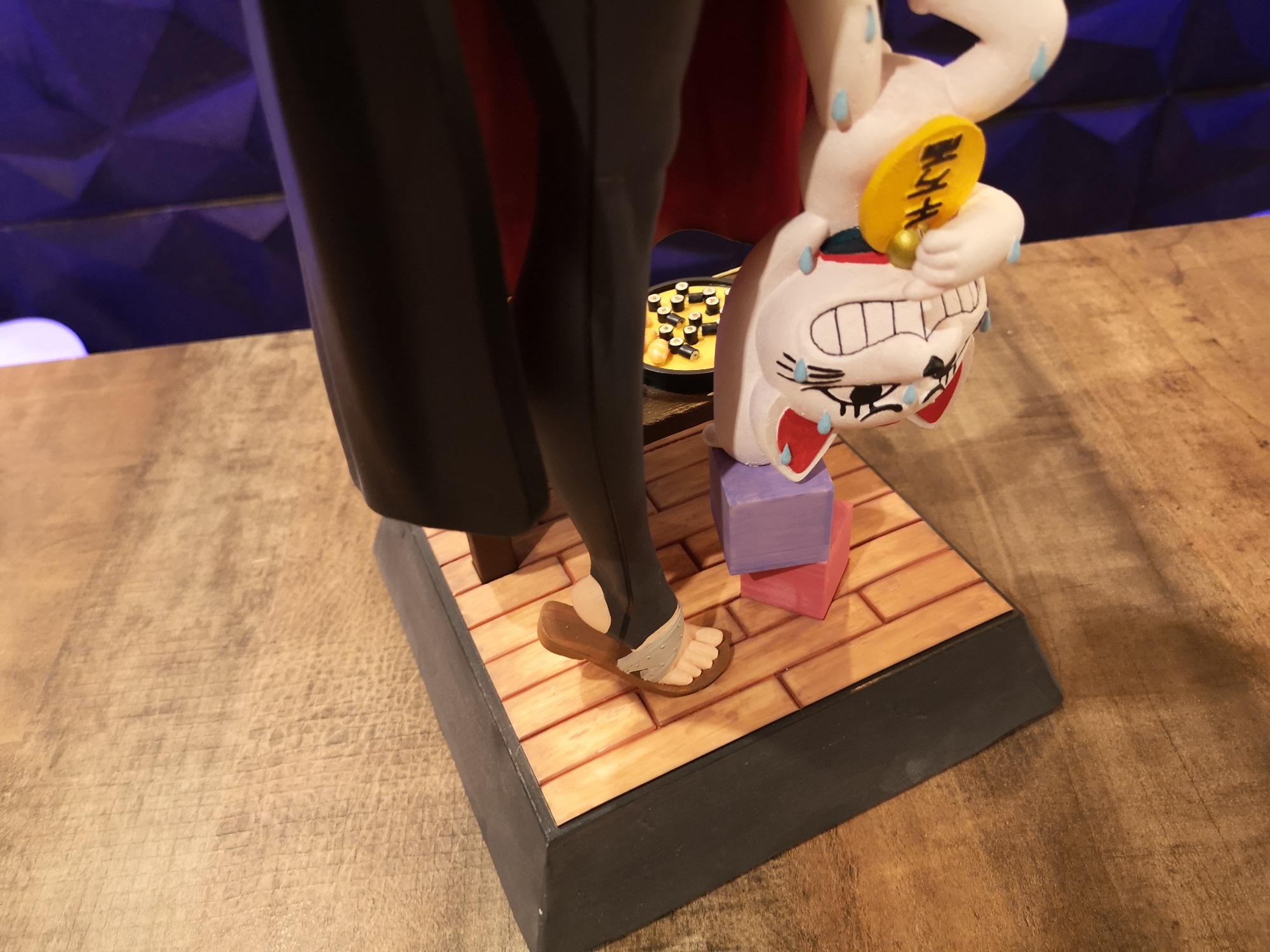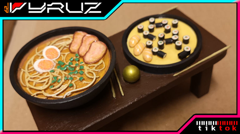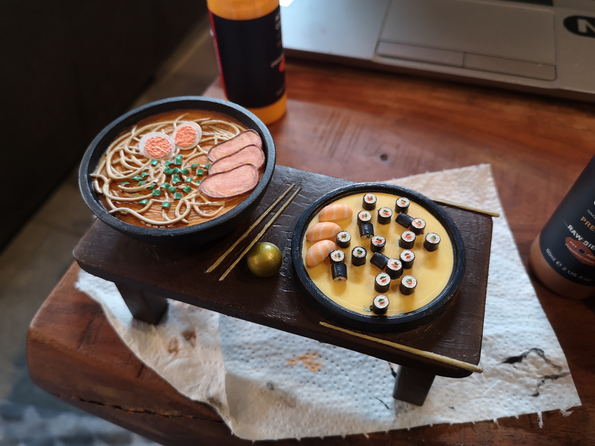 Nachdem alle Komponenten bemalt wurden, habe ich sie mit Sekundenkleber verbunden. Hier musste ich den ein oder anderen Verbund-Keil etwas anpassen, damit keine Spalte am Verbund entstehen. Den Sockel noch fix mit Wischtechnik coloriert um die Holzdielen-Optik hin zu bekommen. Die letzte Hürde war der Tisch mit Ramen und Sushi-Platte. Der Detailgrad ist sehr hoch und alles ein Teil, heißt ungewollte Farbtupferl sind vorprogrammiert. Zudem ist eine realistische Darstellung von Fleisch und der Brühe gar nicht so leicht. Das Ergebnis doch sehr zufriedenstellend geworden. Verläufe habe ich mit einem feuchten Wattestäbchen auf der mit den Markern aufgetragenen Farbe realisiert, diese dadurch etwas weicher gestaltet. Um alles zu fixieren und noch etwas Tiefe zu erreichen, habe ich alles noch mit Seiden-Matt Acryl Klarlack besprüht. Gerade die Maschen im Strickpulli oder die einzelnen Zutaten der Speisen kommt dann noch realistischer rüber.