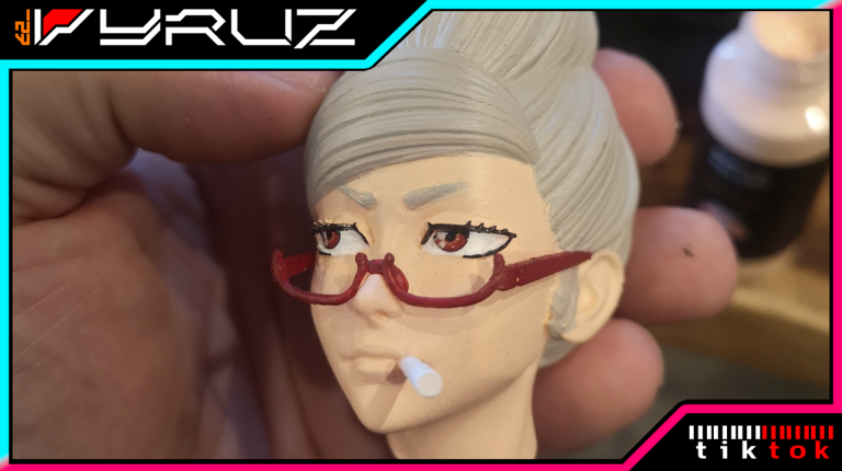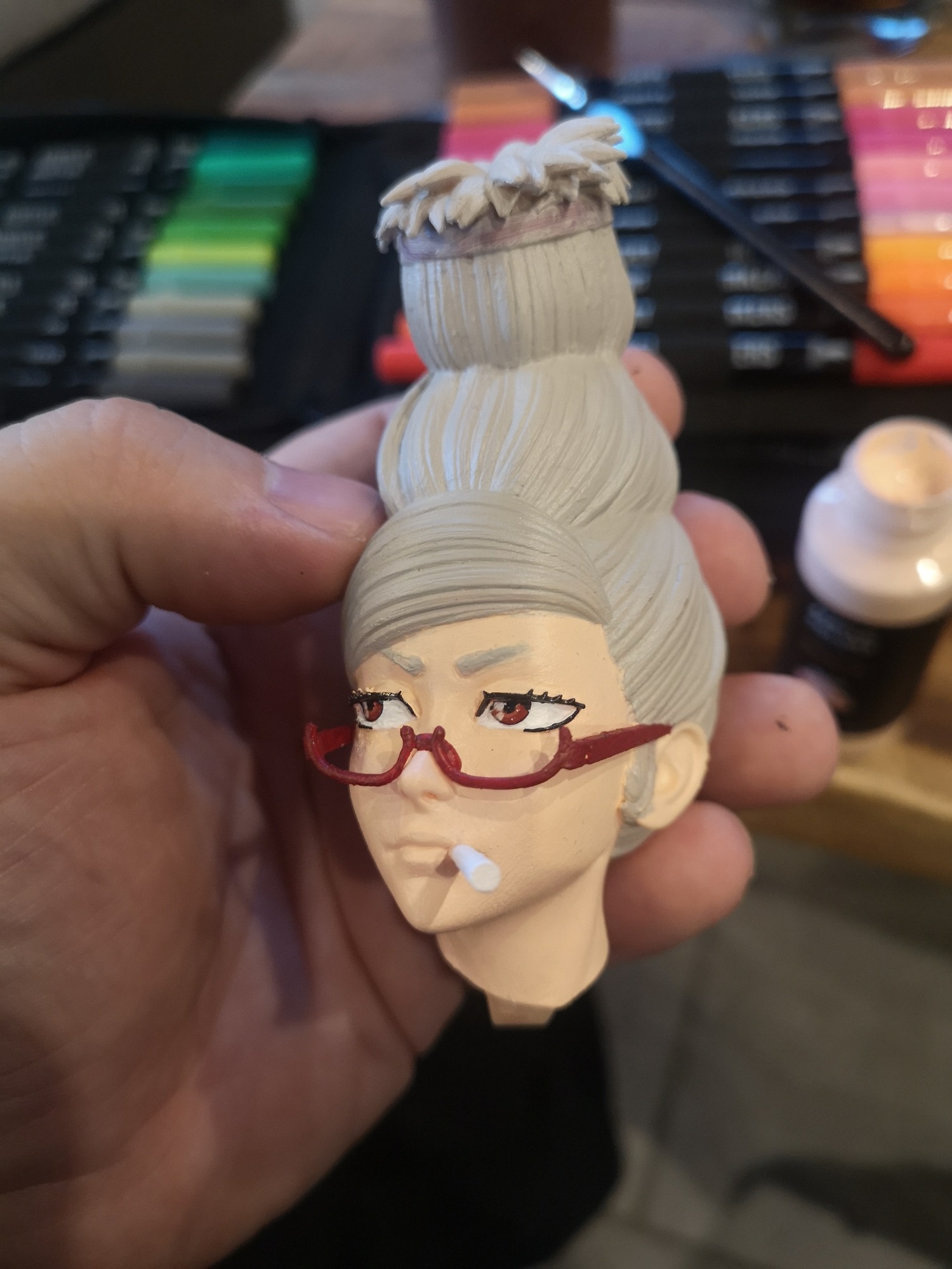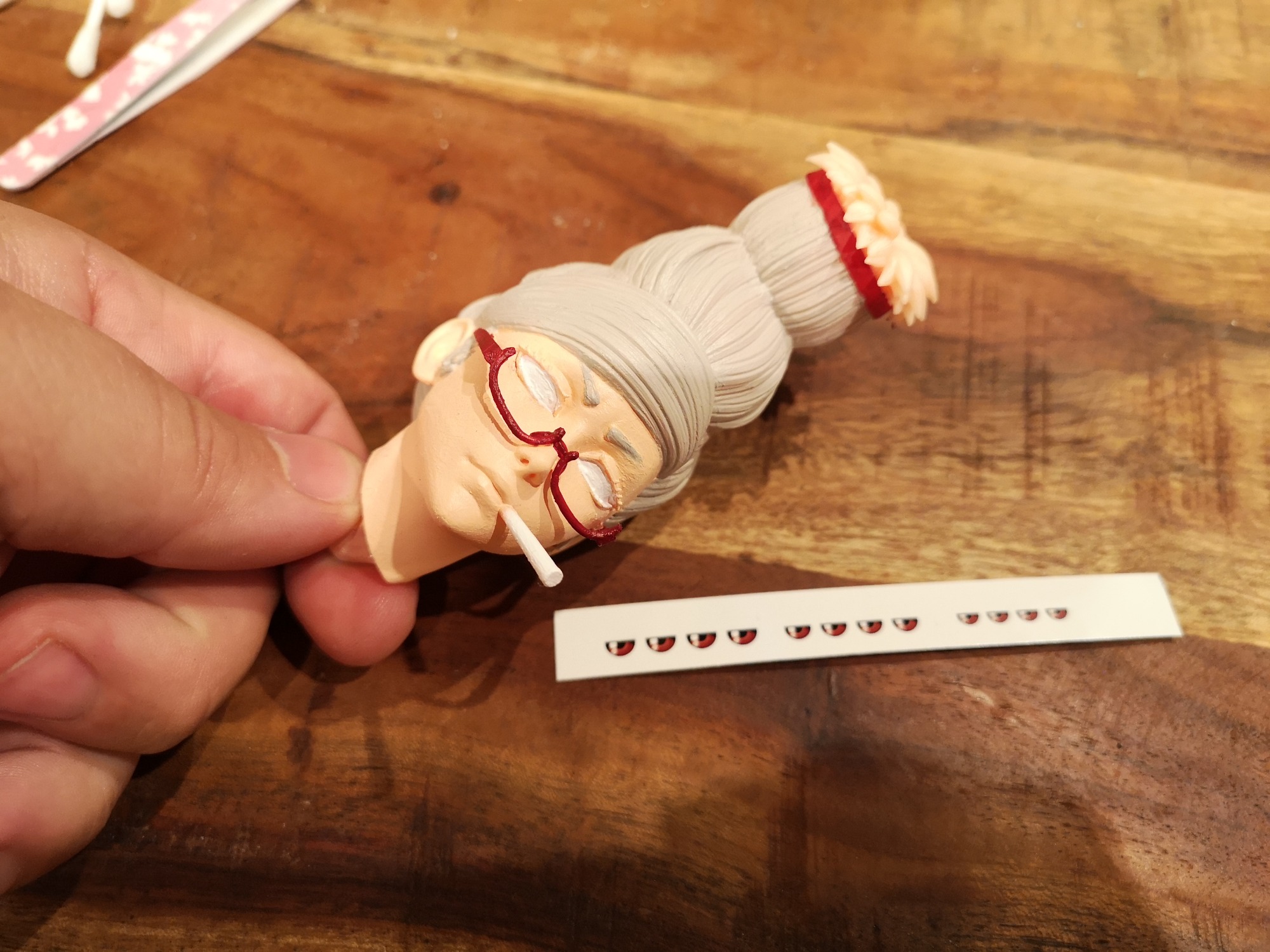 Gerade das Auftragen der Augenschminke und Lippenfarbe ist mit den Markern super machbar! Das Ergebnis stimmt mich doch zufrieden. Größte Hürde bei Anime Figuren sind bei mir immer die Augen. Wie soll man die malen, symmetrisch und akkurat. Da kam mir die Idee der Wasserschiebe-Folie. Die gibt es für Laser- und Inkjet-Drucker. Habe per Laser dann die Pupillen gedruckt und auf weiß gemalte Augen aufgetragen und siehe da, perfekt! Bei der Laser Variante muss man die Folie nach dem Drucken nicht mit Klarlack fixieren, da Laser-Toner wasserfest ist. Das Projekt nimmt Fahrt auf und wird echt was! Da am Ende alles mit einer Schicht Acryl-Klarlack versiegelt wird, ist keine weitere Bearbeitung von Nöten.