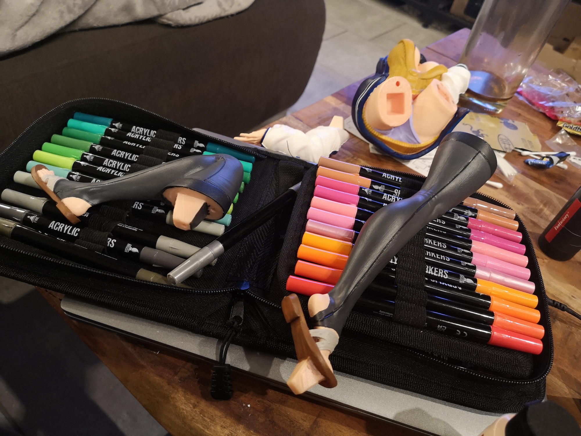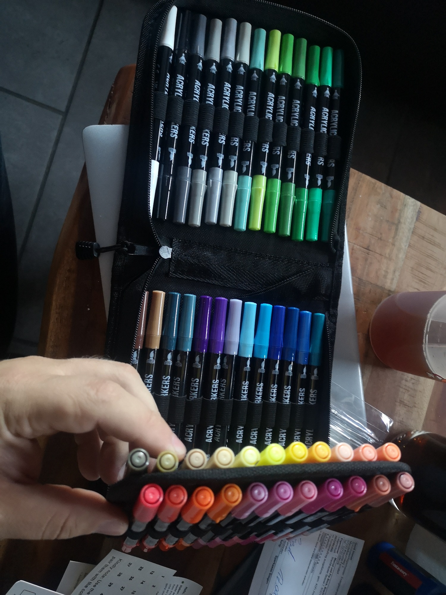 Große glatte Flächen oder Haut lassen sich nur mit vielen Durchgängen sauber darstellen, da zu sehr verdünnt die Deckkraft leidet und zu dick die Pinselstruktur durchkommt. Ist schon Arbeit, da ich auch ein Händchen dafür habe immer mit ner Borste oder bei zu viel Schwung eine Nachbarfläche zu tuschieren und muss die dann wieder ausbessern. Der Kollege wird den Weg über Airbrush versuchen, ich bin gespannt! Zum Glück habe ich mir noch kurzfristig ein Acryl-Marker Set bestellt für einen schmalen Euronen und ultra feine Pinsel. Gamechanger!