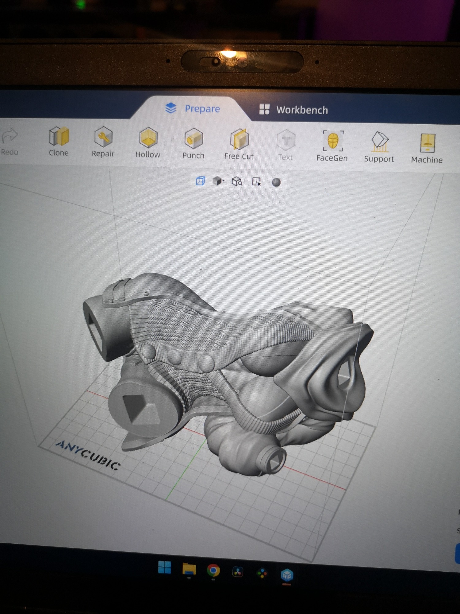 Dateien begutachtet und entschieden, wir können größer! Original ist in 1:6 ausgelegt. Mein Drucker schafft bei Teilung des Capes jedoch auch 1:4. Also 150% Scale. Super, das wird Richtwert. Also getüftelt, ausgerichtet, verschachtelt und losgedruckt... Doch was ist das, kein Druck... Nach einigem Testen die Erkenntnis, Display defekt, nach 2,5 Jahren... Neues Display nur noch über Retailer für 150 € + Versand. Neuer aktueller Drucker inkl. Versand 289 €. Also "leider" ein Neukauf. Doch der hat sich gelohnt! Die Qualität saust von 6k Auflösung auf ganze 14k hoch, das Druckvolumen steigt an, also mehr Platz und die Geschwindigkeit hat sich mehr als verdoppelt!