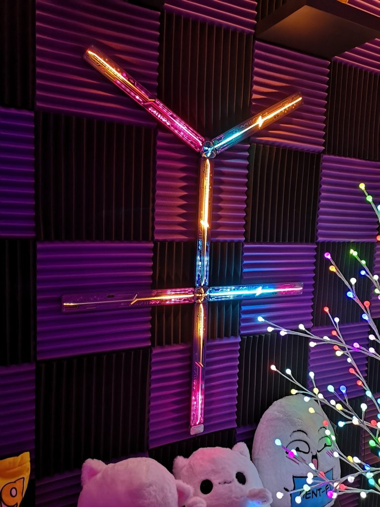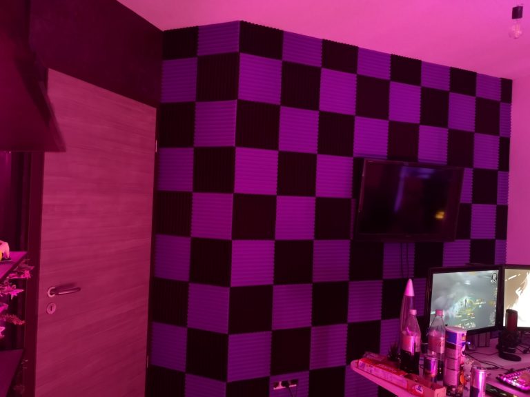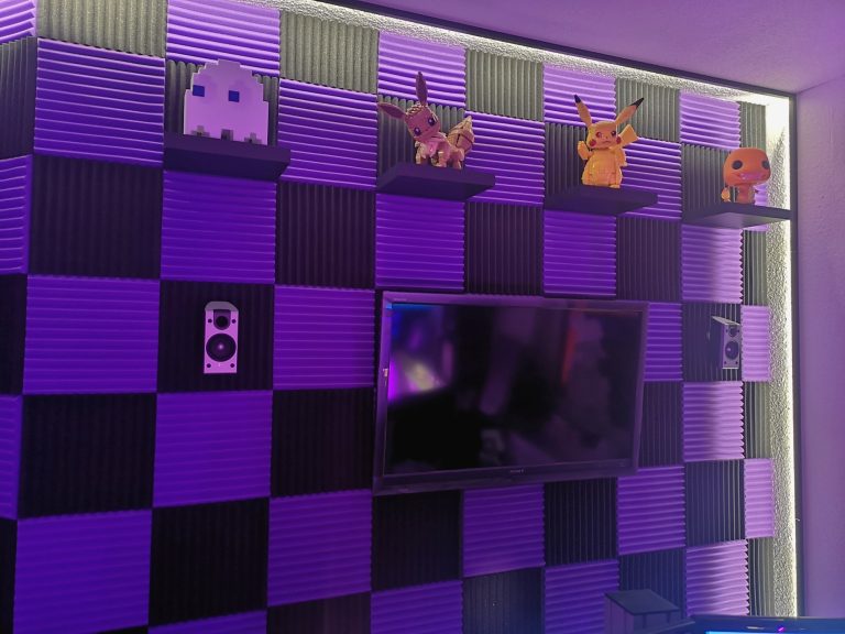 Mit solch einer Wand ergeben sich, außer der besseren Akustik, gerade wenn man viel redet im Stream, auch noch weitere Vorteile. So könnt ihr problemlos einzelne Fliesen wieder abreißen und zuschneiden, z.B. für Regalböden. Noch viel vorteilhafter ist aber das Verstecken von Kabeln. Solltet ihr irgendwas an der Wand platzieren, wo das Kabel dann Richtung Boden oder sonst wohin gelangen soll, könnt ihr dieses einfach in die Schnittpunkte der Fliesenübergänge drücken, leicht unter eine der Fliesen schieben und fertig, kein Kabel mehr sichtbar. Beleuchtet ihr die Wand nun noch flach von der Seite, kommt die Struktur mehr zur Geltung und wird ein wahrer Hingucker. Preislich ist solch eine Wand auch gut im Budget. Nehmt ihr, wie ich hier, eine nicht allzu dicke Variante und ein großes Paket, ist es nicht viel teurer wie eine Muster-Tapete. Bezogen habe ich über Amazon bei einem der China Anbieter, günstig aber lange Lieferzeit. Die Wand hat inzwischen über die 2 Jahre schon einige Neudekorationen hinter sich, von TV-Halterung, über Lochblechmodul, bis hin zur aktuellen Govee-Evangelion-Leuchte und 2-Farben-Wandregalen.