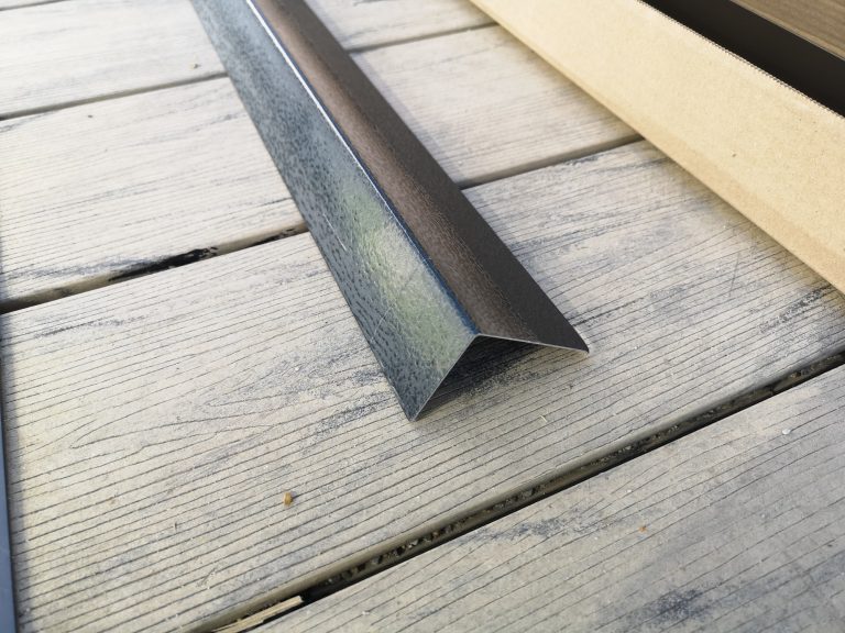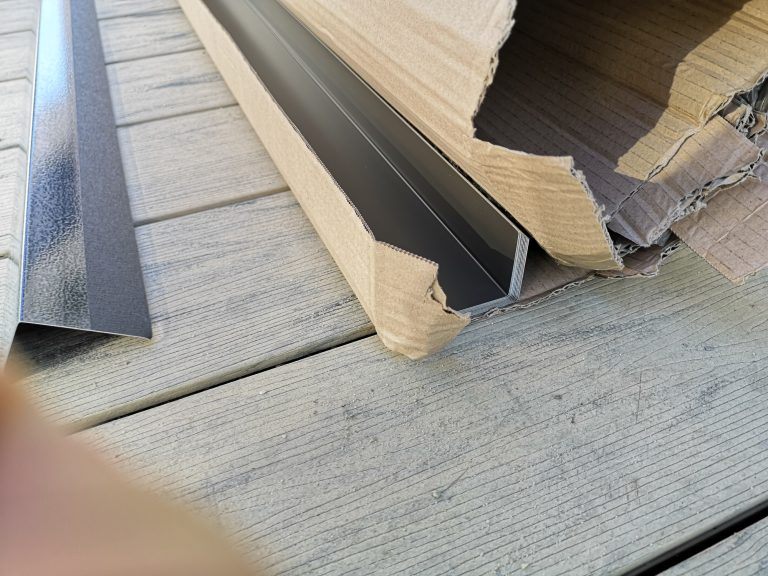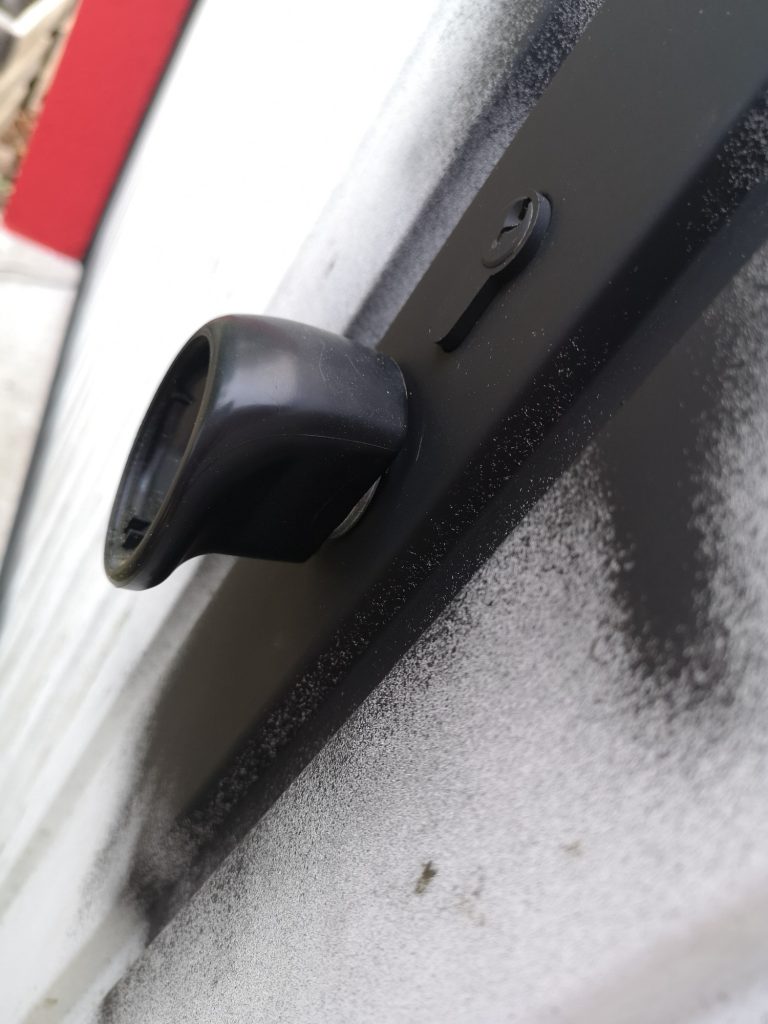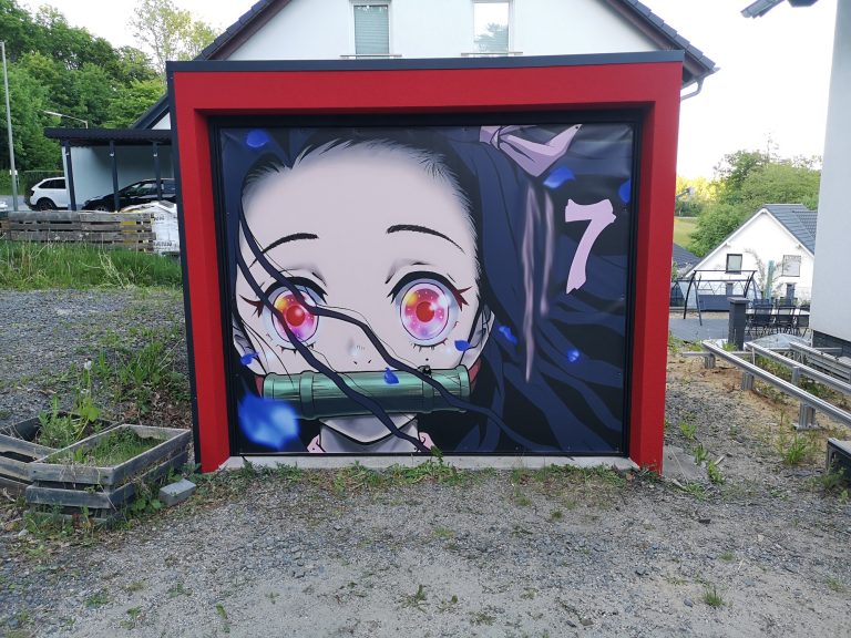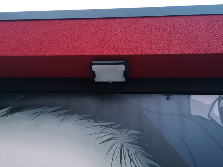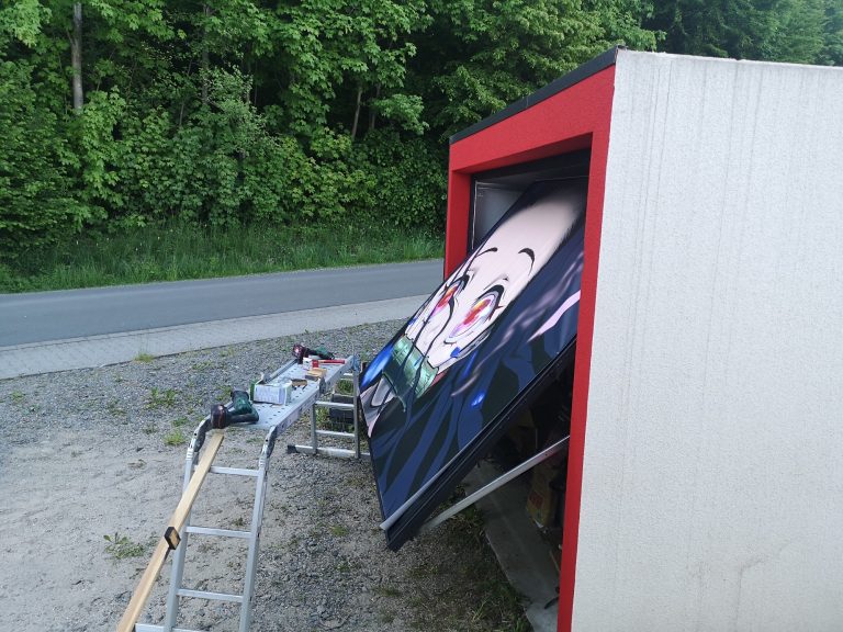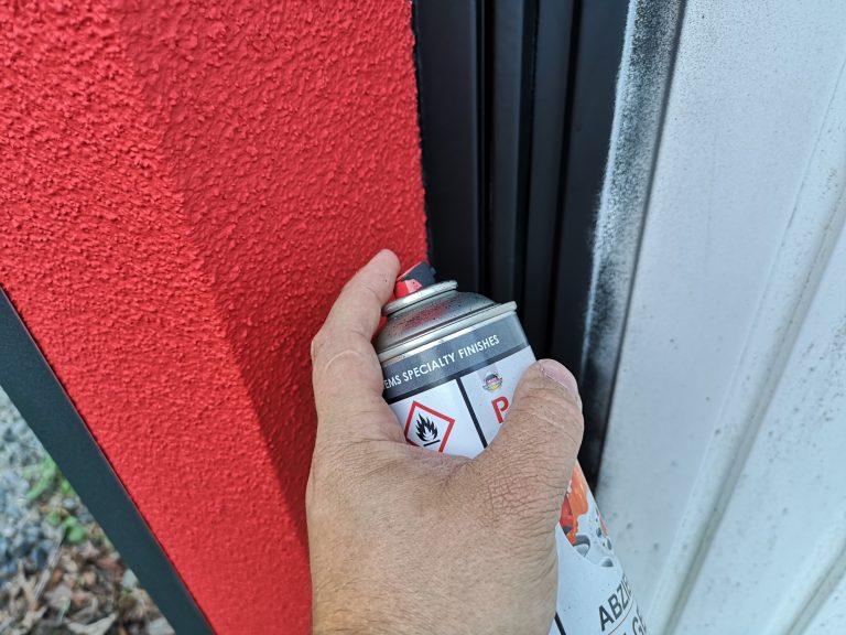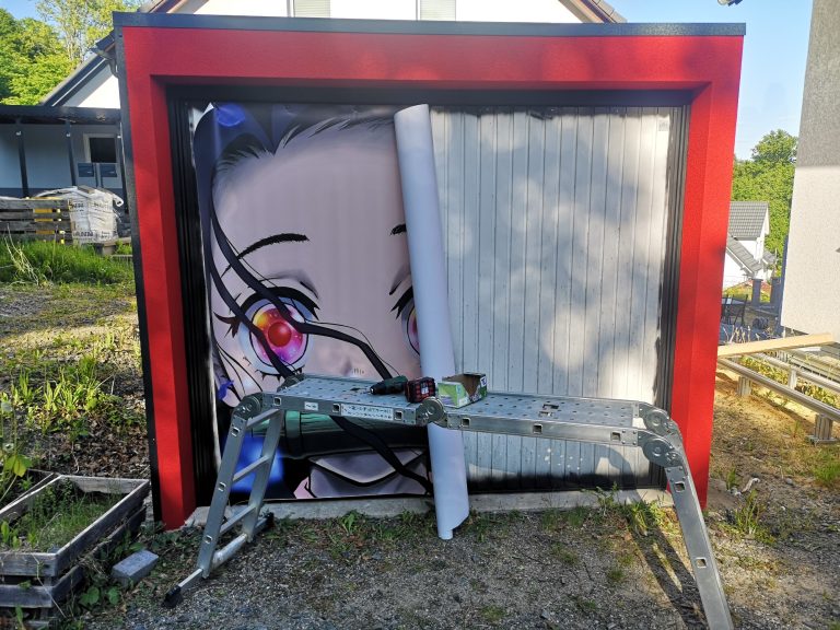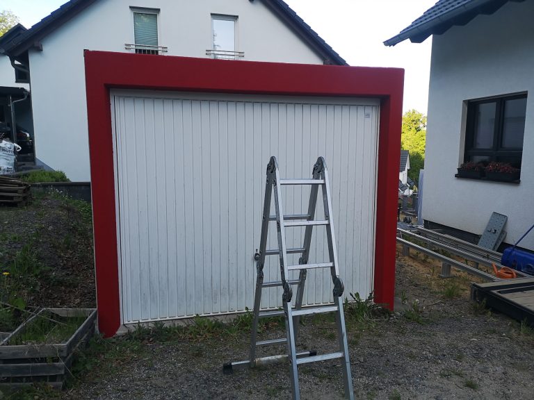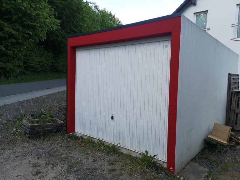 Die Verschraubung verläuft umlaufend alle 50 cm, 3 cm vom Außen-Rand der Garage, heißt die Plane steht etwas im Freien am Rand. Sie wird sich da dann unschön wölben etc. Um das zu verhindern und dass nicht immer Regen hinter die Plane fließt, habe ich Alu-Profile in Anthrazit (40 x 60 mm) angebracht, um die Kante oben sauber abzuschließen. Optisch macht sich das ganze als Konturlinie schon was her. Die Fassade um das Tor herum habe ich mit angemischter, roter Fassadenfarbe gestrichen und das Tor im umlaufenden Bereich mit schwarzer Sprüh-Folie beschichtet.