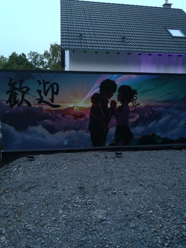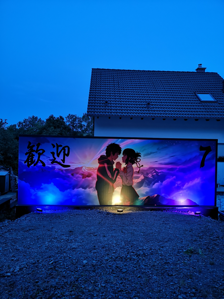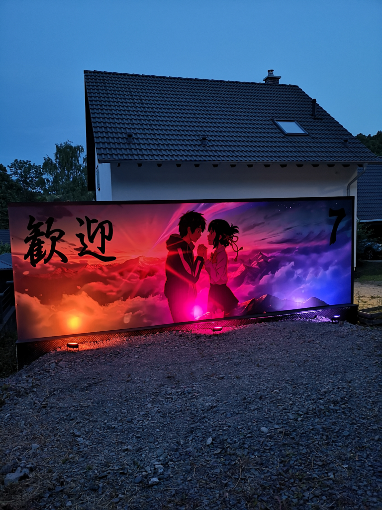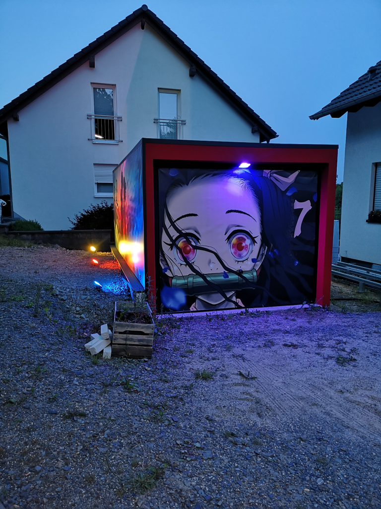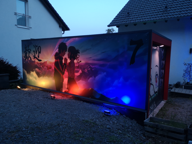 Ich konnte einfach nicht anders... Die Farben der Motive sind tagsüber so prächtig, die Nacht durfte da nicht vernachlässigt werden. Also ein Angebot bei Govee abgewartet und deren 4er RGBW Fluter Set bestellt. Ein paar Änderungen und Verlängerungen an den Kabeln waren nötig, hier etwas Strom legen, da etwas bohren und tadaaa... Ein Traum, das erste mal im Dunkeln eingeschaltet und WOW!! Die Szene mit den Wolken und der Himmel, die bunte Beleuchtung gibt dem ganzen Motiv nochmal richtig Tiefe. Würde jetzt noch die passende Musik laufen, Tränen wären garantiert! Dies wertet das ganze Projekt nochmals drastisch auf. Zudem habe ich noch mit einer dicken Ladung Schotter das Loch zwischen Garage und der Fläche davor aufgefüllt mit 2 Lagen 60er Styropor dazwischen, welches ich noch über hatte. Auf dem Styropor noch 2 anthrazit WPC Dielen geklebt als sauberen Abschluss. Auch noch Reste à 3 m Länge, also genau passend zur 6 m Garage.