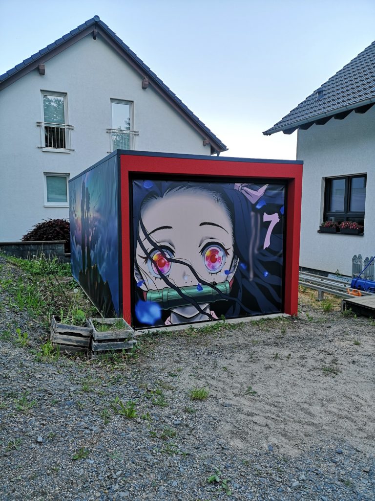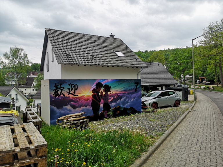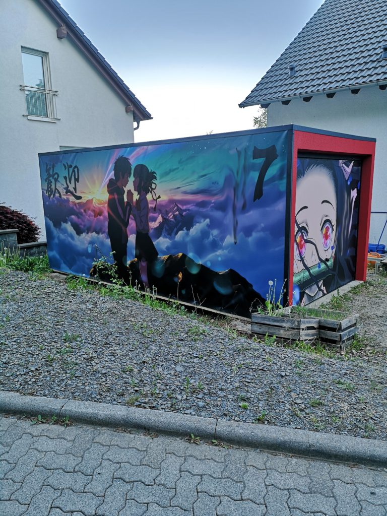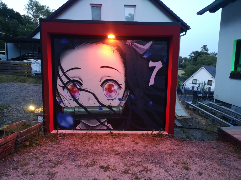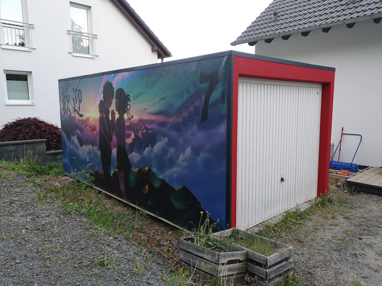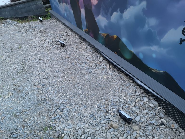 Ich konnte einfach nicht anders... Die Farben der Motive sind tagsüber so prächtig, die Nacht durfte da nicht vernachlässigt werden. Also ein Angebot bei Govee abgewartet und deren 4er RGBW Fluter Set bestellt. Ein paar Änderungen und Verlängerungen an den Kabeln waren nötig, hier etwas Strom legen, da etwas bohren und tadaaa... Ein Traum, das erste mal im Dunkeln eingeschaltet und WOW!! Die Szene mit den Wolken und der Himmel, die bunte Beleuchtung gibt dem ganzen Motiv nochmal richtig Tiefe. Würde jetzt noch die passende Musik laufen, Tränen wären garantiert! Dies wertet das ganze Projekt nochmals drastisch auf. Zudem habe ich noch mit einer dicken Ladung Schotter das Loch zwischen Garage und der Fläche davor aufgefüllt mit 2 Lagen 60er Styropor dazwischen, welches ich noch über hatte. Auf dem Styropor noch 2 anthrazit WPC Dielen geklebt als sauberen Abschluss. Auch noch Reste à 3 m Länge, also genau passend zur 6 m Garage.
