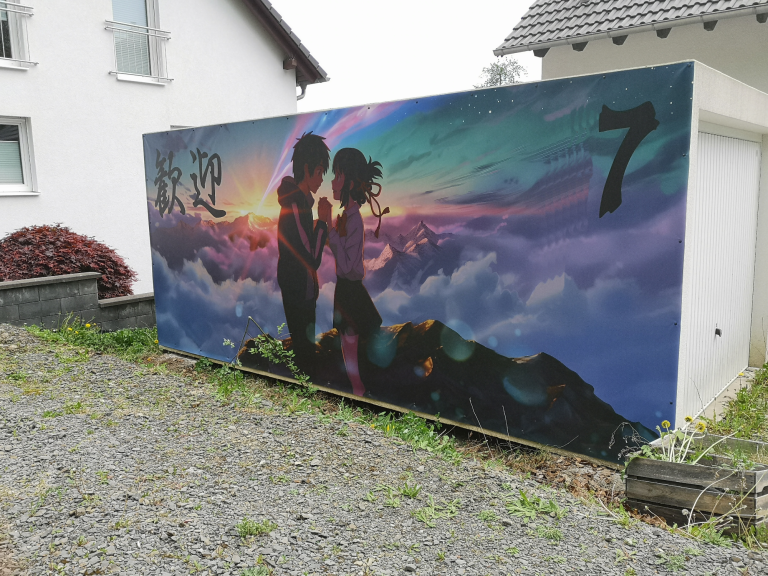 Holz kann man sich nicht leisten als Spass den ich selbst nie sehe, außer ich fahre nach Feierabend zuhause vor. Zudem ist es wartungsintensiv, gerade an dieser Stelle... Verkleiden wie den Sockel am Haus? Zu teuer..., verklinkern? Zu teuer..., oder langweilig? Ach alles Mist! Also back to the roots, Digitaldruck, Plane? Zu teuer... oder??? Geguckt und gedruckt... 600 x 250 cm für 125 € inkl. Versand??? Alles gut, her damit. Nächste Challenge, Befestigung. Normalerweise spannt man solch ein Material in einen Rahmen mit gummibandartigen Spannern.