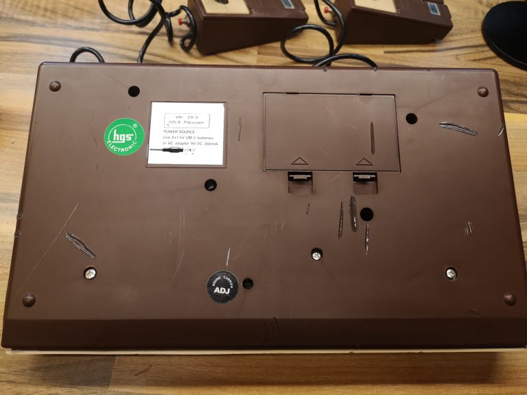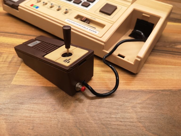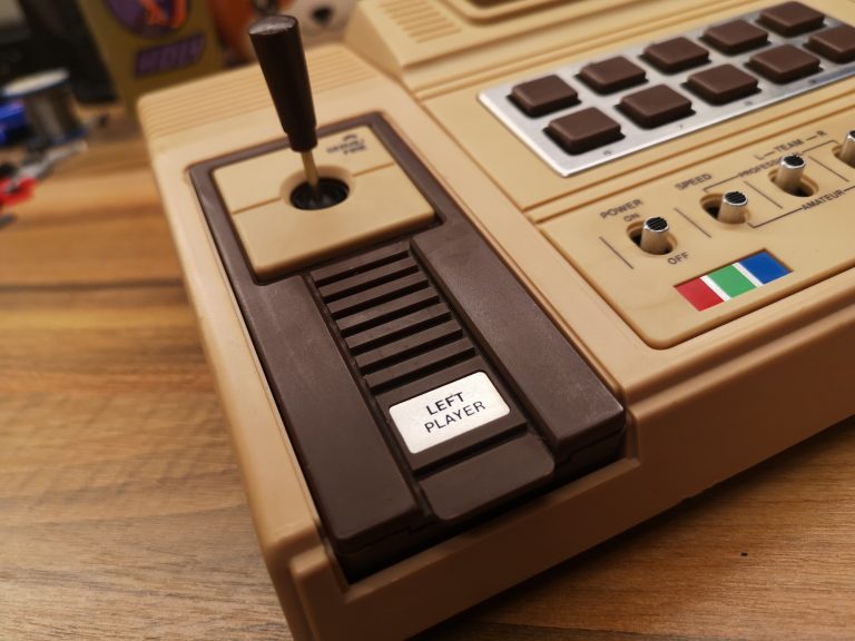 Mit den beiden Joystick Controllern mit Action Button war der Eingabe schonmal ein breites Feld eröffnet. Dadurch war man nicht nur auf eine Dimension beschränkt, sondern konnte 2D steuern. Die Controller konnten aber leider nicht abgenommen werden, sie waren fest verkabelt und wurden wie bei den reinen Pong Brüdern in der Konsole verstaut. Der Anschluss an den Fernseher erfolgt üblich über ein fest montiertes Antennenkabel. Dieses habe ich durch eine Cinch-Buchse ersetzt um sie angenehmer handeln zu können. Mit einem Cinch-RF Kabel kann sie dann am TV angeschlossen werden. Die Konsole selbst bietet noch einen Lautstärkeregler für den internen Lautsprecher und 10 Funktionstasten, die dem jeweiligen Spiel zugeordnet, dann Einstellungen ermöglichen. Ein großer Reset-Button setzt das Spiel zurück, sowie einige übergreifende Settings wie Geschwindigkeit und Schwierigkeitsgrad können über kleine Schalter eingestellt werden.