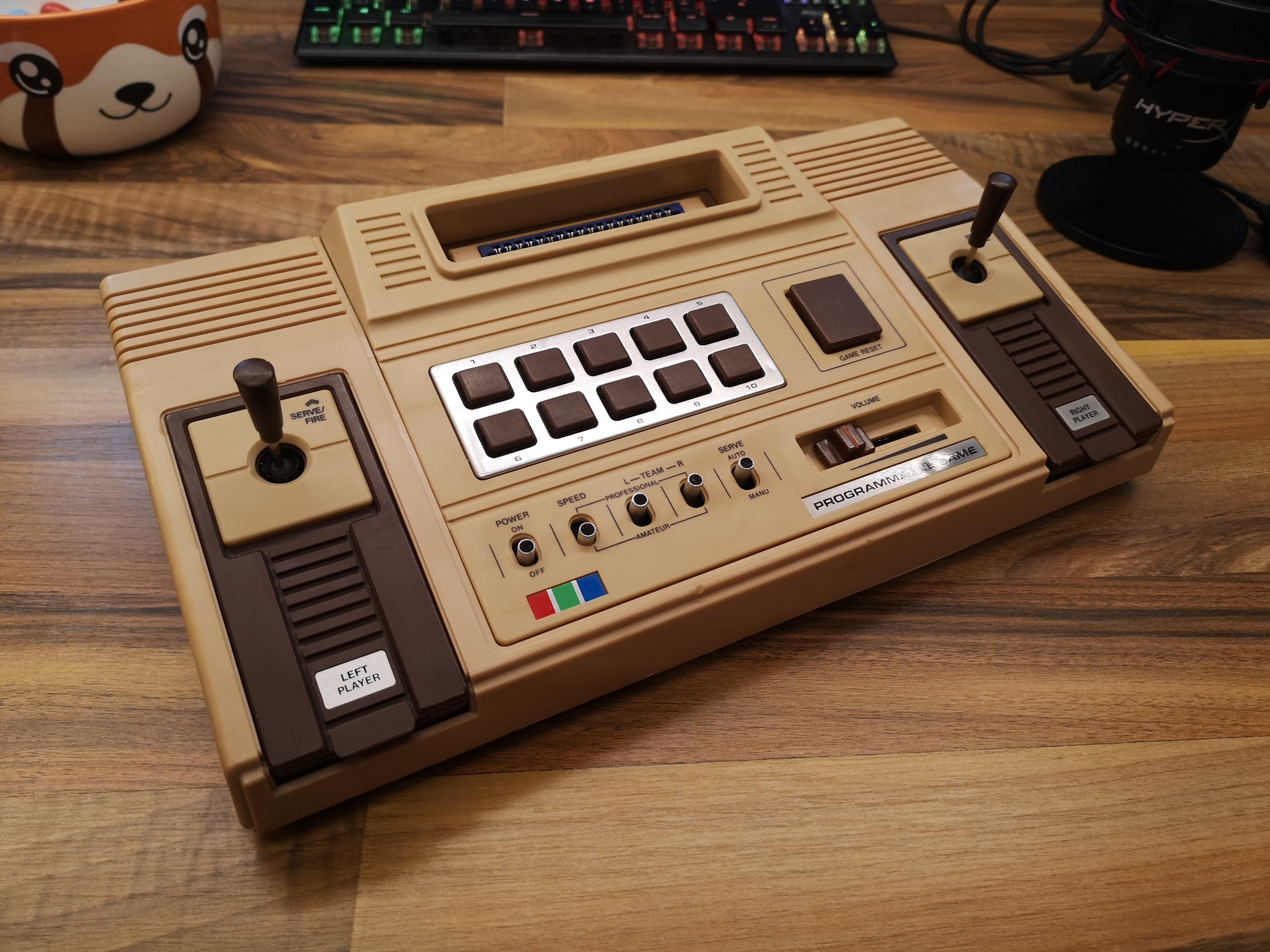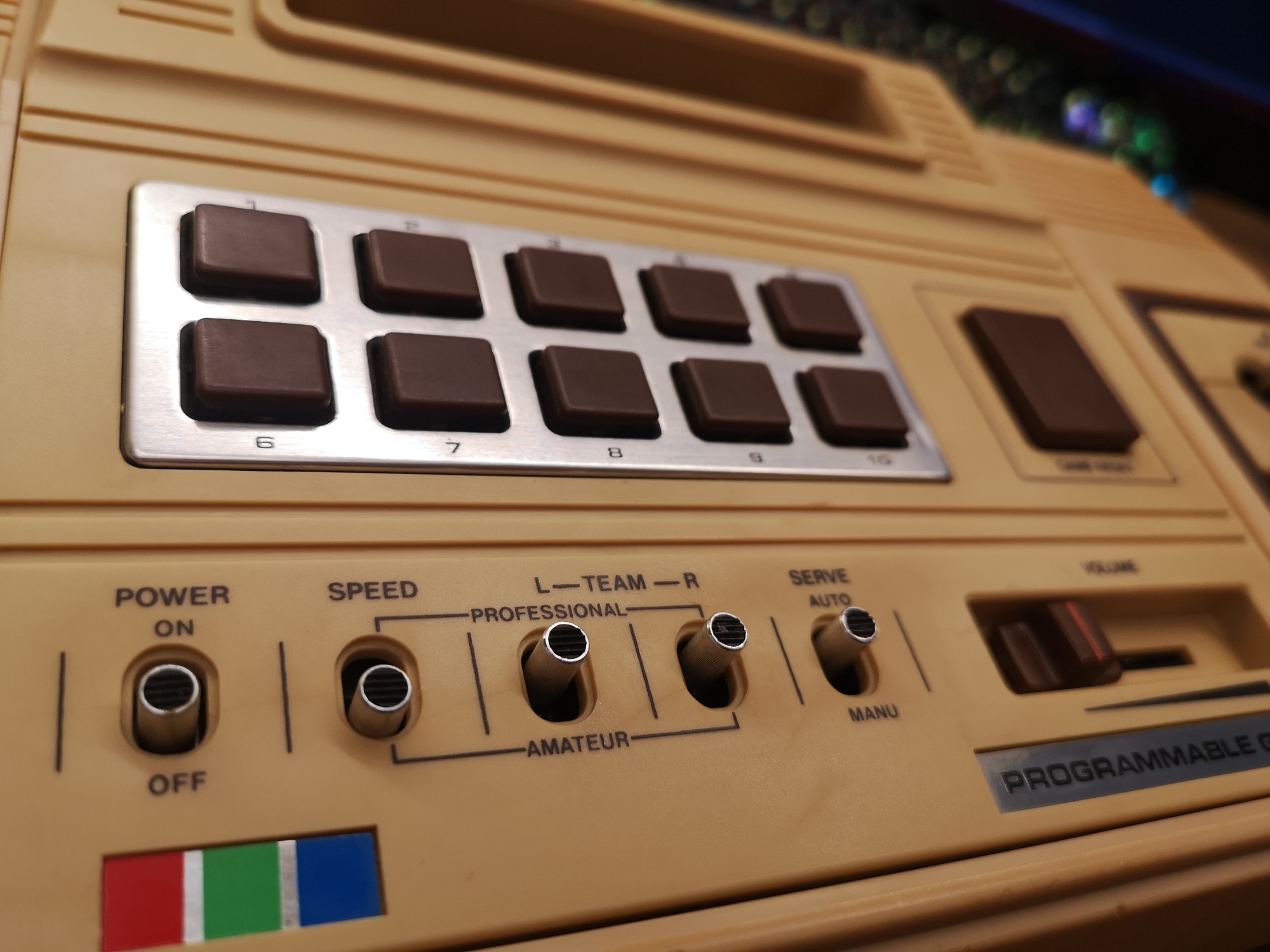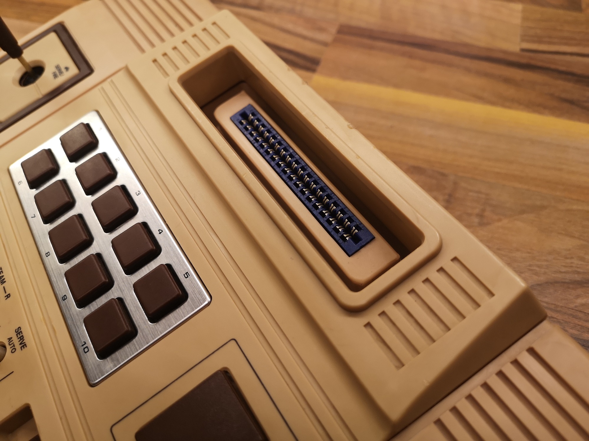 Mit den beiden Joystick Controllern mit Action Button war der Eingabe schonmal ein breites Feld eröffnet. Dadurch war man nicht nur auf eine Dimension beschränkt, sondern konnte 2D steuern. Die Controller konnten aber leider nicht abgenommen werden, sie waren fest verkabelt und wurden wie bei den reinen Pong Brüdern in der Konsole verstaut. Der Anschluss an den Fernseher erfolgt üblich über ein fest montiertes Antennenkabel. Dieses habe ich durch eine Cinch-Buchse ersetzt um sie angenehmer handeln zu können. Mit einem Cinch-RF Kabel kann sie dann am TV angeschlossen werden. Die Konsole selbst bietet noch einen Lautstärkeregler für den internen Lautsprecher und 10 Funktionstasten, die dem jeweiligen Spiel zugeordnet, dann Einstellungen ermöglichen. Ein großer Reset-Button setzt das Spiel zurück, sowie einige übergreifende Settings wie Geschwindigkeit und Schwierigkeitsgrad können über kleine Schalter eingestellt werden.