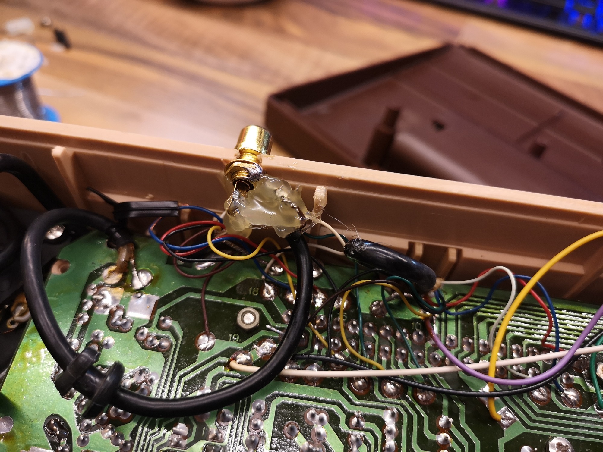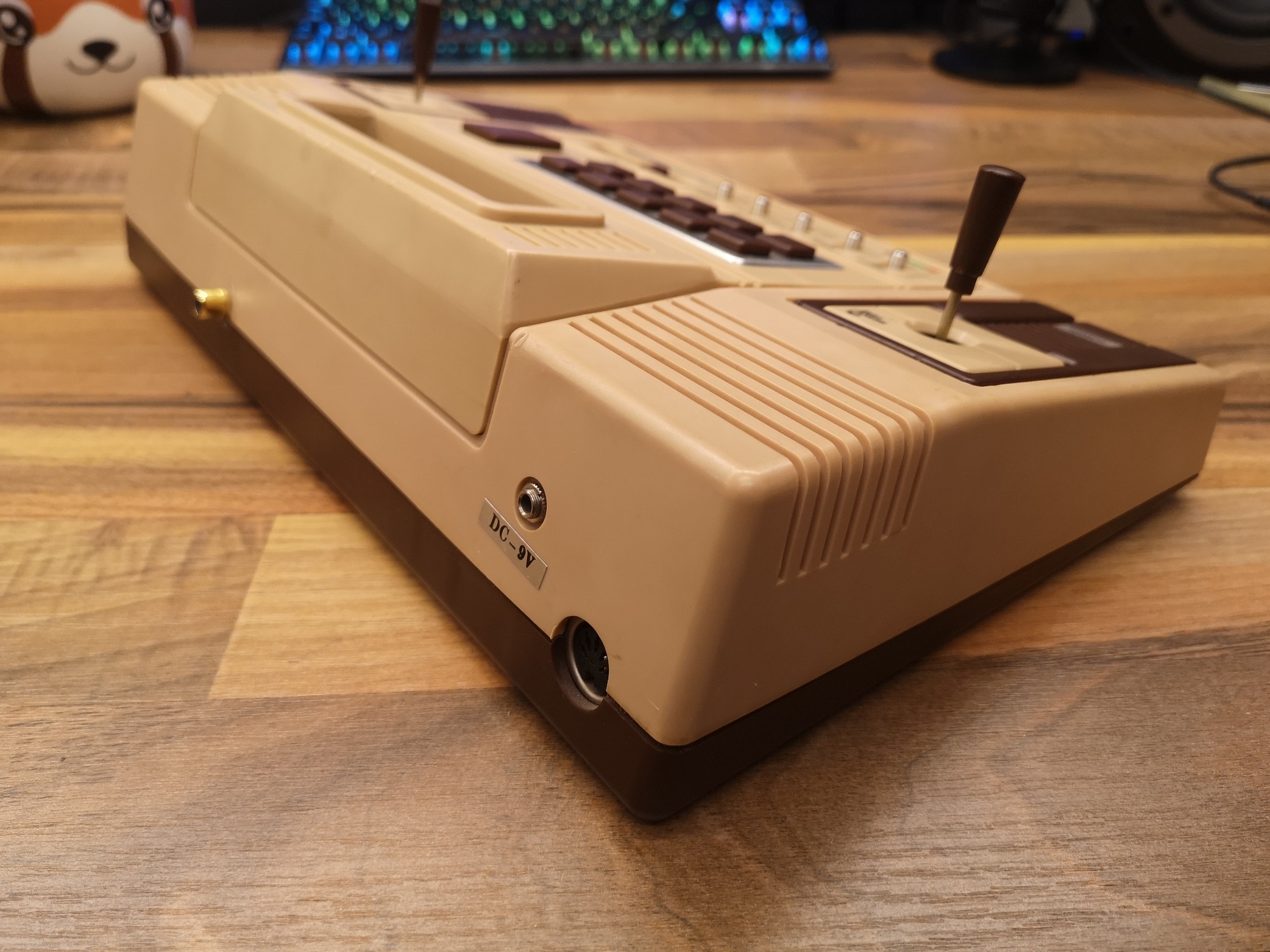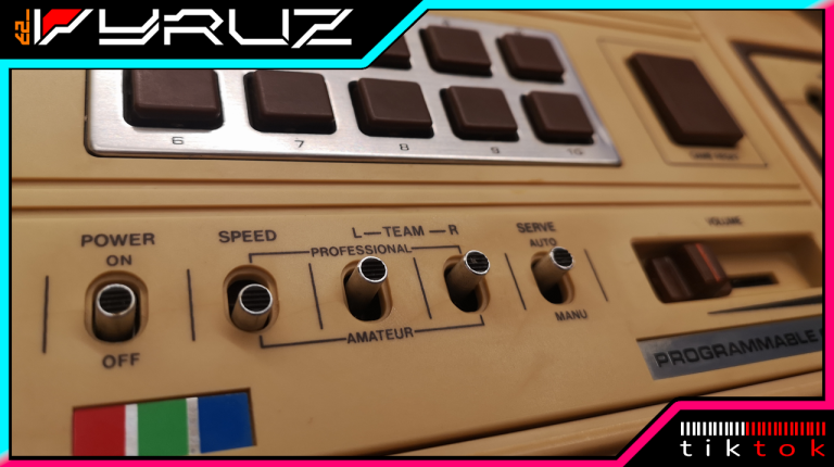 Mit den beiden Joystick Controllern mit Action Button war der Eingabe schonmal ein breites Feld eröffnet. Dadurch war man nicht nur auf eine Dimension beschränkt, sondern konnte 2D steuern. Die Controller konnten aber leider nicht abgenommen werden, sie waren fest verkabelt und wurden wie bei den reinen Pong Brüdern in der Konsole verstaut. Der Anschluss an den Fernseher erfolgt üblich über ein fest montiertes Antennenkabel. Dieses habe ich durch eine Cinch-Buchse ersetzt um sie angenehmer handeln zu können. Mit einem Cinch-RF Kabel kann sie dann am TV angeschlossen werden. Die Konsole selbst bietet noch einen Lautstärkeregler für den internen Lautsprecher und 10 Funktionstasten, die dem jeweiligen Spiel zugeordnet, dann Einstellungen ermöglichen. Ein großer Reset-Button setzt das Spiel zurück, sowie einige übergreifende Settings wie Geschwindigkeit und Schwierigkeitsgrad können über kleine Schalter eingestellt werden.
