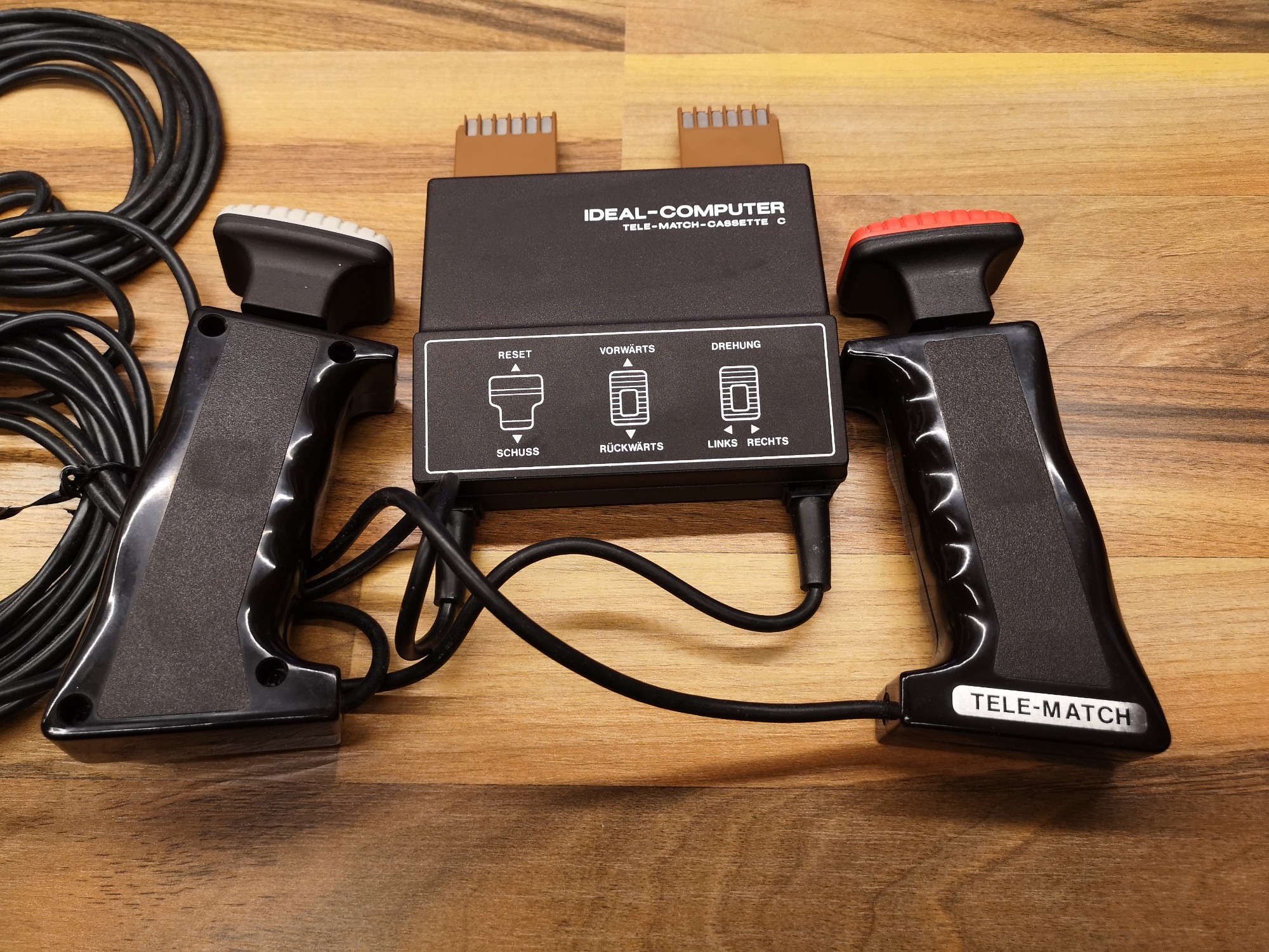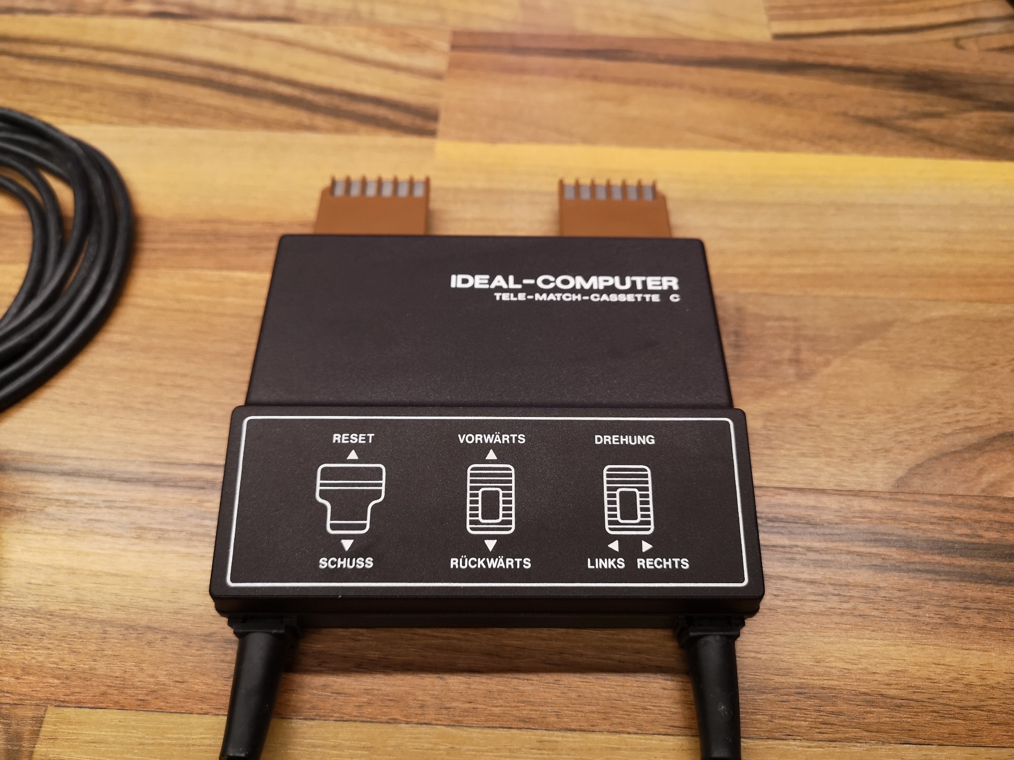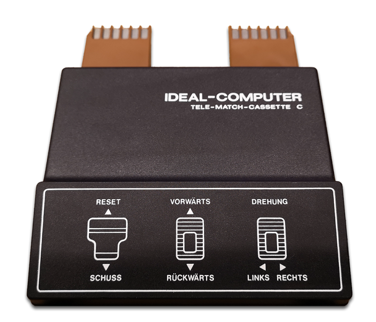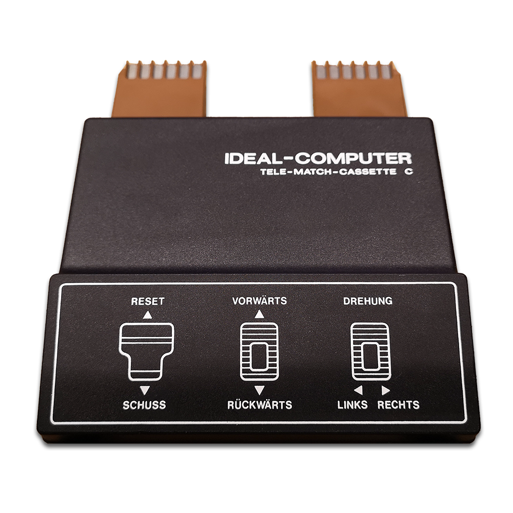 1977 brachte ITT Schaub-Lorenz mit der Ideal-Color TV-Reihe eine Möglichkeit auf den Markt, seinen Fernseher mit Modulen zu erweitern. Durch das entfernen der Fernbedienung, welche eingesteckt im TV als Direktwahltasten fungierte, offenbarte sich ein Modul-Schacht. Dieses Konzept übernahmen auch andere deutsche Hersteller für ihre hochpreisigeren TV-Linien. Etablieren am Markt konnte sich diese Technologie jedoch nicht. Ideal-Computer war die Bezeichnung für Geräte dieses Anschlusses. Den Start machte Tele-Match-Cassette A mit den bekannten 4 Pong Games und dem General Instruments (GI) Chip. Es folgten ein Jahr später 3 weitere Cassetten, darunter das hier vorgestellte Panzerspiel als Tele-Match-Cassette C. Basis bildete der GI AY-3-8710. Der Anschluss geschieht direkt über die eigentliche Platine, welche mit der Kunststoffumhausung einen Stecker formt. 24-Pins standen somit zur Verfügung, auf jeder Seite 12. Einen internen Lautsprecher hatte die Konsole nicht.