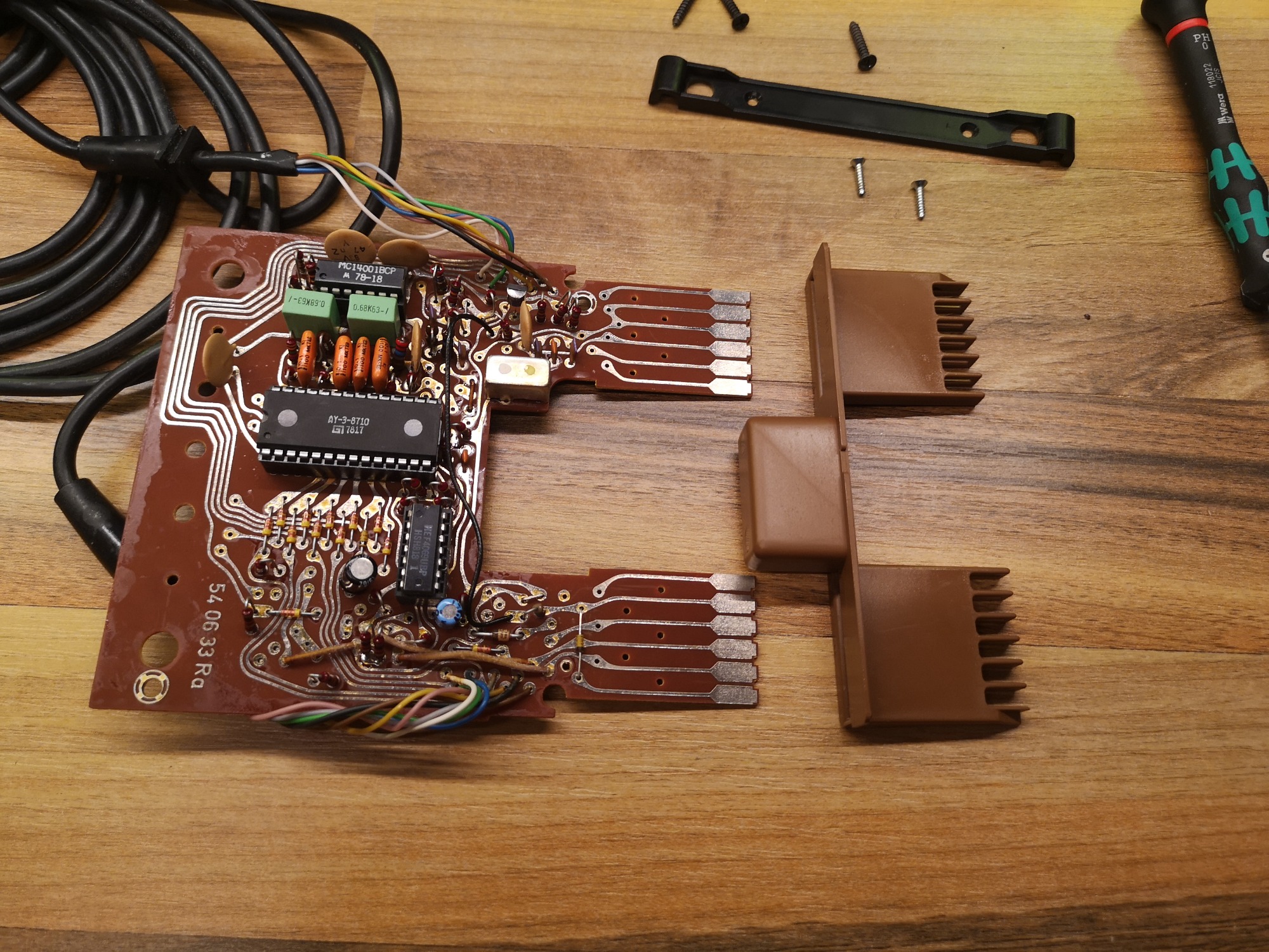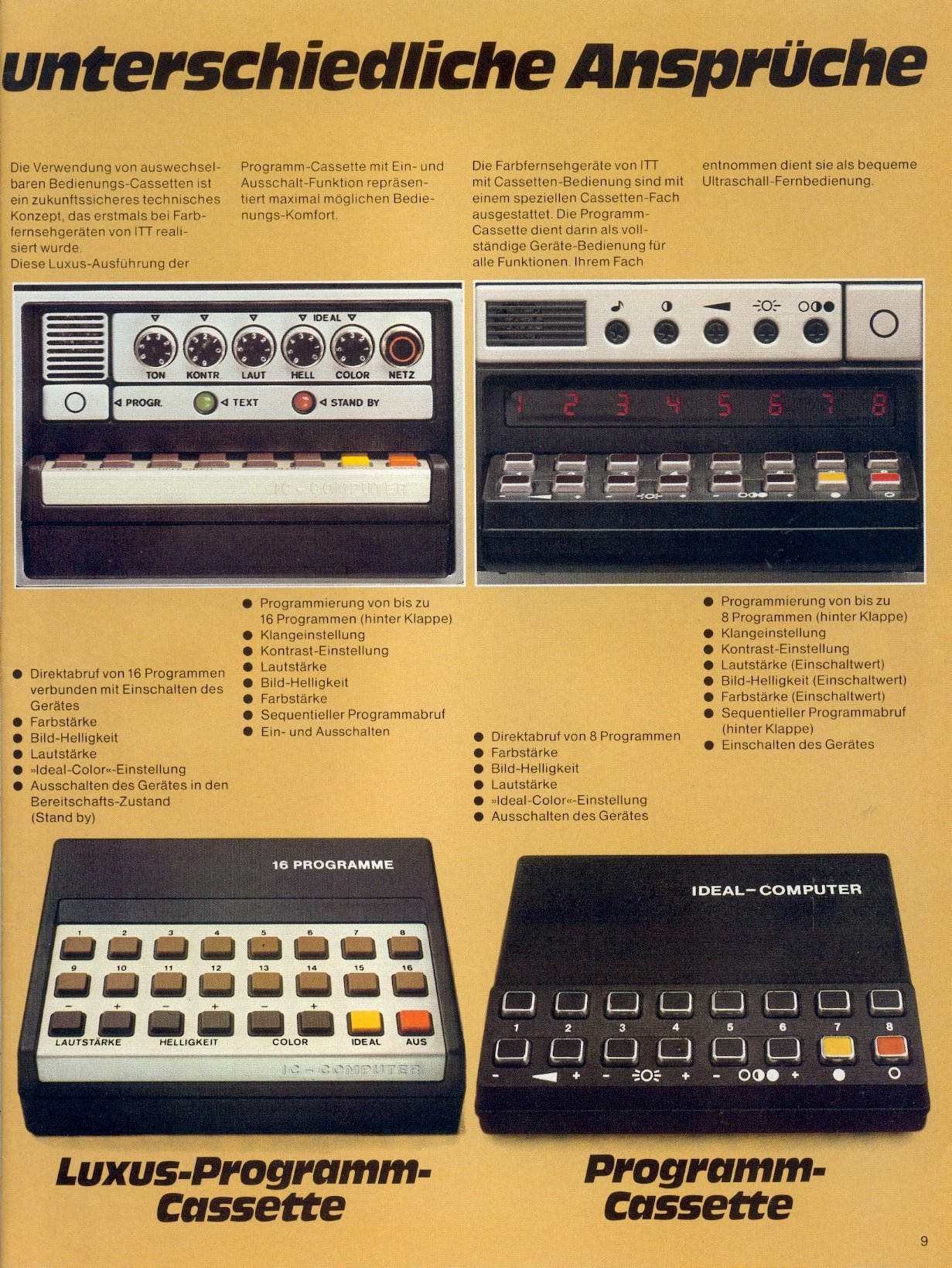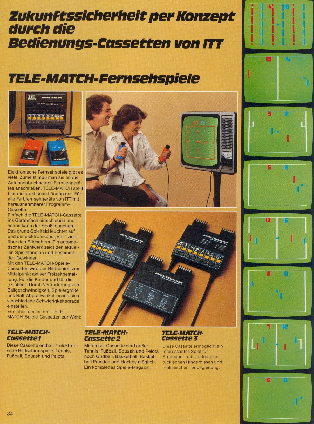1977 brachte ITT Schaub-Lorenz mit der Ideal-Color TV-Reihe eine Möglichkeit auf den Markt, seinen Fernseher mit Modulen zu erweitern. Durch das entfernen der Fernbedienung, welche eingesteckt im TV als Direktwahltasten fungierte, offenbarte sich ein Modul-Schacht. Dieses Konzept übernahmen auch andere deutsche Hersteller für ihre hochpreisigeren TV-Linien. Etablieren am Markt konnte sich diese Technologie jedoch nicht. Ideal-Computer war die Bezeichnung für Geräte dieses Anschlusses. Den Start machte Tele-Match-Cassette A mit den bekannten 4 Pong Games und dem General Instruments (GI) Chip. Es folgten ein Jahr später 3 weitere Cassetten, darunter das hier vorgestellte Panzerspiel als Tele-Match-Cassette C. Basis bildete der GI AY-3-8710. Der Anschluss geschieht direkt über die eigentliche Platine, welche mit der Kunststoffumhausung einen Stecker formt. 24-Pins standen somit zur Verfügung, auf jeder Seite 12. Einen internen Lautsprecher hatte die Konsole nicht.