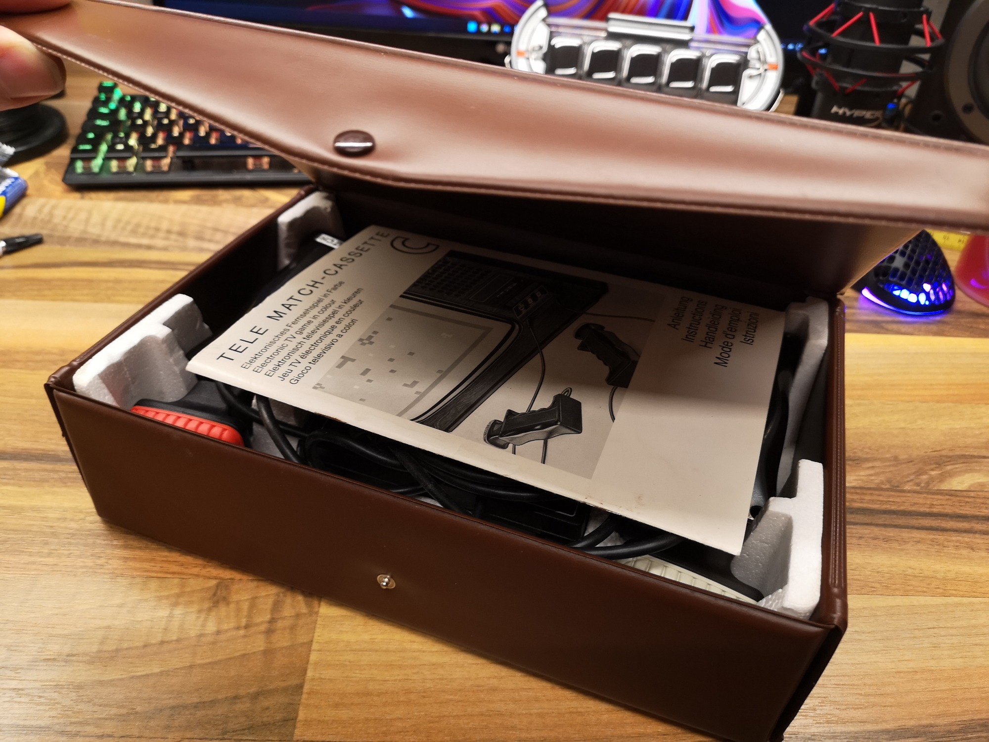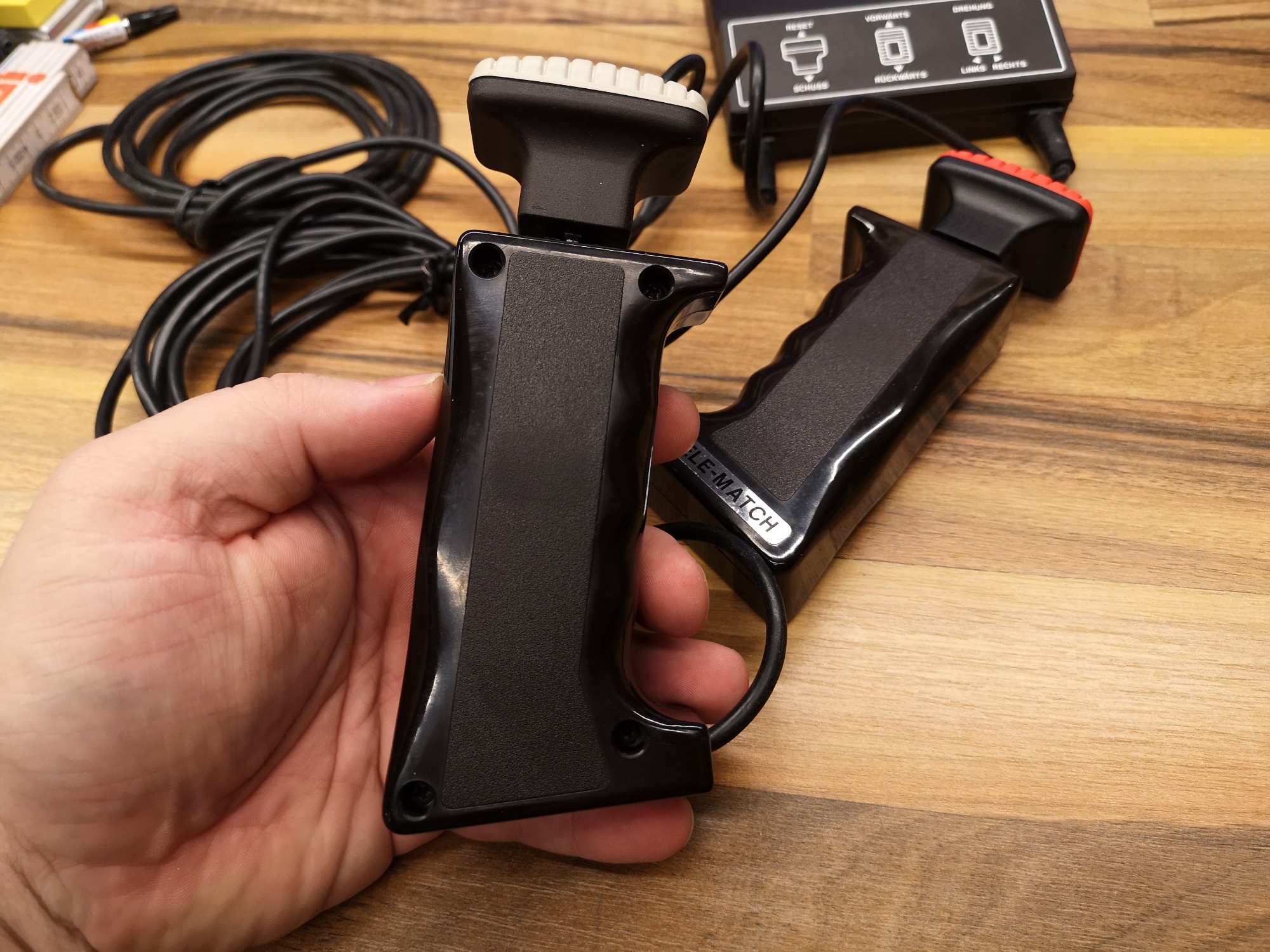 Geliefert wird in einer kleinen, kofferähnlichen Lederschachtel. Sicher verstaut macht das ganze dadurch einen recht hochwertigen Eindruck. Der Controller ist eine Besonderheit. Er wird wie ein Griff in der Hand gehalten und hat oben drauf dann den Steuerknauf. Man kann ihn vor / zurück, hoch / runter und zudem noch herausziehen / reindrücken Somit hat man eine 3D Steuerung realisiert. Der Knauf hat jeweils eine andere Farbe als Topping für den jeweiligen Spieler. Die Kabel sind fest montiert und ausreichend lang. Die besondere, kompakte Bauweise macht die Konsolen-Reihe wieder zu einem kleinen Highlight auf Retro-Ebene. Auch wenn der Nutzen dank fehlender Röhre mit kompatiblen Schacht nicht wirklich gegeben ist, so macht mich Aufmachung und Design doch froh sie mit in der Sammlung zu haben.