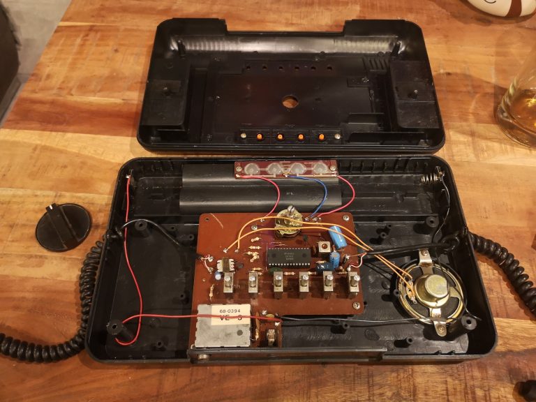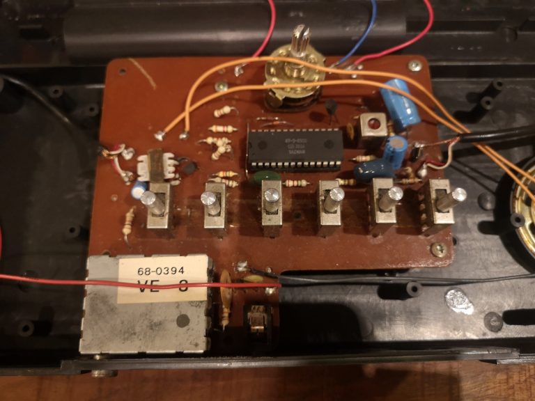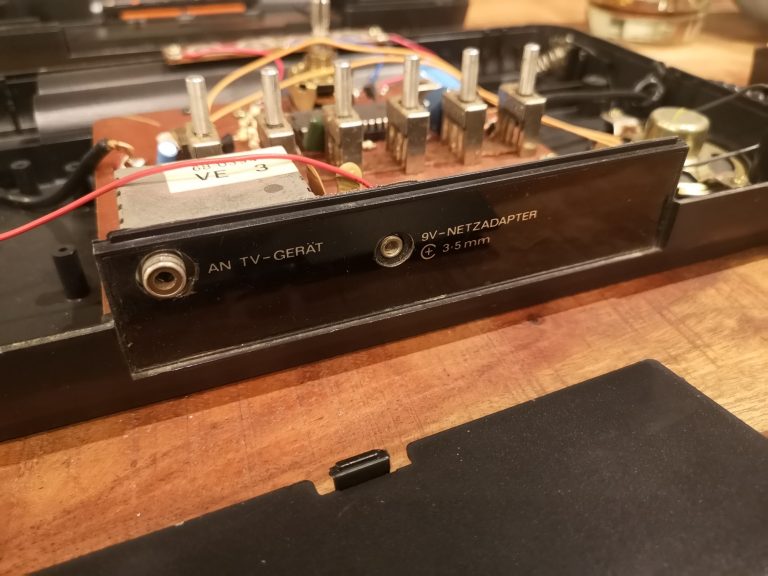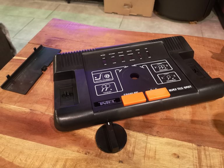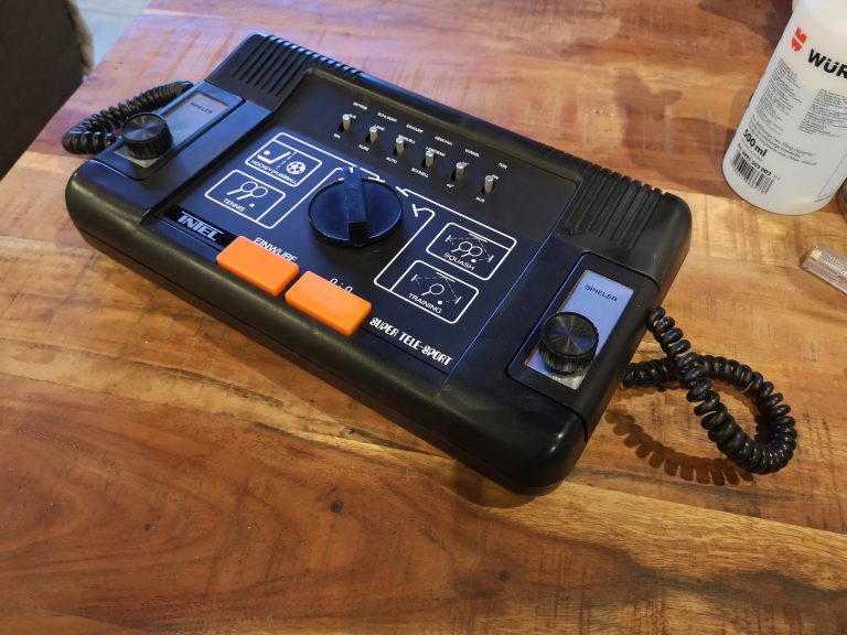 Die Sportron hat 18 Volt, die doppelte Menge an Versorgungsspannung und trotzdem ein Batteriefach integriert. In die Konsole kommen sage und schreibe 12x C-Batterien, Intel betreibt seine hier aber trotzdem mit 9 Volt. Interessant, es werden nur 6 Batterien, also eine von zwei Reihen benutzt. Die zweite Reihe aber nicht irgendwie weggespart. Man könnte also 12 Batterien einlegen, was keinen Sinn macht. Nur der Aufkleber zeigt, dass die eine Reihe bestückt werden soll. Im inneren sieht man auch entsprechende Verkabelung, sodass Reihe 2 nur ein Dummy-Fach ist. Das Innenleben ist auch erstaunlich kompakt. Die Hauptplatine nimmt nicht viel Raum ein und auch hier gibt es wieder einen internen Lautsprecher. Die Pong Legende, der AY-3-8500 darf auch beim Super Tele-Sport den Takt vorgeben.
