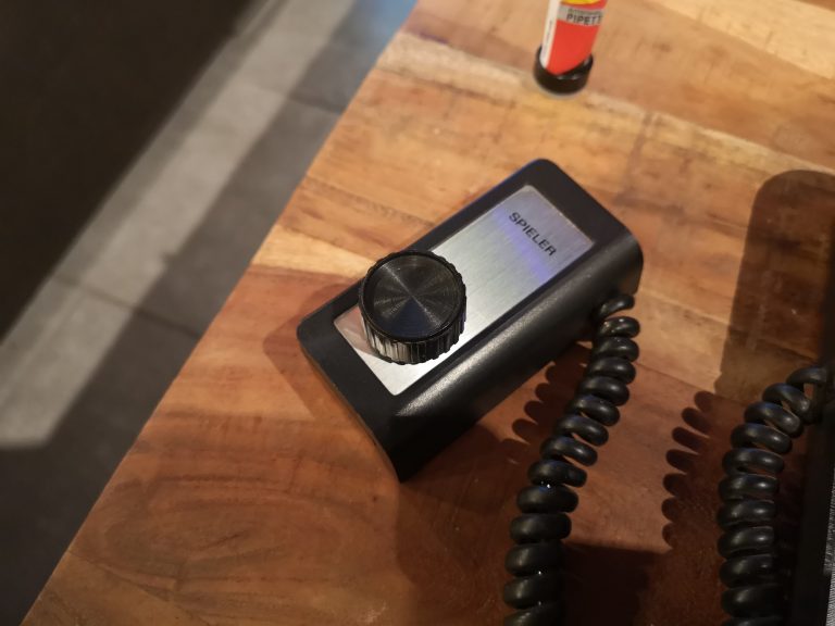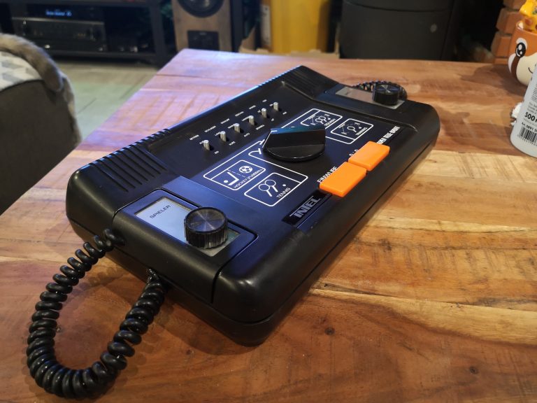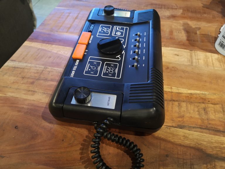 Etwas wuchtig kommt diese Pong Konsole daher, wenngleich mir ihr Design doch gefällt, schön retro-futuristisch. Das Schwarz und Orange der Intel Geräte ist auch hier wieder vertreten. Das Grundgehäuse kam mir doch irgendwie bekannt vor und siehe da, das Sportron 201 mit geändertem Layout ist baugleich. Durch die kompakt schmalen Controller wirkt sie noch wuchtiger, die großzügig abgerundeten Kanten und der große Drehschalter erledigen den Rest. Sie wirkt wie ein großes Retro-Steuerpult, toll. Wir haben einen großen Drehschalter, der zwischen den 4 bekannten Pong Spielen Hockey-Fussball, Tennis, Squash und Training wechselt. Die sonstigen bekannten Bedienelemente sind in Schiebeschaltern ausgeführt. Das Layout ist simpel und selbsterklärend.