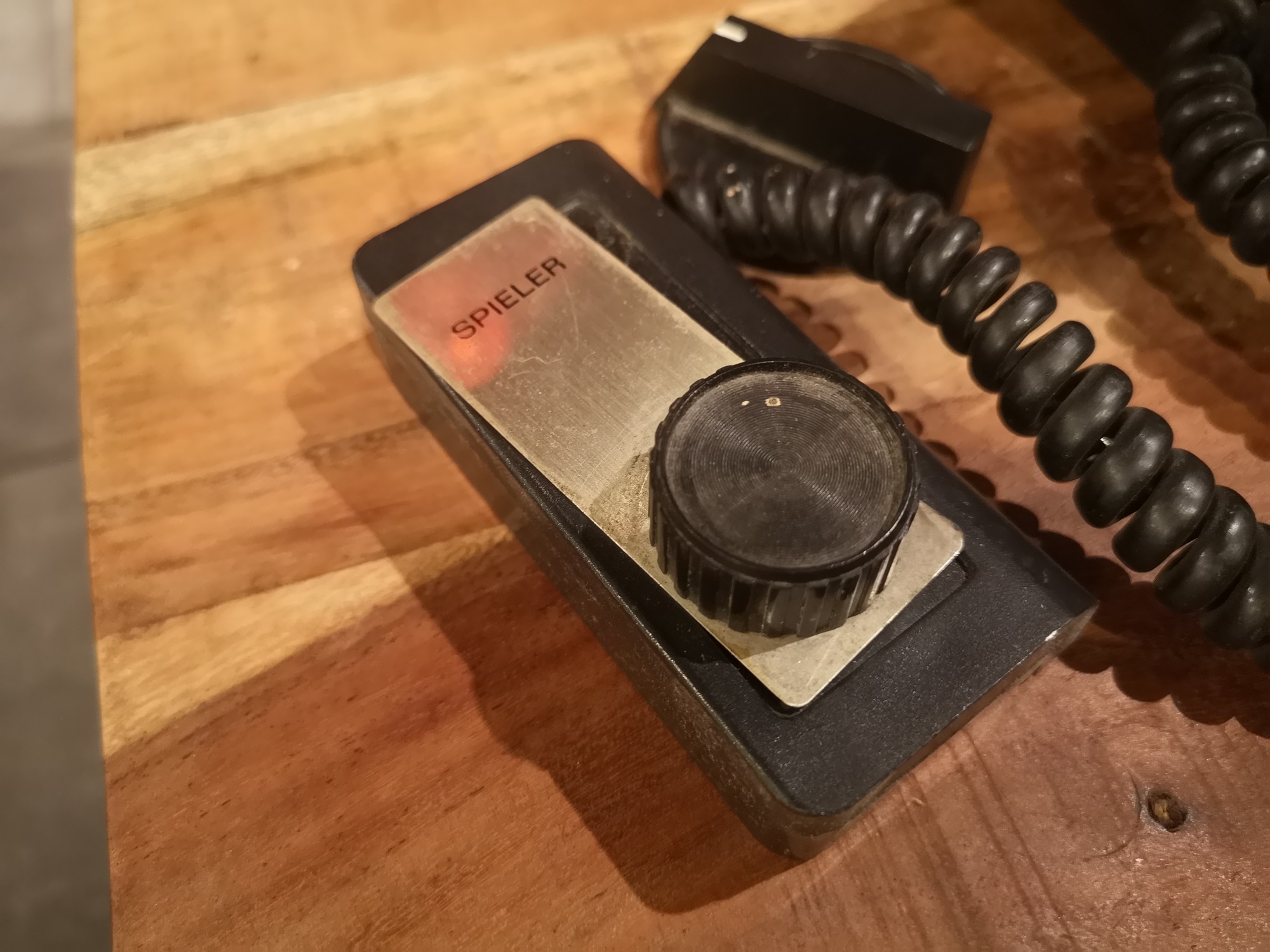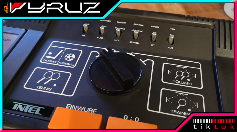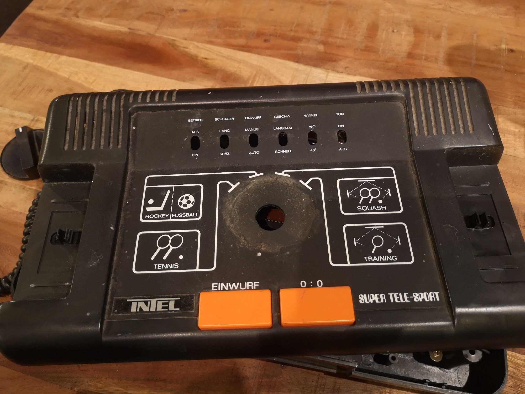 Etwas wuchtig kommt diese Pong Konsole daher, wenngleich mir ihr Design doch gefällt, schön retro-futuristisch. Das Schwarz und Orange der Intel Geräte ist auch hier wieder vertreten. Das Grundgehäuse kam mir doch irgendwie bekannt vor und siehe da, das Sportron 201 mit geändertem Layout ist baugleich. Durch die kompakt schmalen Controller wirkt sie noch wuchtiger, die großzügig abgerundeten Kanten und der große Drehschalter erledigen den Rest. Sie wirkt wie ein großes Retro-Steuerpult, toll. Wir haben einen großen Drehschalter, der zwischen den 4 bekannten Pong Spielen Hockey-Fussball, Tennis, Squash und Training wechselt. Die sonstigen bekannten Bedienelemente sind in Schiebeschaltern ausgeführt. Das Layout ist simpel und selbsterklärend.