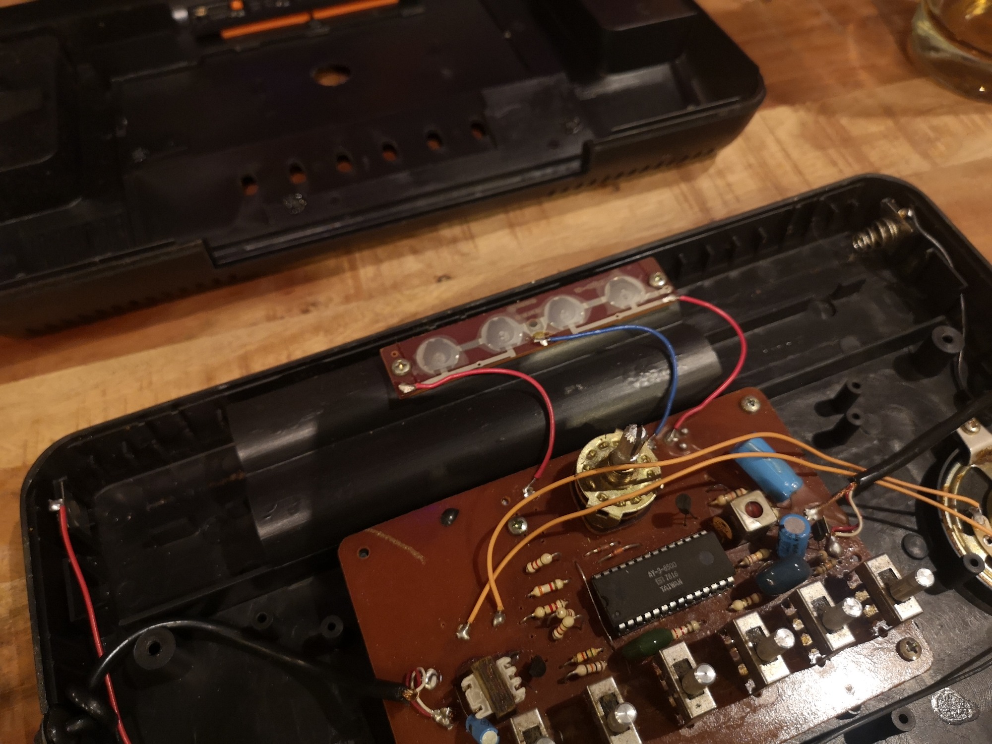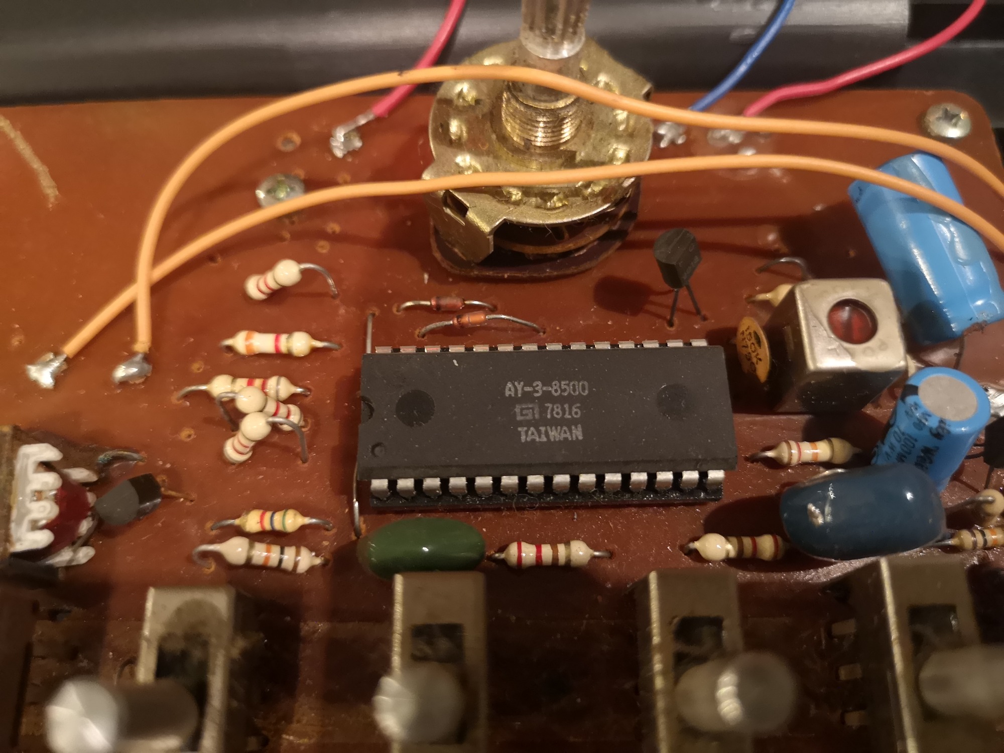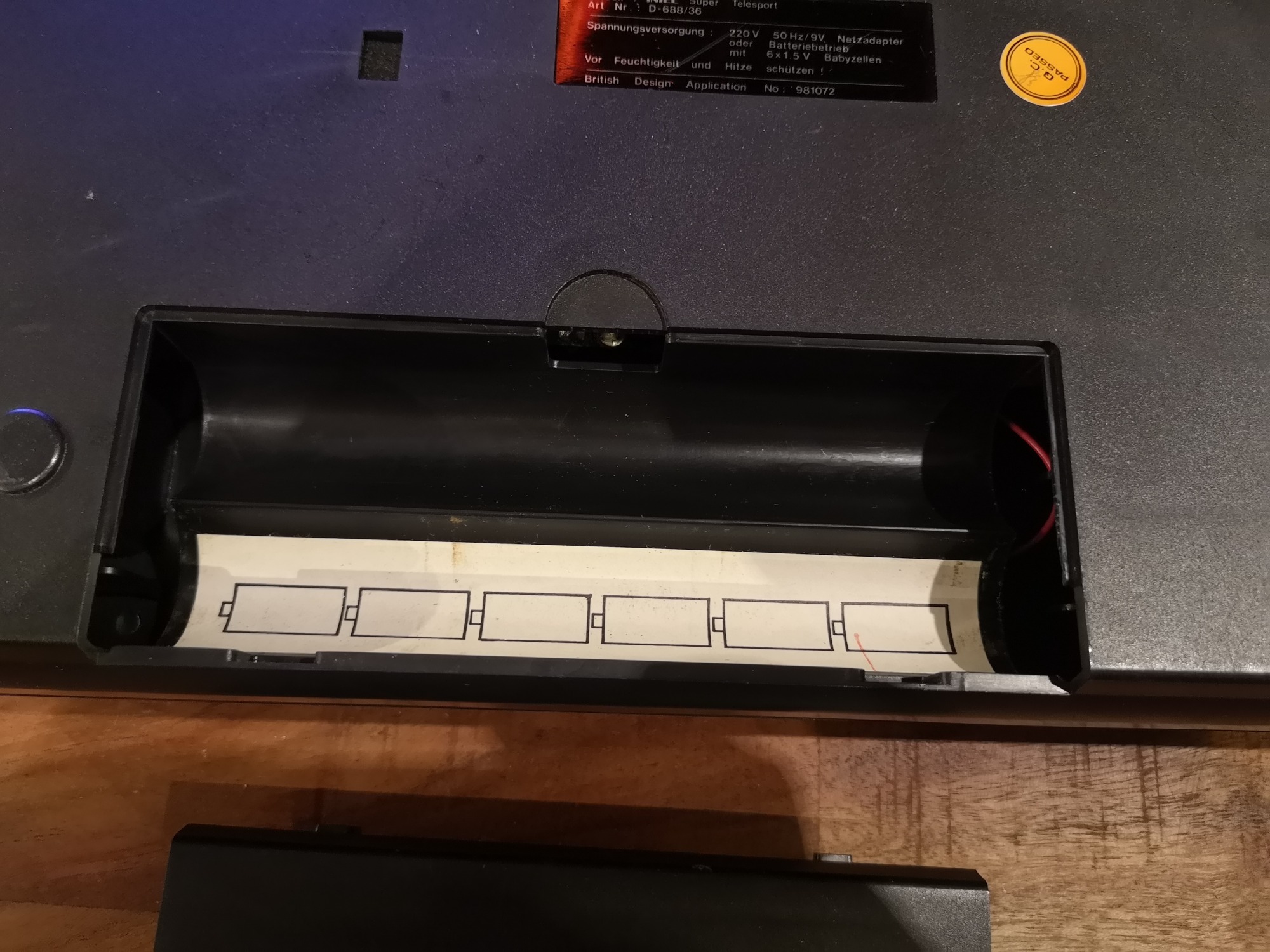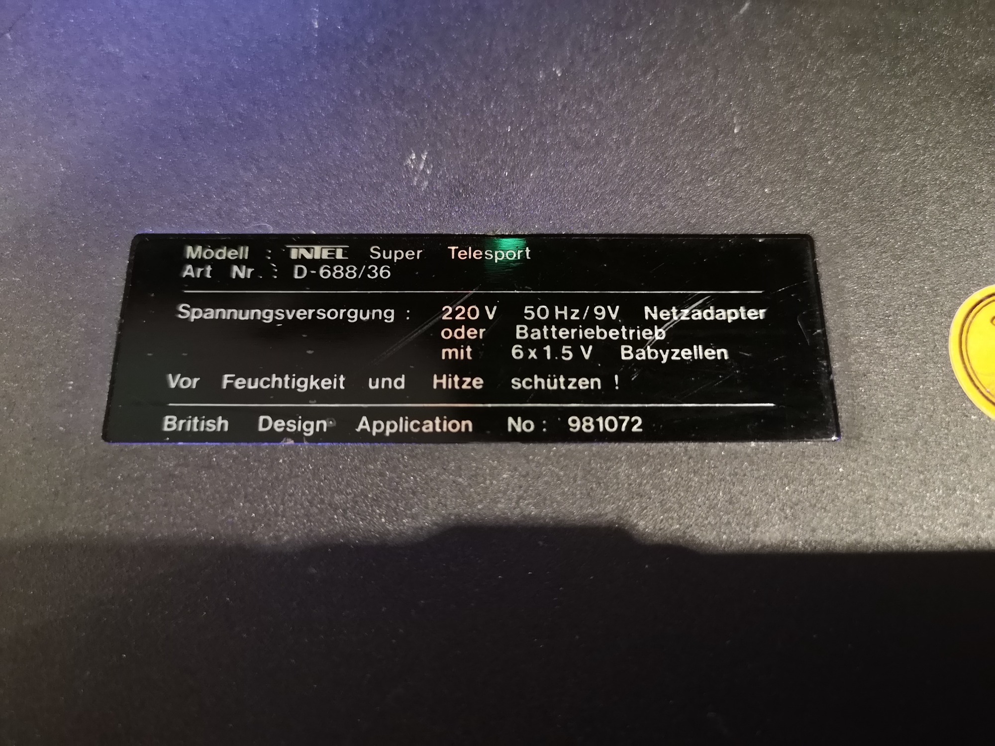 Die Sportron hat 18 Volt, die doppelte Menge an Versorgungsspannung und trotzdem ein Batteriefach integriert. In die Konsole kommen sage und schreibe 12x C-Batterien, Intel betreibt seine hier aber trotzdem mit 9 Volt. Interessant, es werden nur 6 Batterien, also eine von zwei Reihen benutzt. Die zweite Reihe aber nicht irgendwie weggespart. Man könnte also 12 Batterien einlegen, was keinen Sinn macht. Nur der Aufkleber zeigt, dass die eine Reihe bestückt werden soll. Im inneren sieht man auch entsprechende Verkabelung, sodass Reihe 2 nur ein Dummy-Fach ist. Das Innenleben ist auch erstaunlich kompakt. Die Hauptplatine nimmt nicht viel Raum ein und auch hier gibt es wieder einen internen Lautsprecher. Die Pong Legende, der AY-3-8500 darf auch beim Super Tele-Sport den Takt vorgeben.