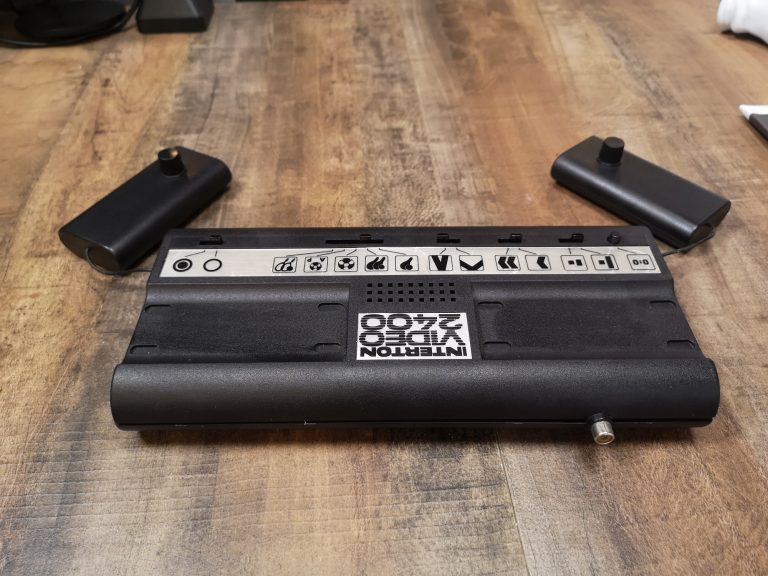 Im Gegensatz zum typischen General Instrument AY-3-8500er Chip setzt Interton auf den Pin-Out kompatiblen Texas Instruments TMS1965NL. Dadurch sind die 5 anwählbaren Spiele möglich. Größe der Schläger, Geschwindigkeit und Abprall-Winkel sind einstellbar. Ein Button zum Zähler-Reset ist auch noch dabei. Die Controller werden in kleine Mulden auf die Konsole gelegt, welche sie zwar aufgeräumt aussehen lassen, bei Transport aber schnell runter rutschen. Nicht ganz optimal, für stationär aber ausreichend. Insgesamt machen Interton Geräte immer einen erwachsenen, reduziert soliden Eindruck. Minimalistisch schön, seriös Schwarz und auf ein paar Zentimeter Höhe reduziert.