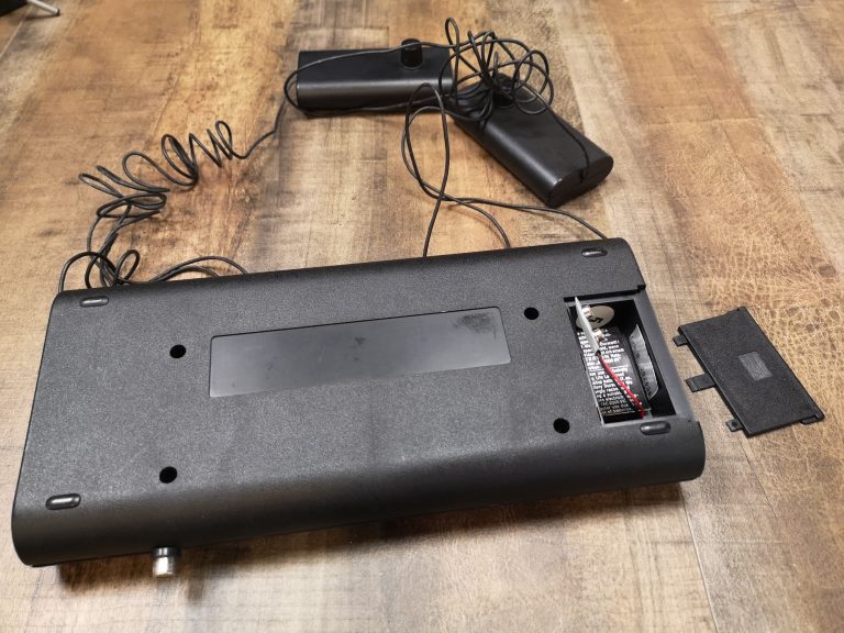 Die 2400 ist eine sehr kompakte Interton Pong Konsole. Sie verzichtet auf zusätzliche Controller-Ports wie die großen Varianten, dafür sind die fest montierten aber abnehmbar mit langem Kabel. Dieses kann man in die Konsole schieben, sodass man nicht einen riesigen Kabelsalat dank der dünnen Strippe hat. Das Design ist sehr Interton typisch mit der Schwarz/Silber Optik, dem flachen Design mit den abgerundeten Kanten und den Piktogrammen. Dasdurch kommt die Konsole ohne Beschriftungen aus. Wieder ein sehr modernes Design dadurch, zeitlos und schlicht. Betrieben werden kann die Konsole mit einem 9 Volt Netzteil oder alternativ mit einer 9 Volt Block-Batterie.