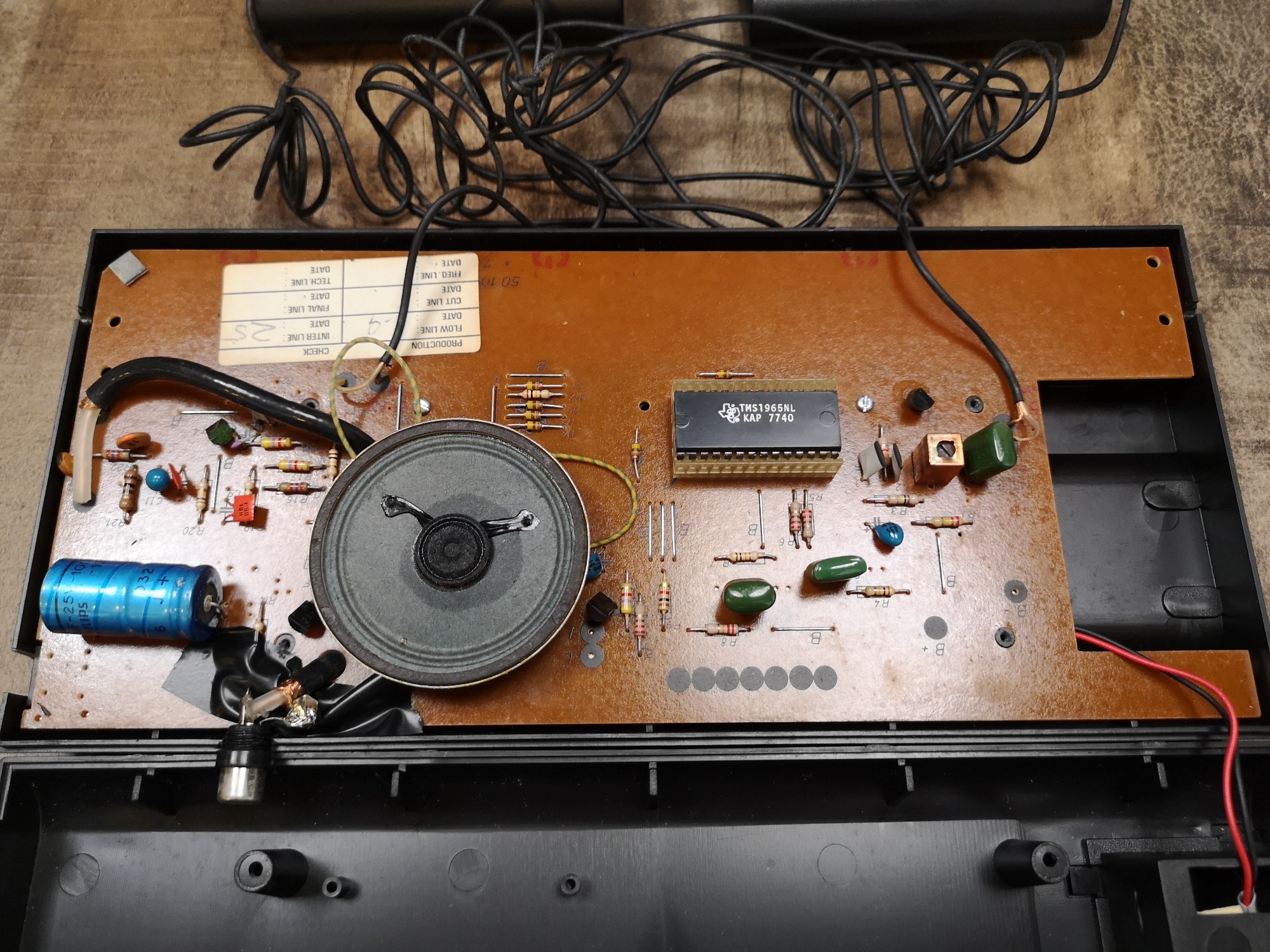 Im Gegensatz zum typischen General Instrument AY-3-8500er Chip setzt Interton auf den Pin-Out kompatiblen Texas Instruments TMS1965NL. Dadurch sind die 5 anwählbaren Spiele möglich. Größe der Schläger, Geschwindigkeit und Abprall-Winkel sind einstellbar. Ein Button zum Zähler-Reset ist auch noch dabei. Die Controller werden in kleine Mulden auf die Konsole gelegt, welche sie zwar aufgeräumt aussehen lassen, bei Transport aber schnell runter rutschen. Nicht ganz optimal, für stationär aber ausreichend. Insgesamt machen Interton Geräte immer einen erwachsenen, reduziert soliden Eindruck. Minimalistisch schön, seriös Schwarz und auf ein paar Zentimeter Höhe reduziert.