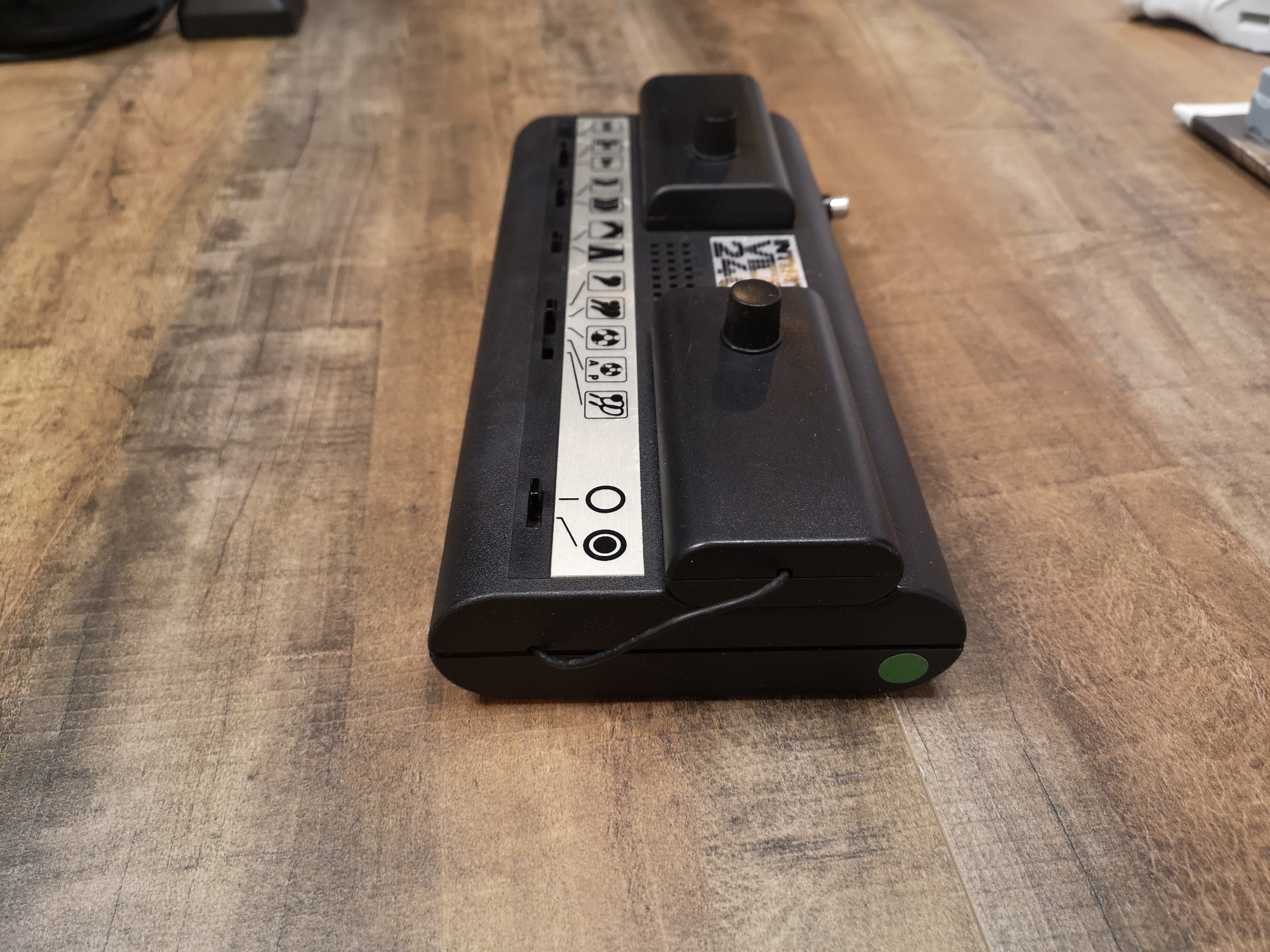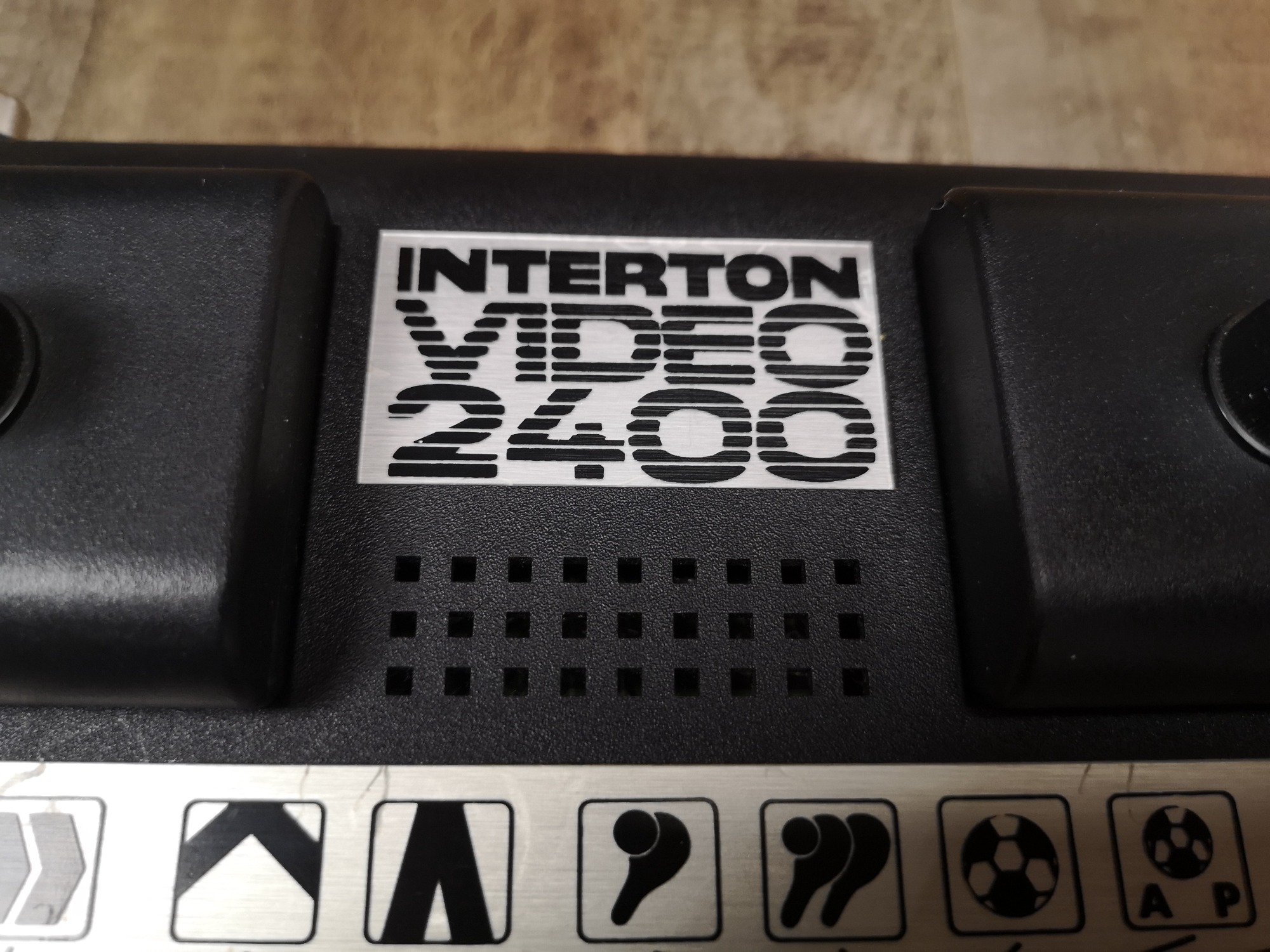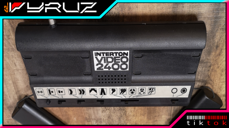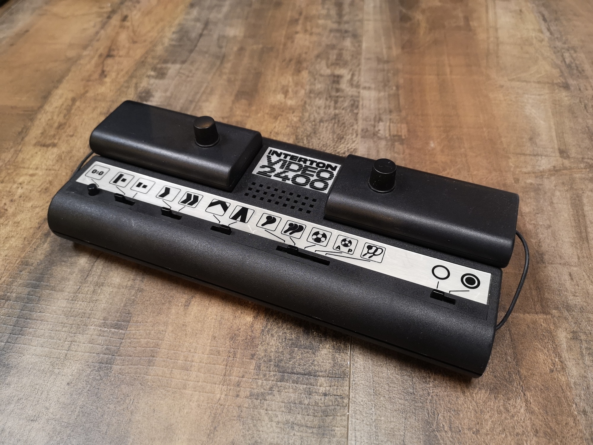 Die 2400 ist eine sehr kompakte Interton Pong Konsole. Sie verzichtet auf zusätzliche Controller-Ports wie die großen Varianten, dafür sind die fest montierten aber abnehmbar mit langem Kabel. Dieses kann man in die Konsole schieben, sodass man nicht einen riesigen Kabelsalat dank der dünnen Strippe hat. Das Design ist sehr Interton typisch mit der Schwarz/Silber Optik, dem flachen Design mit den abgerundeten Kanten und den Piktogrammen. Dasdurch kommt die Konsole ohne Beschriftungen aus. Wieder ein sehr modernes Design dadurch, zeitlos und schlicht. Betrieben werden kann die Konsole mit einem 9 Volt Netzteil oder alternativ mit einer 9 Volt Block-Batterie.