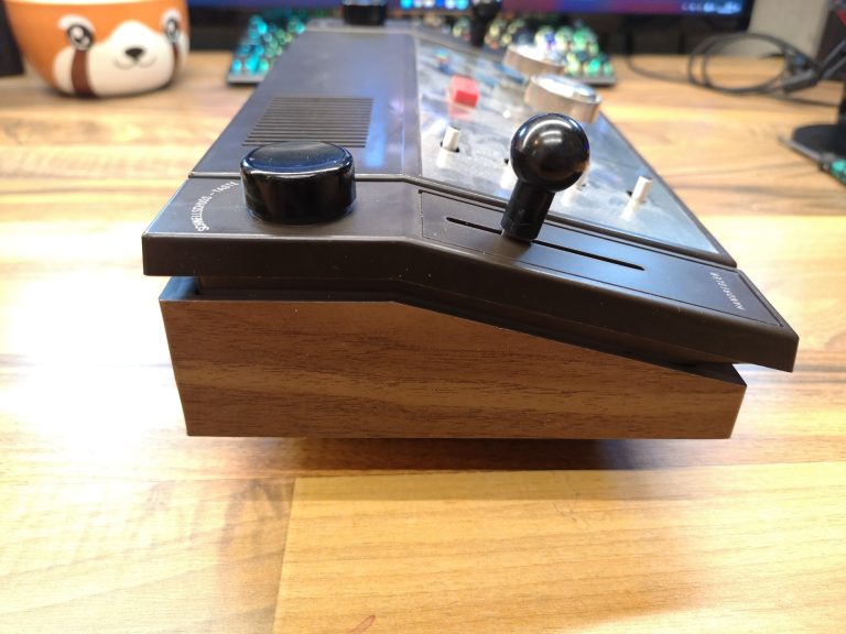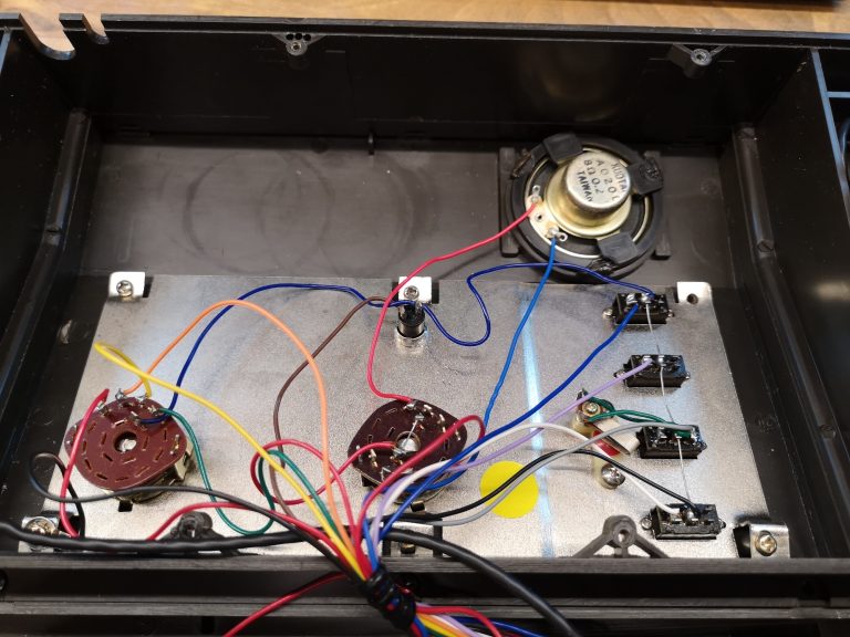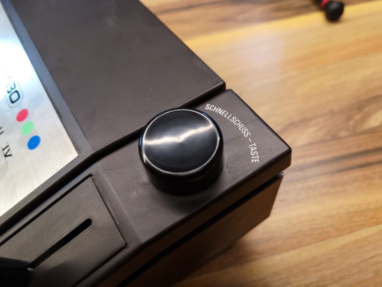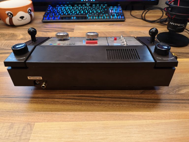 Es gab damals viele Varianten die Spielerbalken zu bewegen. Bei dieser Pong-Konsole wurden Schieberegler verbaut. Die 2 Controller sind zusätzlich noch mit einem Schuss-Button ausgestattet und fest verkabelt. Mit langen Kabeln lassen sich die Controller leicht auf Distanz zur Konsole bringen und schön und sauber wieder in ihr verstauen. Betrieben werden kann das gute Stück wahlweise per Netzteil mit 9 Volt oder alternativ mit 6x 1,5 Volt Baby-Zellen, auch C-Batterien genannt. Auch hier finden wir im Inneren wieder einen alten Bekannten. Das Herz der Konsole ist der AY-3-8500 Chip von General Instruments. 4 bekannte Pong Spiele sind per Drehschalter anwählbar. Ein weiterer, designgleicher Drehschalter dient dem Ein-, Aus- und Stumm-schalten, denn auch hier ist ein Lautsprecher in die Konsole integriert. Die restlichen Einstellungen können über Schiebeschalter eingestellt werden. Ein großer roter Taster resettet den Punktezähler.
