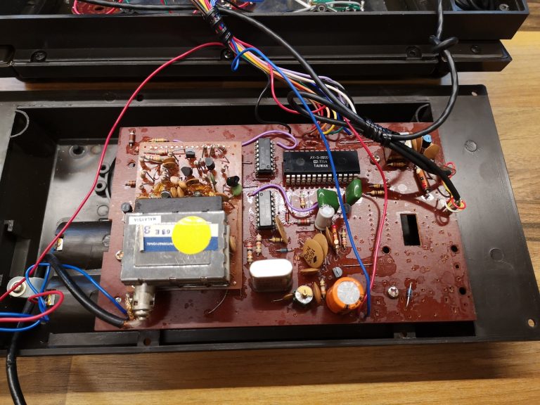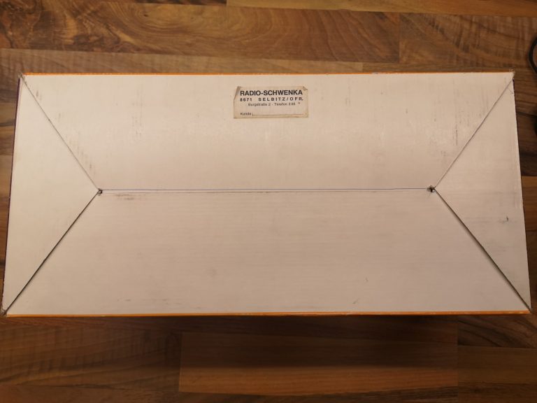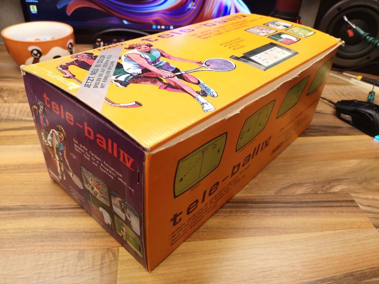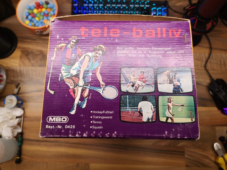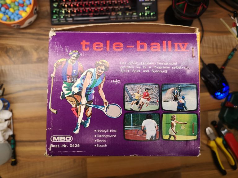 In Anbetracht des Alters war ich doch beim Auspacken der Versandverpackung sehr überrascht. Die Farben leuchten, der Karton ist eckig und die Akzente schimmern silbrig. Wie neu kommt sie daher, die vierte Pong Konsole von MBO. In erfrischendem Orange und Lila präsentiert sich das Design mit, zu der Zeit üblichen, gemalten Szenen und Bildern von der Nutzung des Gerätes. Im Karton, eingebettet zwischen zwei Styropor-Blöcken, die nahezu tadellos erhaltene Konsole. Bis auf ein bisschen Staub keine abgenutzte Schrift oder Gehäuse-Beschädigung. Das einzige, was wie immer stört, ist das fest montierte RF-Antennenkabel. Dieses habe ich fix abgeschnitten und eine RCA-Buchse verlötet, ins Gehäuse eingepasst und mit Heißkleber fixiert. Eine saubere und elegante Lösung.