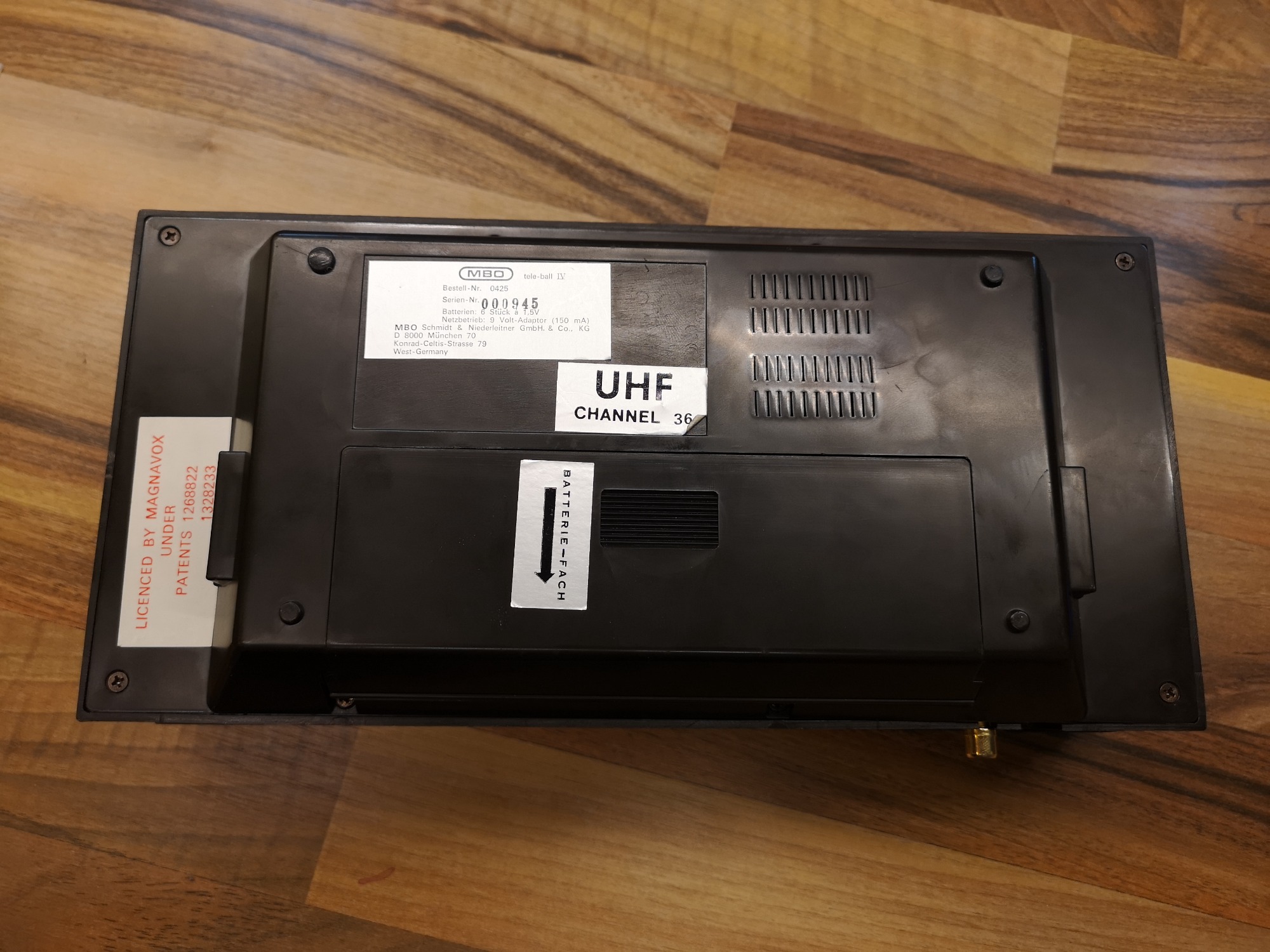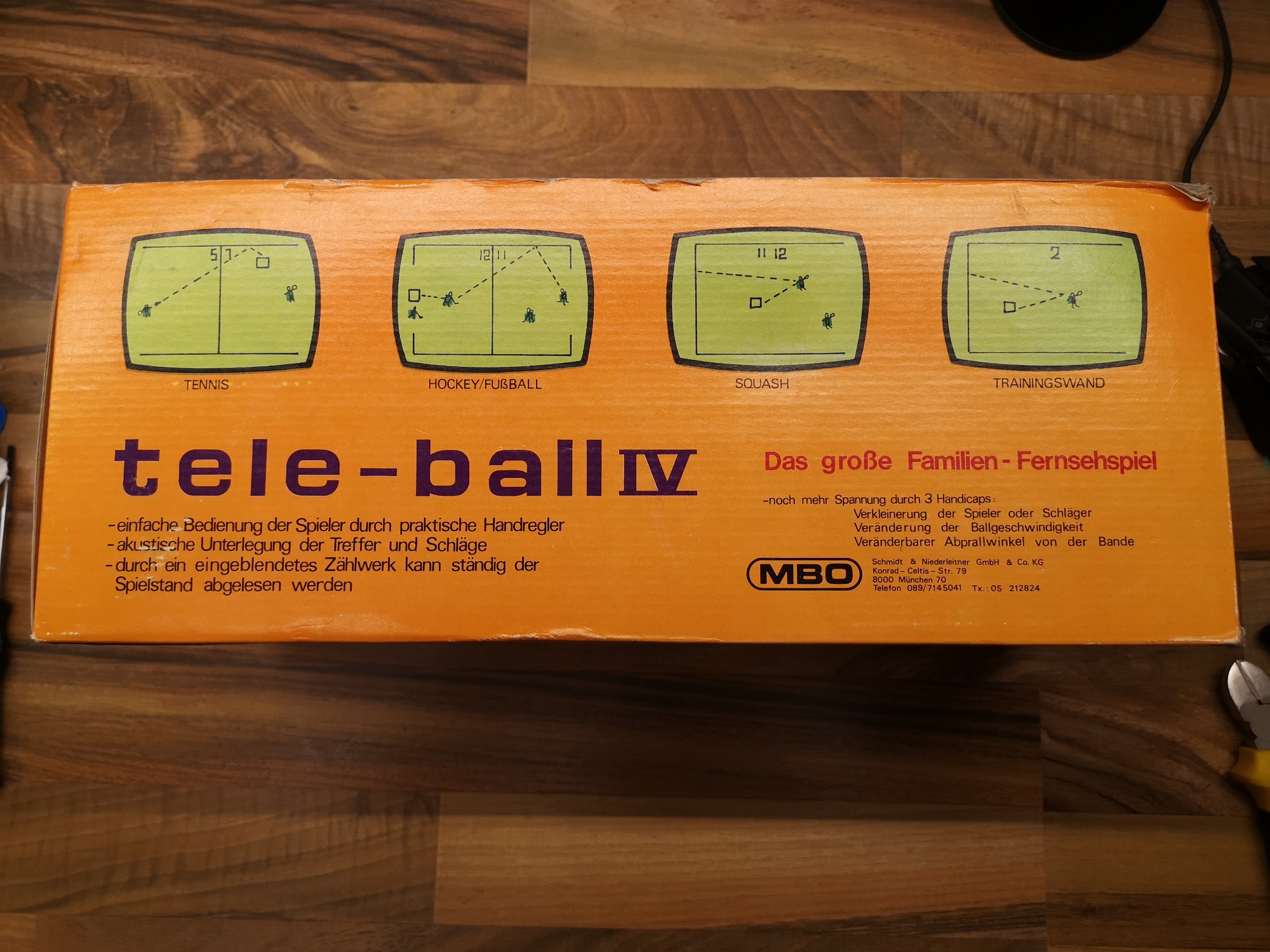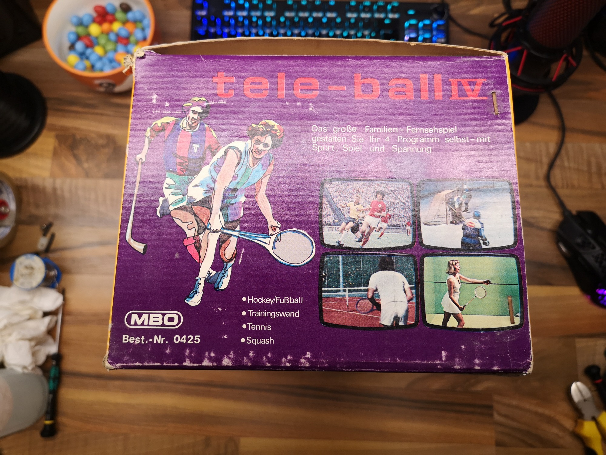 In Anbetracht des Alters war ich doch beim Auspacken der Versandverpackung sehr überrascht. Die Farben leuchten, der Karton ist eckig und die Akzente schimmern silbrig. Wie neu kommt sie daher, die vierte Pong Konsole von MBO. In erfrischendem Orange und Lila präsentiert sich das Design mit, zu der Zeit üblichen, gemalten Szenen und Bildern von der Nutzung des Gerätes. Im Karton, eingebettet zwischen zwei Styropor-Blöcken, die nahezu tadellos erhaltene Konsole. Bis auf ein bisschen Staub keine abgenutzte Schrift oder Gehäuse-Beschädigung. Das einzige, was wie immer stört, ist das fest montierte RF-Antennenkabel. Dieses habe ich fix abgeschnitten und eine RCA-Buchse verlötet, ins Gehäuse eingepasst und mit Heißkleber fixiert. Eine saubere und elegante Lösung.