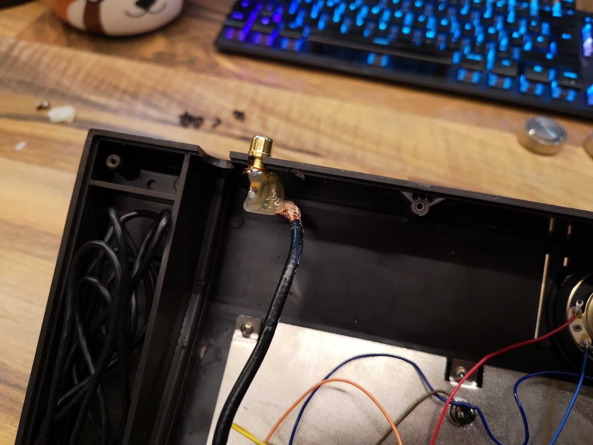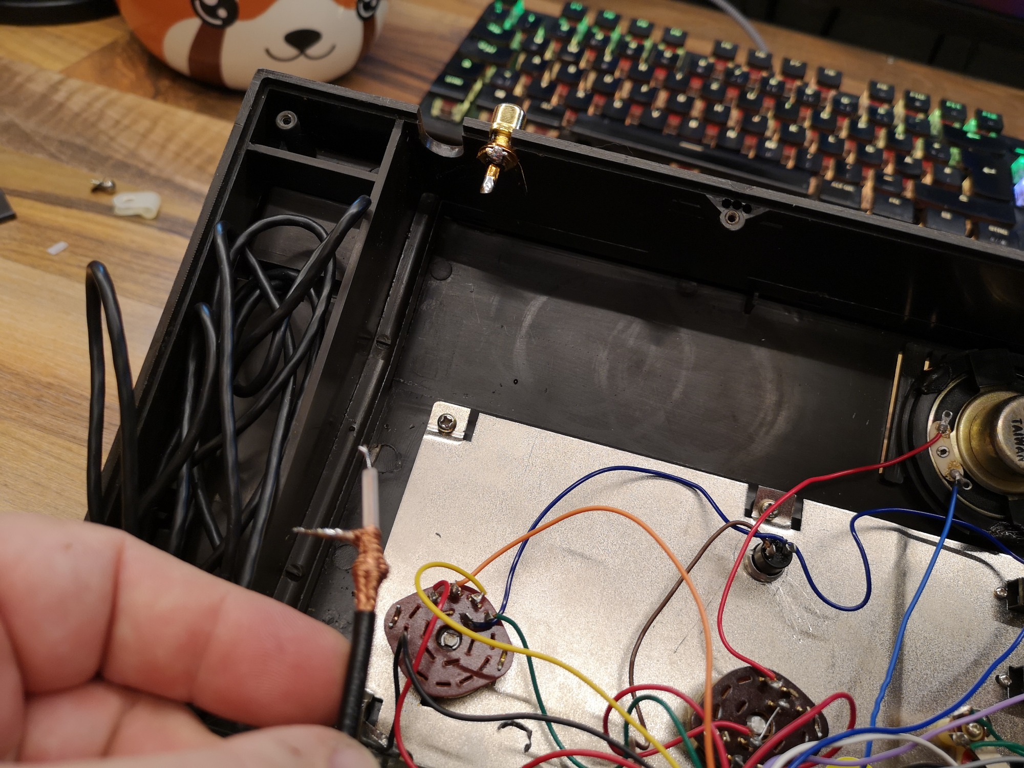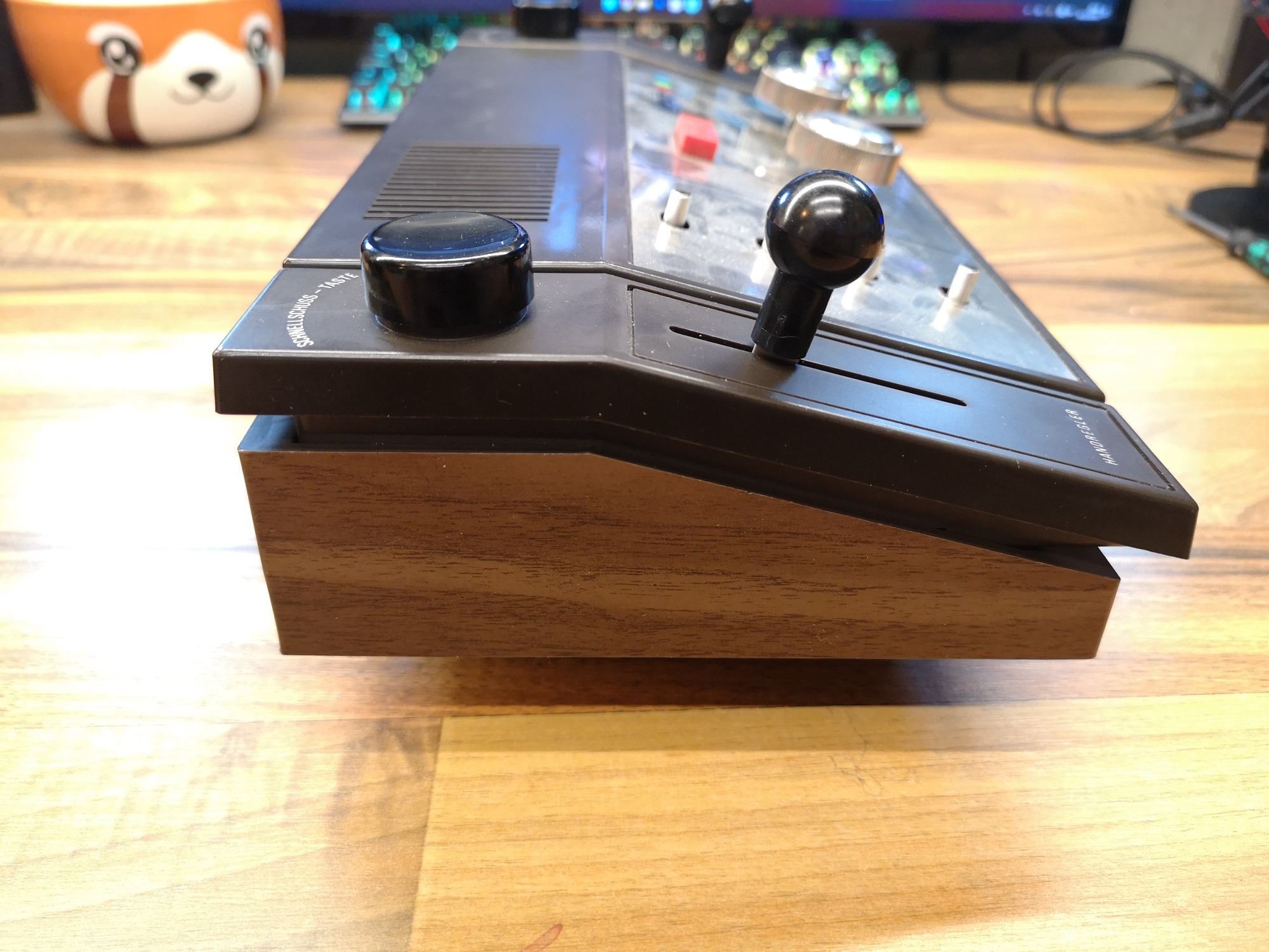 In Anbetracht des Alters war ich doch beim Auspacken der Versandverpackung sehr überrascht. Die Farben leuchten, der Karton ist eckig und die Akzente schimmern silbrig. Wie neu kommt sie daher, die vierte Pong Konsole von MBO. In erfrischendem Orange und Lila präsentiert sich das Design mit, zu der Zeit üblichen, gemalten Szenen und Bildern von der Nutzung des Gerätes. Im Karton, eingebettet zwischen zwei Styropor-Blöcken, die nahezu tadellos erhaltene Konsole. Bis auf ein bisschen Staub keine abgenutzte Schrift oder Gehäuse-Beschädigung. Das einzige, was wie immer stört, ist das fest montierte RF-Antennenkabel. Dieses habe ich fix abgeschnitten und eine RCA-Buchse verlötet, ins Gehäuse eingepasst und mit Heißkleber fixiert. Eine saubere und elegante Lösung.