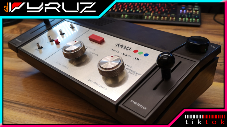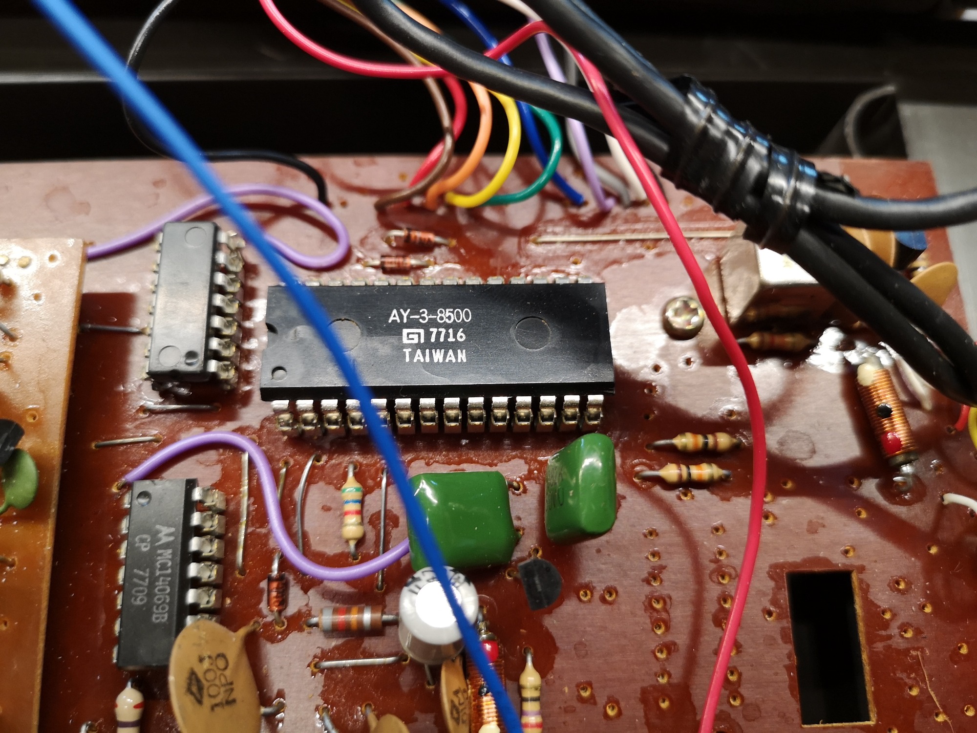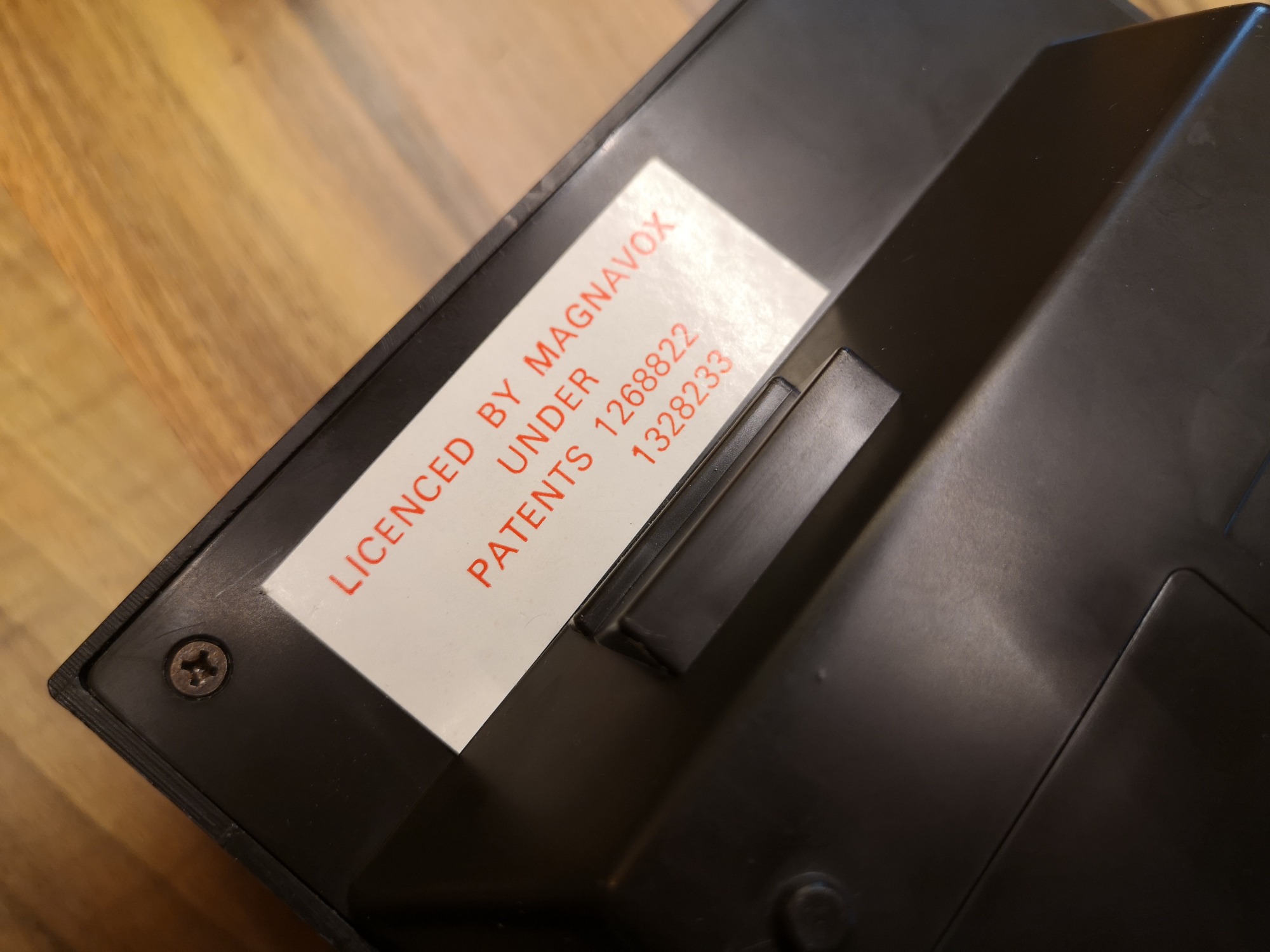 Es gab damals viele Varianten die Spielerbalken zu bewegen. Bei dieser Pong-Konsole wurden Schieberegler verbaut. Die 2 Controller sind zusätzlich noch mit einem Schuss-Button ausgestattet und fest verkabelt. Mit langen Kabeln lassen sich die Controller leicht auf Distanz zur Konsole bringen und schön und sauber wieder in ihr verstauen. Betrieben werden kann das gute Stück wahlweise per Netzteil mit 9 Volt oder alternativ mit 6x 1,5 Volt Baby-Zellen, auch C-Batterien genannt. Auch hier finden wir im Inneren wieder einen alten Bekannten. Das Herz der Konsole ist der AY-3-8500 Chip von General Instruments. 4 bekannte Pong Spiele sind per Drehschalter anwählbar. Ein weiterer, designgleicher Drehschalter dient dem Ein-, Aus- und Stumm-schalten, denn auch hier ist ein Lautsprecher in die Konsole integriert. Die restlichen Einstellungen können über Schiebeschalter eingestellt werden. Ein großer roter Taster resettet den Punktezähler.