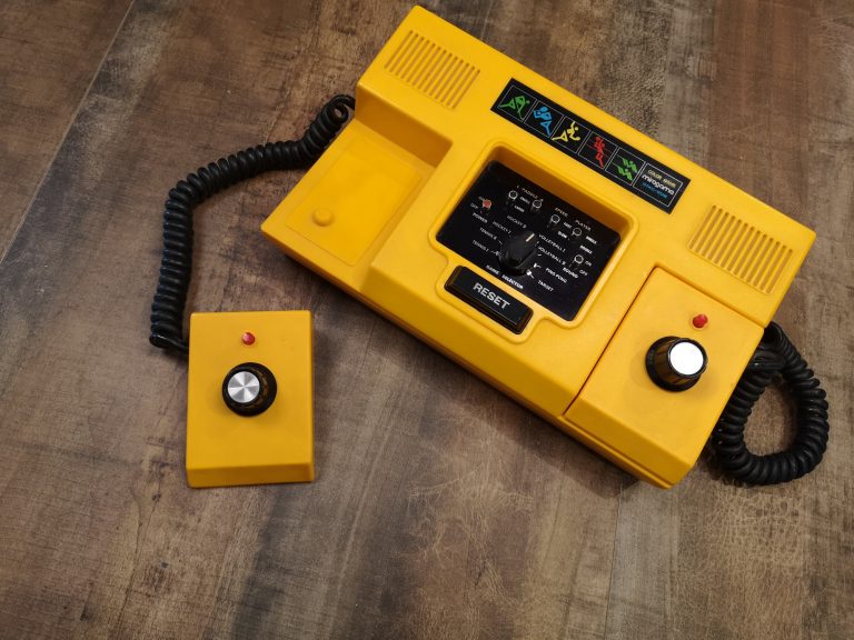 Strahlend gelb kommt sie daher. Ein auffällig schönes und abgerundetes Design. Ein klar abgetrenntes, zentrales Bedienfeld für Spiel und dessen Einstellungen. Ein großer Reset-Knopf um den Punktezähler zu nullen liegt direkt darunter. Eine selbsterklärende und für die Zeit typische Aufteilung. 2 ins Gehäuse nahtlos eingelassene Controller mit Schwarzen Drehreglern und roten Action-Button runden das Erscheinungsbild ab. Metallakzente lassen alles noch wertiger erscheinen. Die Controller sind abnehmbar und mit einem Spiralkabel versehen. Diese Kabel und das Antennenkabel sind fest verbaut und können nicht in der Konsole verstaut werden. Wie bei all meinen Pongs habe ich hier das Antennenkabel durch eine Cinch-Buchse ersetzt.