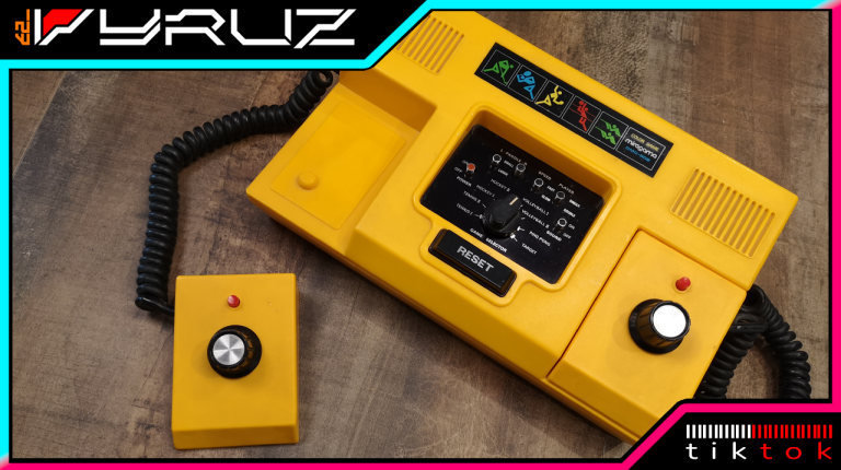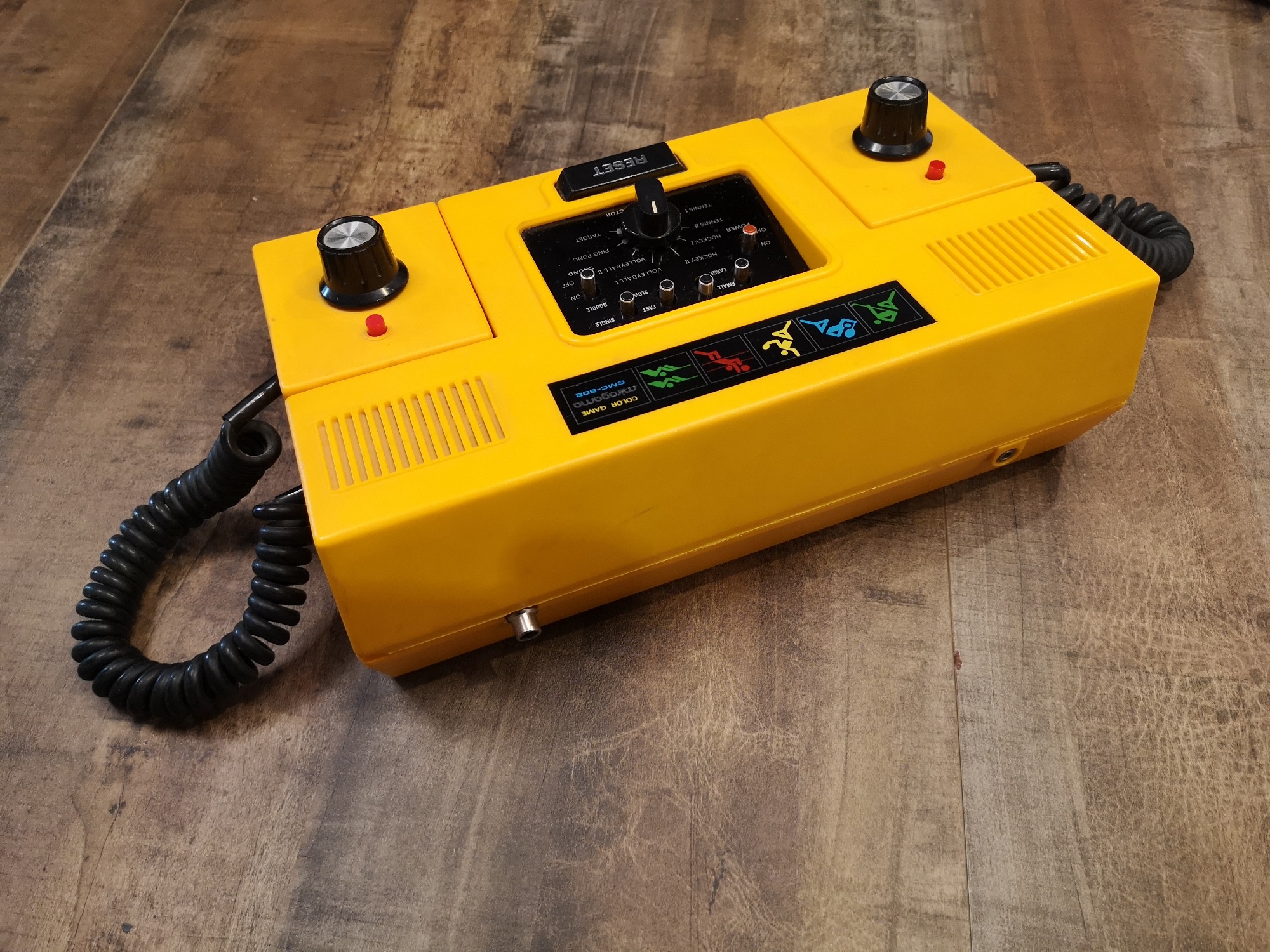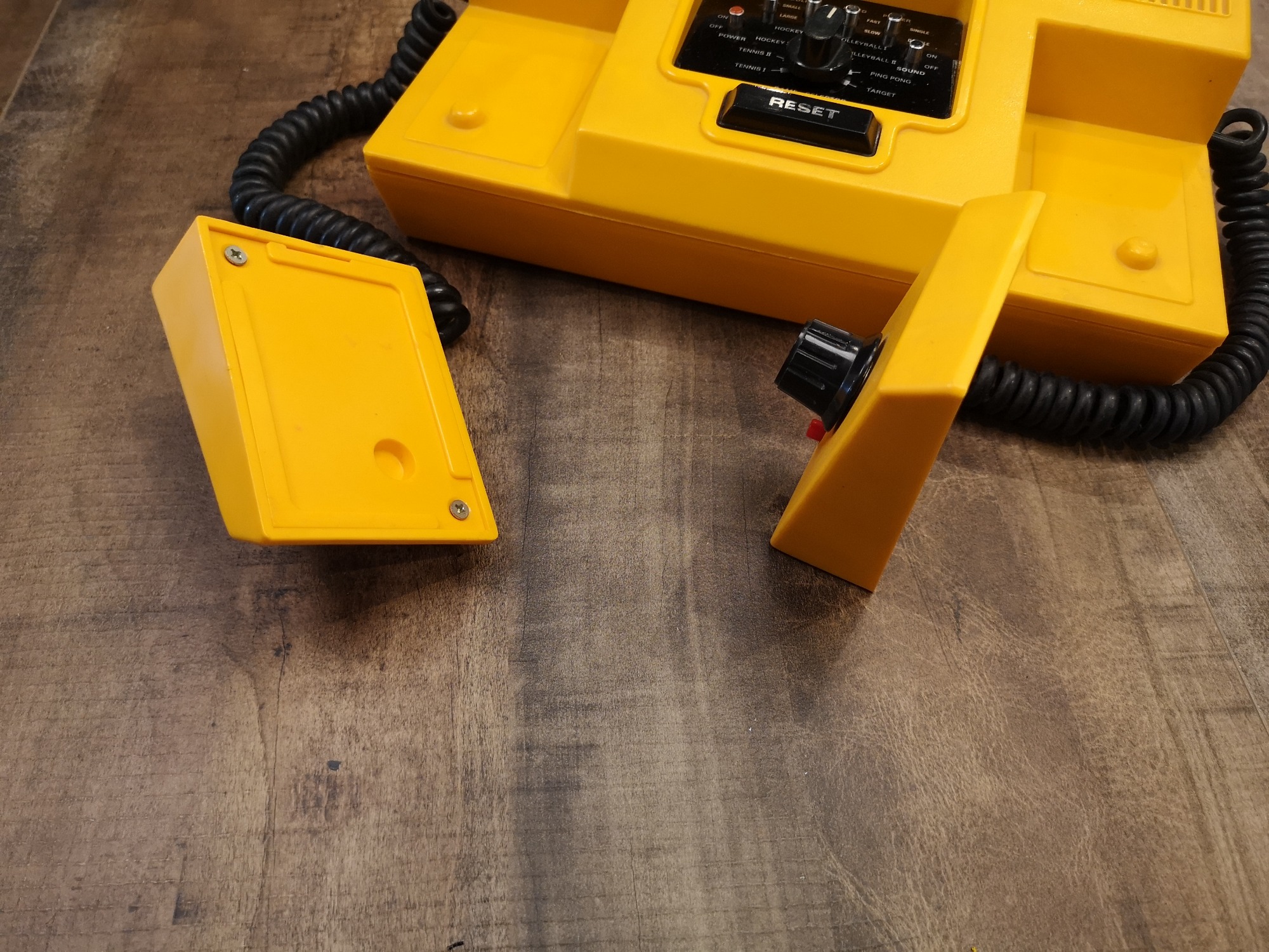Strahlend gelb kommt sie daher. Ein auffällig schönes und abgerundetes Design. Ein klar abgetrenntes, zentrales Bedienfeld für Spiel und dessen Einstellungen. Ein großer Reset-Knopf um den Punktezähler zu nullen liegt direkt darunter. Eine selbsterklärende und für die Zeit typische Aufteilung. 2 ins Gehäuse nahtlos eingelassene Controller mit Schwarzen Drehreglern und roten Action-Button runden das Erscheinungsbild ab. Metallakzente lassen alles noch wertiger erscheinen. Die Controller sind abnehmbar und mit einem Spiralkabel versehen. Diese Kabel und das Antennenkabel sind fest verbaut und können nicht in der Konsole verstaut werden. Wie bei all meinen Pongs habe ich hier das Antennenkabel durch eine Cinch-Buchse ersetzt.