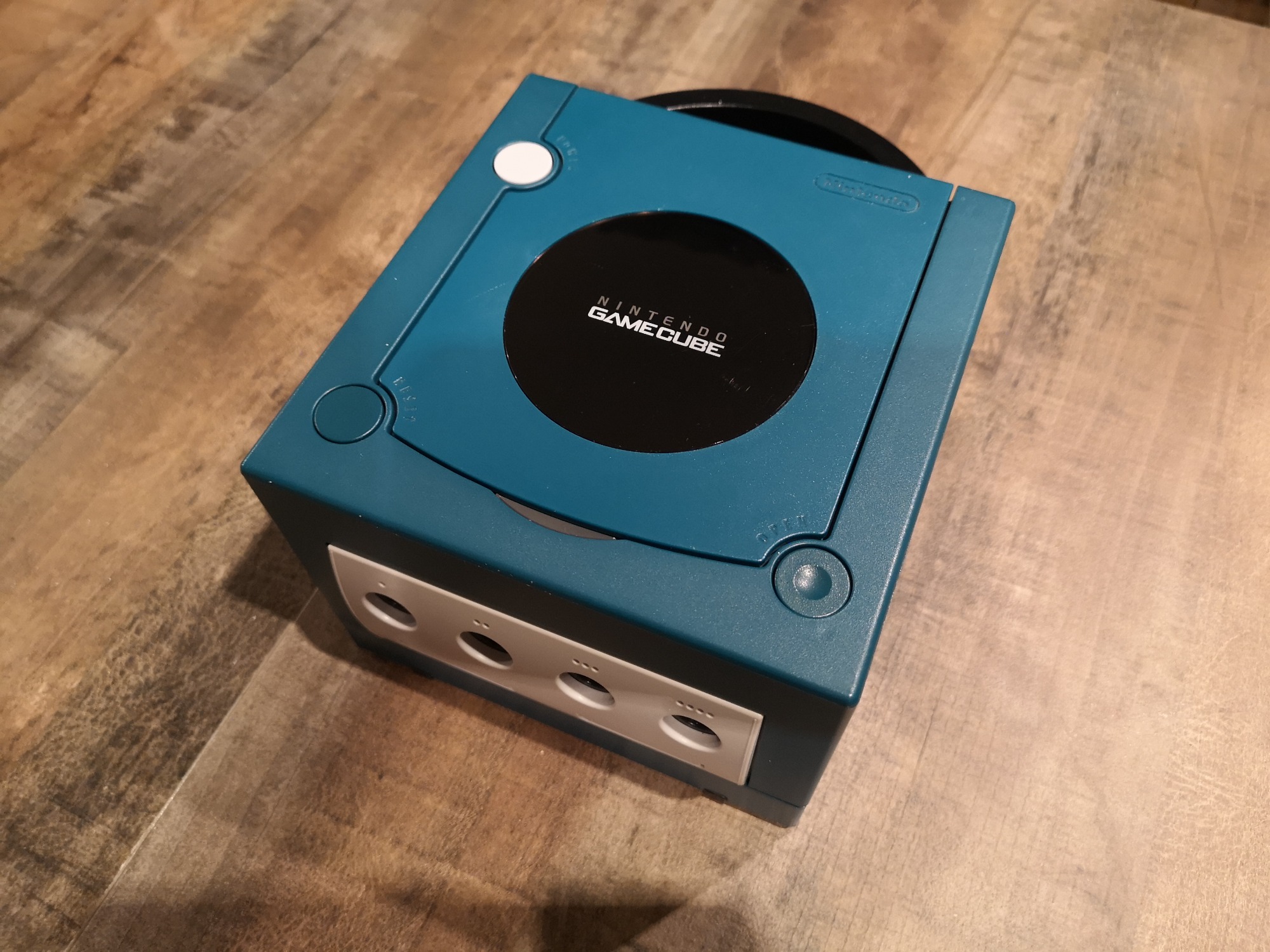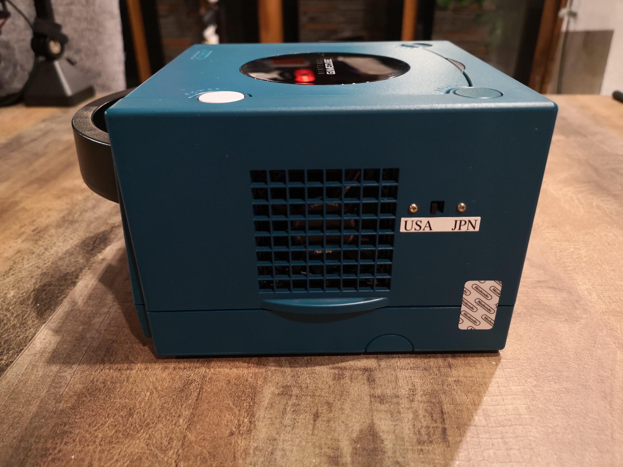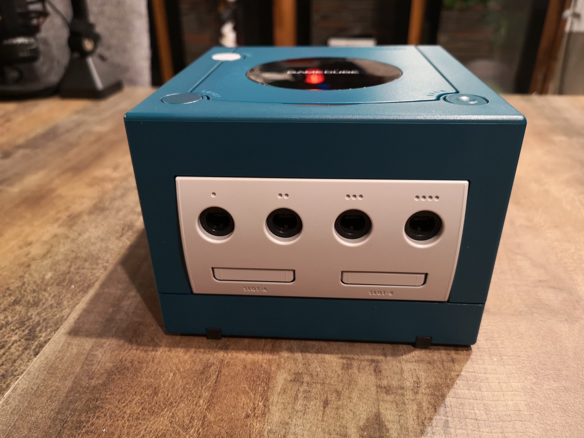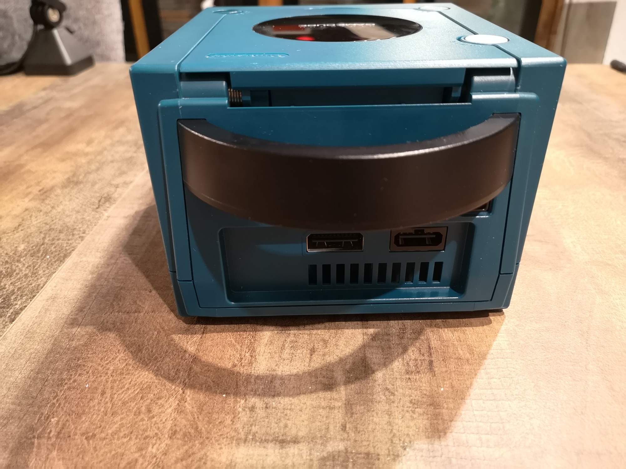 Wie eine Farb-Sonderedition kommt sie daher. In einem dunklen Grün-bläulichen Ton wirkt sie sehr ansprechend und besonders. Von Außen dem normalen Gehäuse der Konsole 1:1 nachempfunden. Lediglich der Region-Switch und ein Nintendo Siegel lassen einem klar werden, das es sich um etwas besonderes handelt. Sogar die Spindel im Disc-Laufwerk hat die Farbe des Gehäuses. Auf dem Typenschild steht unterm Nintendo GameCube Schriftzug NR Reader. Die Seriennummer der Konsole beginnt mit NRR, heißt diese Konsolen sind extra durchnummeriert. Sämtliche Expansion-Ports, die 4 Controller-Ports und die beiden Memory-Card-Slots sind vorhanden. Also konnte auch direkt jegliches Zubehör getestet werden.