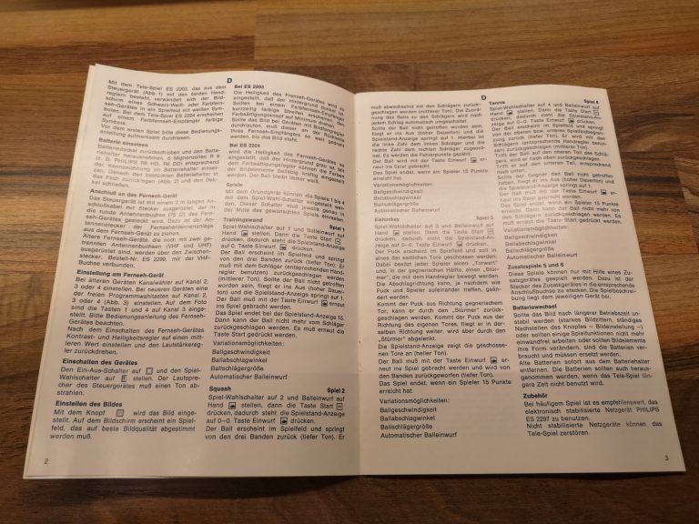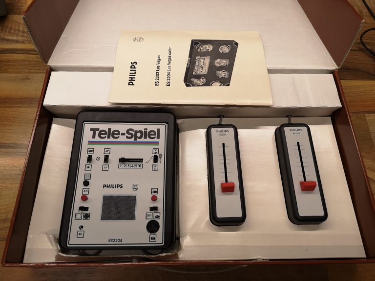 Philips hatte neben der Übernahme Magnavox und deren Odyssey-Konsolen-Designs auch eine eigene Tele-Spiel Serie am laufen. Diese waren mit einem großen Tele-Spiel Logo bedruckt und unter der ES22xx Modell-Nummer geführt. In diesem Artikel beleuchten wir die ES2204. Als Las Vegas benannt wurden die Farb-Varianten der Tele-Spiel Reihe. Somit konnte sie unter Verwendung des Pong Chips AY-3-8500 ein Farbbild der 6 integrierten Spiele auf die Röhre zaubern. Ähnlich ihrer Konkurrenz konnten auch hier über Schalter an der Konsole Ein/Aus geschaltet, Geschwindigkeit, Abprall-Winkel und Größe des Schlägers eingestellt werden. Die Taster für Punkte-Reset und Balleinwurf, sowie eine Einwurf-Wahl von Auto/Manuell waren auch vorhanden. Unüblich war dass sich auch der Signal-Poti, der 9 V Netzteil-Anschluss und der Lightgun-Port auf dem Bedienlayout befunden haben. Über einen Schiebeschalter konnte man zwischen den 6 üblichen Games wählen.