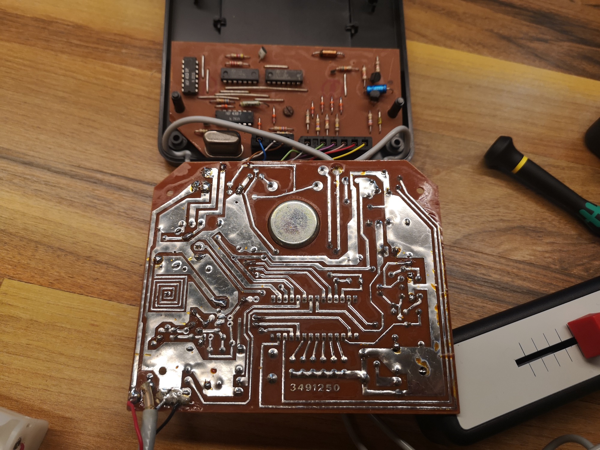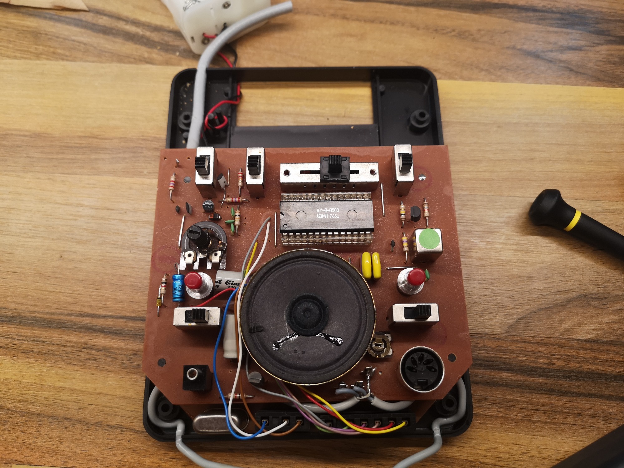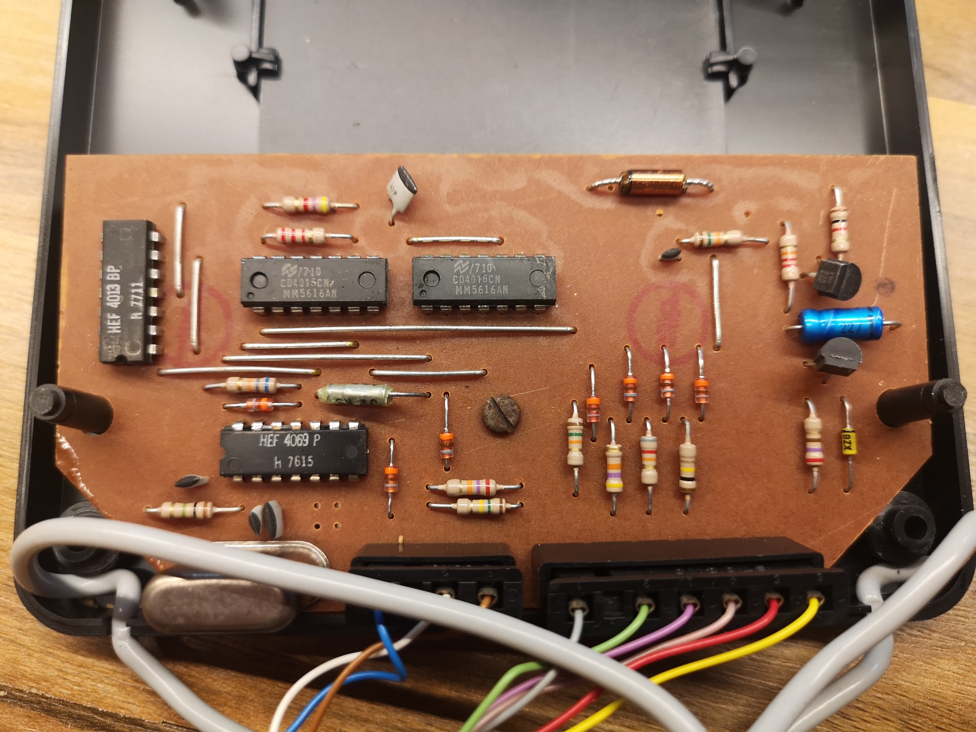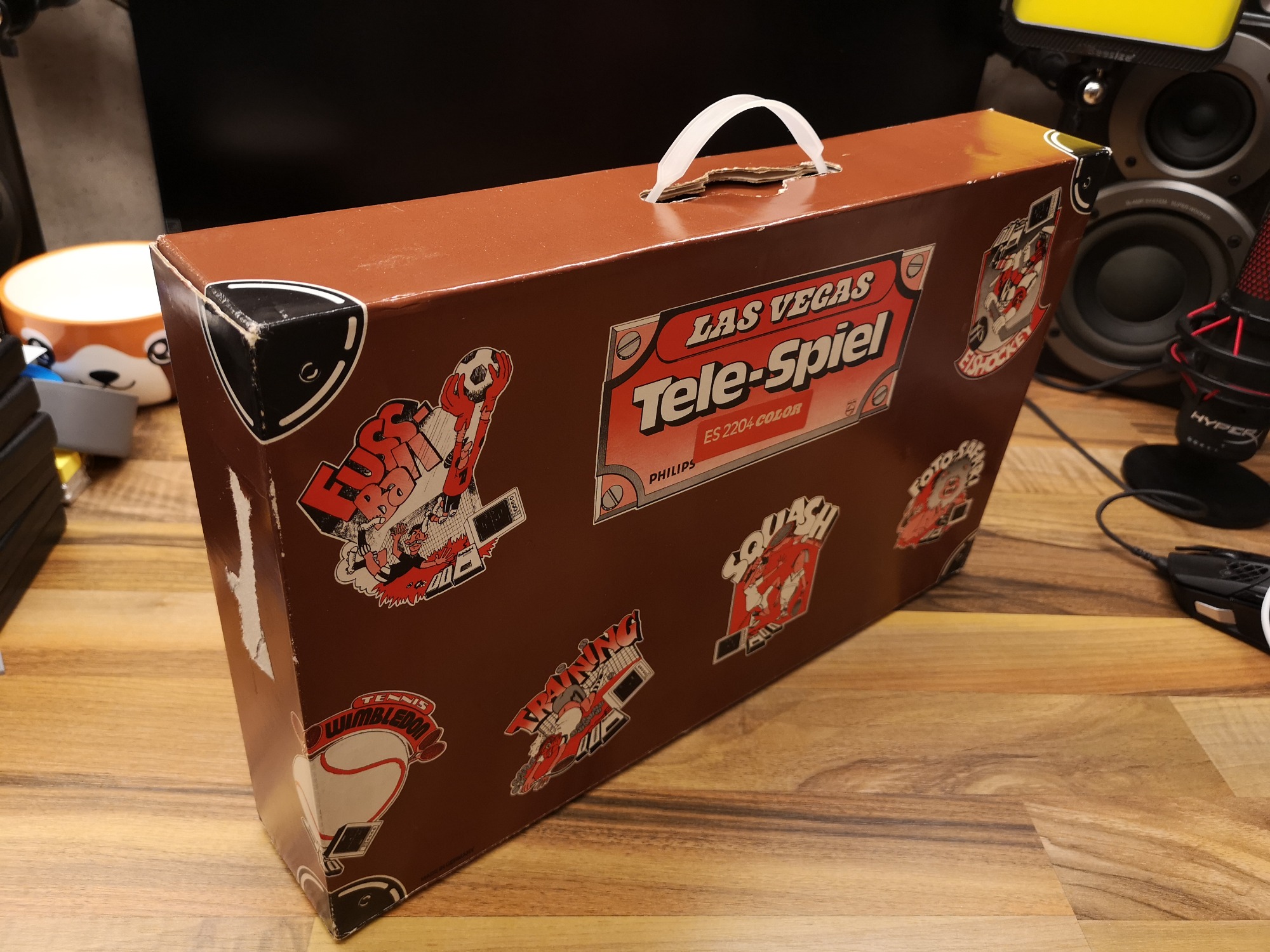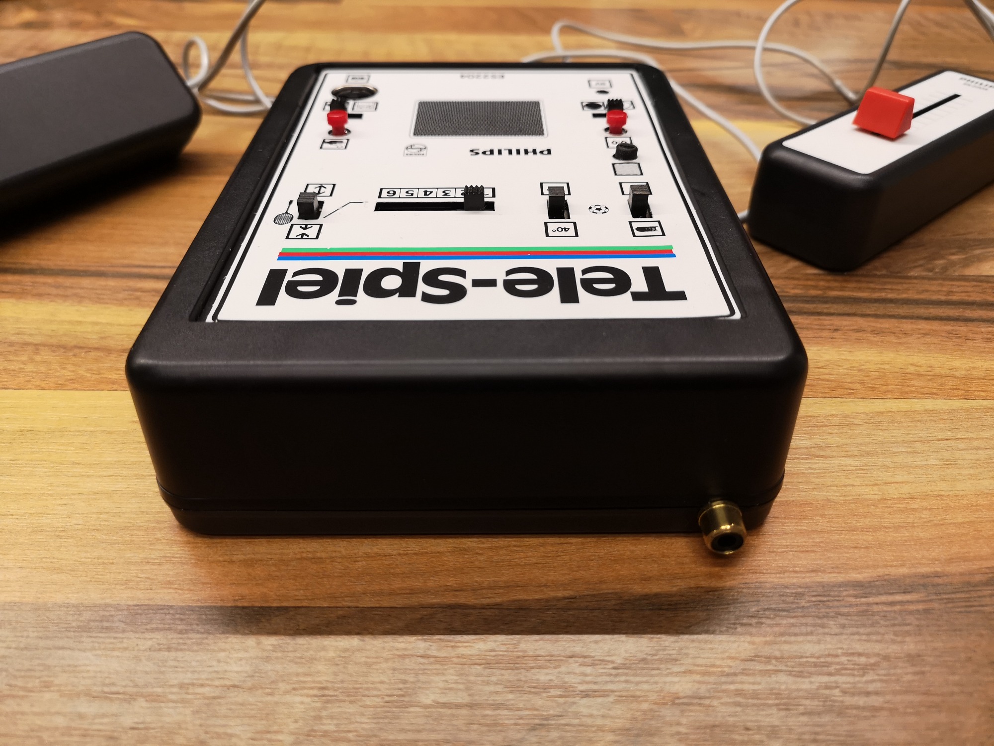 Seriös und technisch kommt die Tele-Spiel-Reihe daher. Alle hatten das selbe kompakte Gehäuse-Maß und nur das Layout wurde angepasst. Alle Schalter und Taster sind in ihrer Reinform verbaut, keine designten Kappen vorhanden. Schlicht, funktional, aufgeräumt. Mit sauberen, feinen Drucken auf der Alu-Platte. Das Design wirkt nicht so verspielt wie die üblichen Konsolen, eher wie ein Messinstrument. Würde sich auch in eine Labor-Landschaft einbringen. Dementsprechend versuchte man hier denke ich auch eher das Erwachsenen-Publikum zu erreichen. Philips stand ja auch eher für Qualität und Technik im erhabenen Preis-Segment. Das lange, fest montierte Antennenkabel habe ich üblicherweise wieder durch eine RF-Cinch-Buchse ersetzt. Die Konsole kommt in der OVP sauber verpackt mit abgedeckten Kabeln. Zu öffnen wie ein Koffer und auch so in der Optik konzipiert. Eine Hübsche Abwechslung zu den üblichen Kartonagen mit Styropor Blöcken im Inneren. So lässt sich das gute Stück auch sauber einlagern und wegräumen nach dem Spielen.