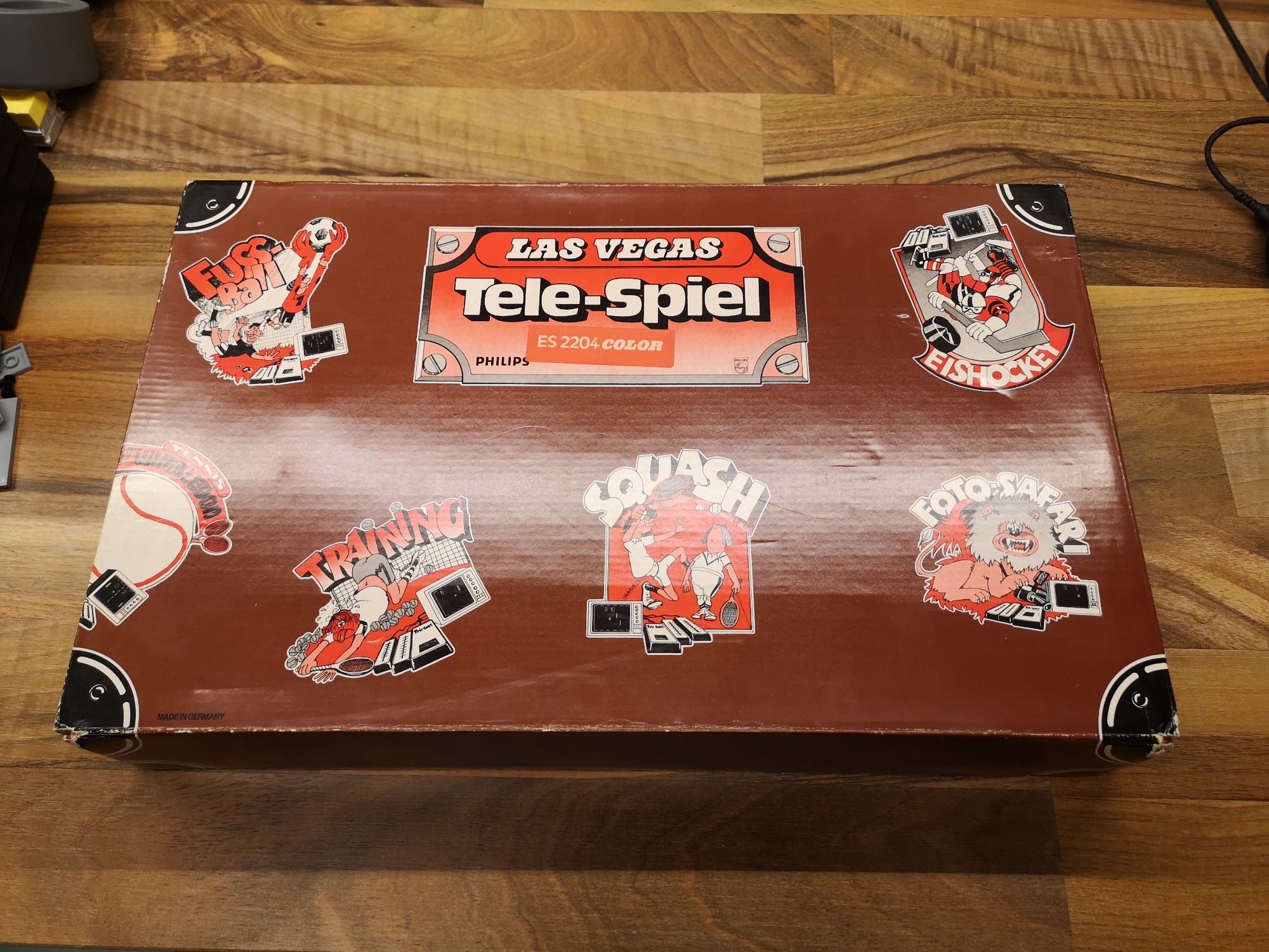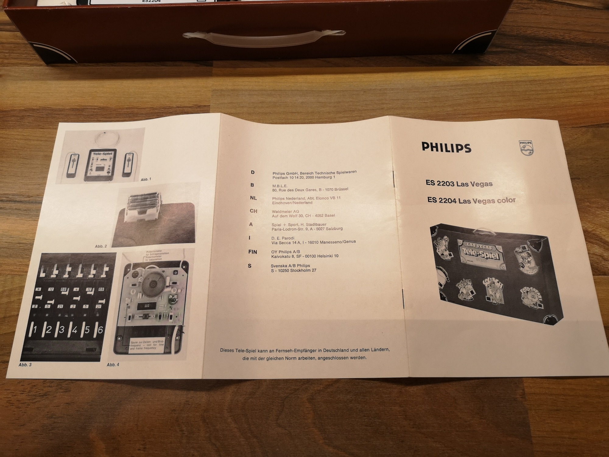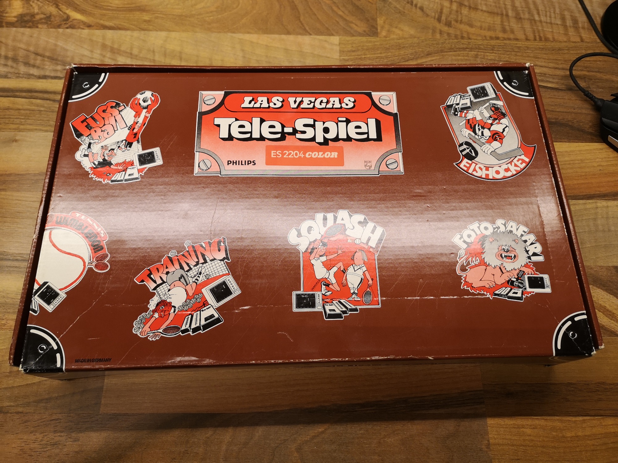 Philips hatte neben der Übernahme Magnavox und deren Odyssey-Konsolen-Designs auch eine eigene Tele-Spiel Serie am laufen. Diese waren mit einem großen Tele-Spiel Logo bedruckt und unter der ES22xx Modell-Nummer geführt. In diesem Artikel beleuchten wir die ES2204. Als Las Vegas benannt wurden die Farb-Varianten der Tele-Spiel Reihe. Somit konnte sie unter Verwendung des Pong Chips AY-3-8500 ein Farbbild der 6 integrierten Spiele auf die Röhre zaubern. Ähnlich ihrer Konkurrenz konnten auch hier über Schalter an der Konsole Ein/Aus geschaltet, Geschwindigkeit, Abprall-Winkel und Größe des Schlägers eingestellt werden. Die Taster für Punkte-Reset und Balleinwurf, sowie eine Einwurf-Wahl von Auto/Manuell waren auch vorhanden. Unüblich war dass sich auch der Signal-Poti, der 9 V Netzteil-Anschluss und der Lightgun-Port auf dem Bedienlayout befunden haben. Über einen Schiebeschalter konnte man zwischen den 6 üblichen Games wählen.