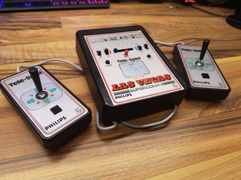 Philips hatte neben der Übernahme Magnavox und deren Odyssey-Konsolen-Designs auch eine eigene Tele-Spiel Serie am laufen. Diese waren mit einem großen Tele-Spiel Logo bedruckt und unter der ES22xx Modell-Nummer geführt. In diesem Artikel beleuchten wir die ES2218. Als Las Vegas benannt wurden die Farb-Varianten der Tele-Spiel Reihe. Somit konnte sie unter Verwendung des Pong Chips AY-3-8600 ein Farbbild der 8 integrierten Spiele auf die Röhre zaubern. Über Schalter an der Konsole konnte Ein/Aus geschaltet, Ballverhalten und Größe des Schlägers eingestellt werden. Ein Taster für Punkte-Reset war in rot mittig platziert. Zusätzlich gab es noch 2 Potis im Layout, jeweils um das Signal und die Farbe zu justieren. Die Spiele konnten über einen zentralen Schiebeschalter angewählt werden.