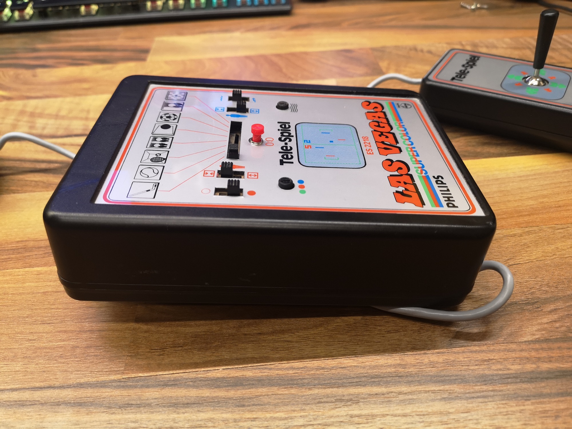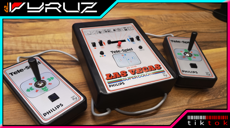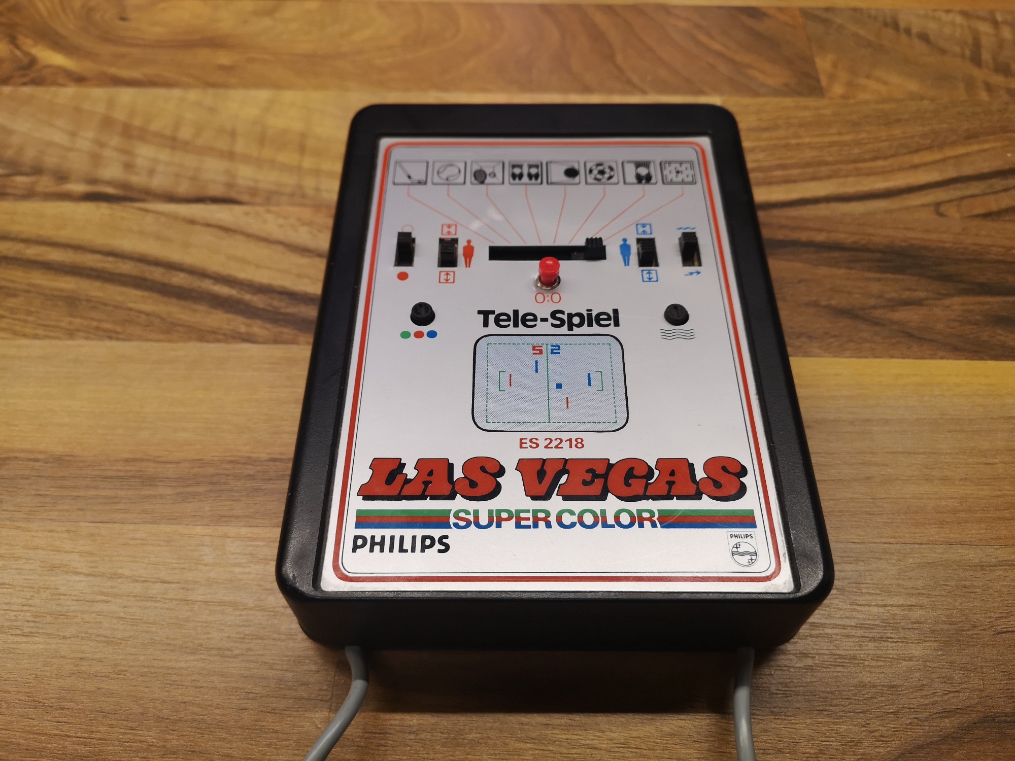 Philips hatte neben der Übernahme Magnavox und deren Odyssey-Konsolen-Designs auch eine eigene Tele-Spiel Serie am laufen. Diese waren mit einem großen Tele-Spiel Logo bedruckt und unter der ES22xx Modell-Nummer geführt. In diesem Artikel beleuchten wir die ES2218. Als Las Vegas benannt wurden die Farb-Varianten der Tele-Spiel Reihe. Somit konnte sie unter Verwendung des Pong Chips AY-3-8600 ein Farbbild der 8 integrierten Spiele auf die Röhre zaubern. Über Schalter an der Konsole konnte Ein/Aus geschaltet, Ballverhalten und Größe des Schlägers eingestellt werden. Ein Taster für Punkte-Reset war in rot mittig platziert. Zusätzlich gab es noch 2 Potis im Layout, jeweils um das Signal und die Farbe zu justieren. Die Spiele konnten über einen zentralen Schiebeschalter angewählt werden.