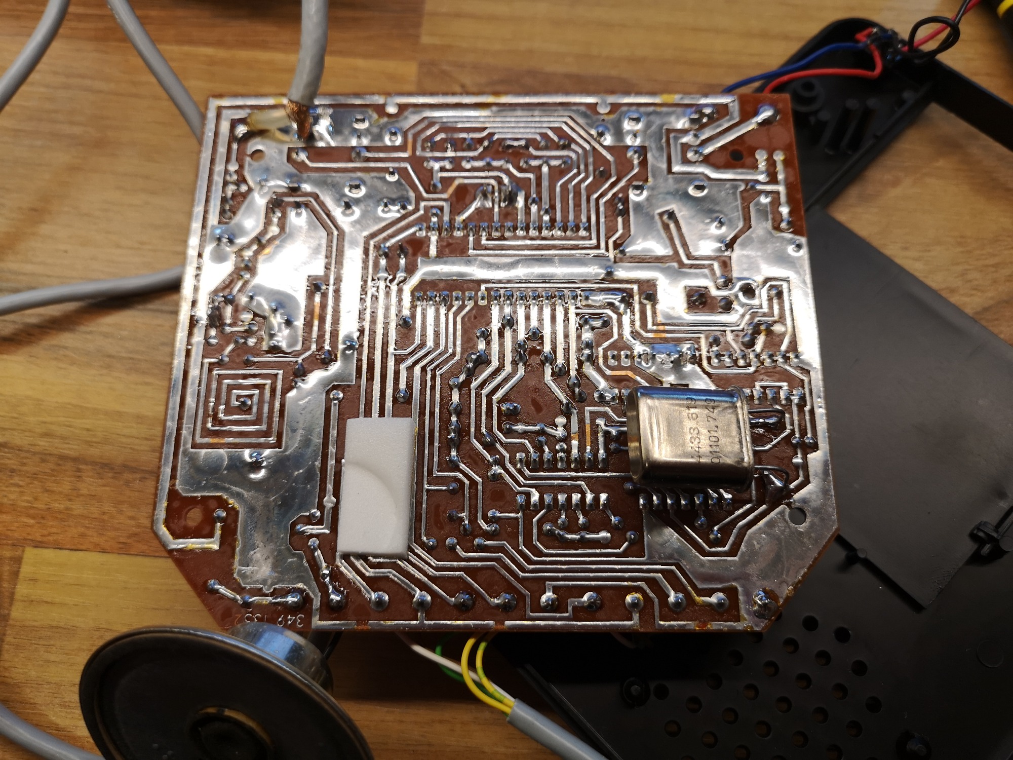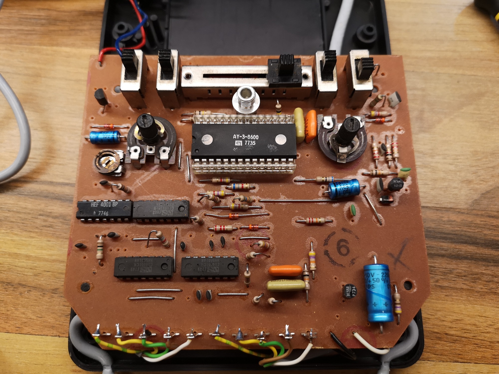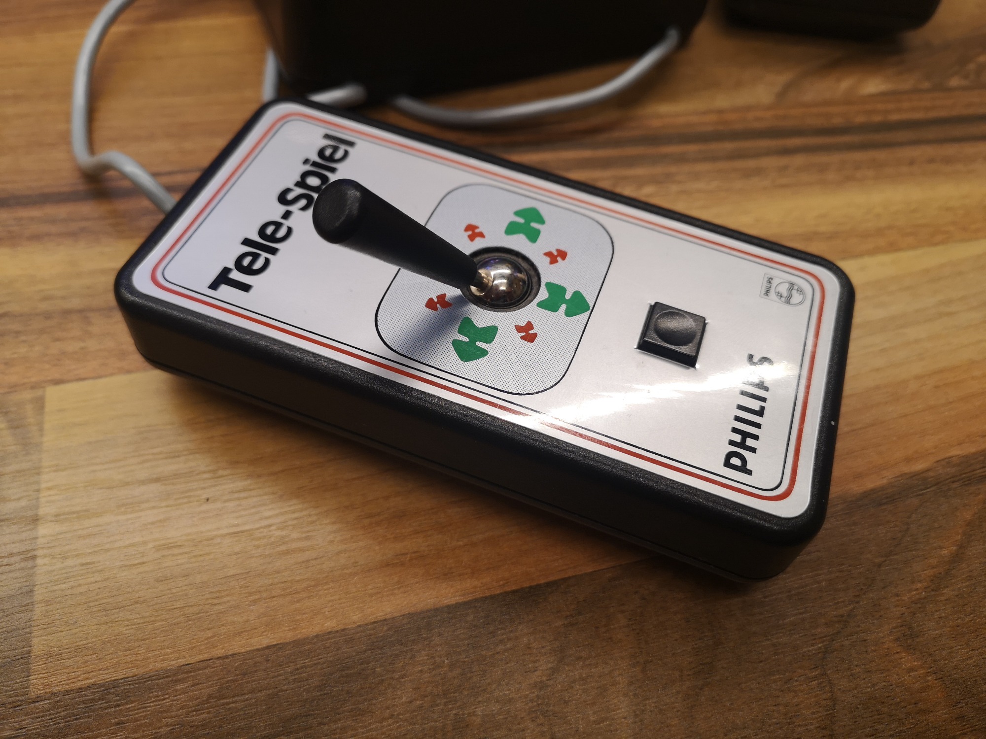 Die Steuerung der Spieler ist dank der Joysticks diesmal in 2 Dimensionen möglich. Seriös und technisch kommt die Tele-Spiel-Reihe daher. Alle hatten das selbe kompakte Gehäuse-Maß und nur das Layout wurde angepasst. Alle Schalter und Taster sind in ihrer Reinform verbaut, keine designten Kappen vorhanden. Schlicht, funktional, aufgeräumt. Mit sauberen, feinen Drucken auf der Alu-Platte. Das Design wirkt nicht so verspielt wie die üblichen Konsolen, eher wie ein Messinstrument. Würde sich auch in eine Labor-Landschaft einbringen. Dementsprechend versuchte man hier, denke ich, auch eher das Erwachsenen-Publikum zu erreichen. Philips stand ja auch eher für Qualität und Technik im erhabenen Preis-Segment. Das lange, fest montierte Antennenkabel habe ich üblicherweise wieder durch eine RF-Cinch-Buchse ersetzt.