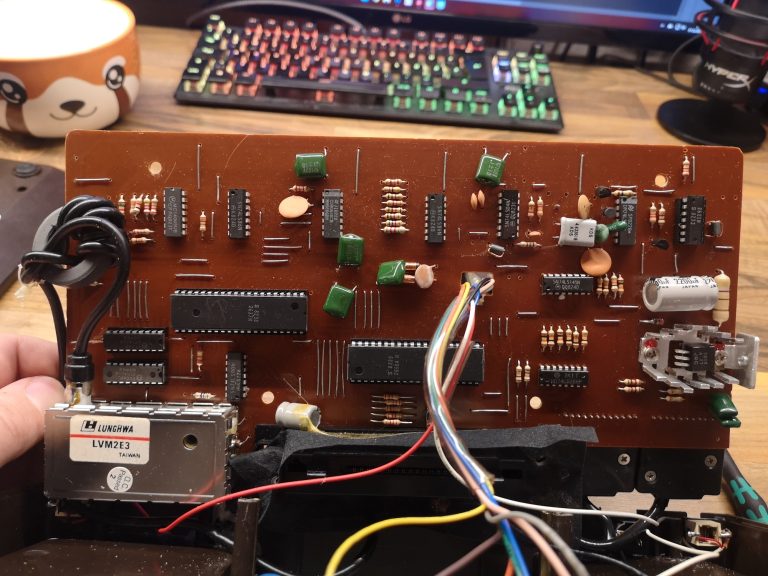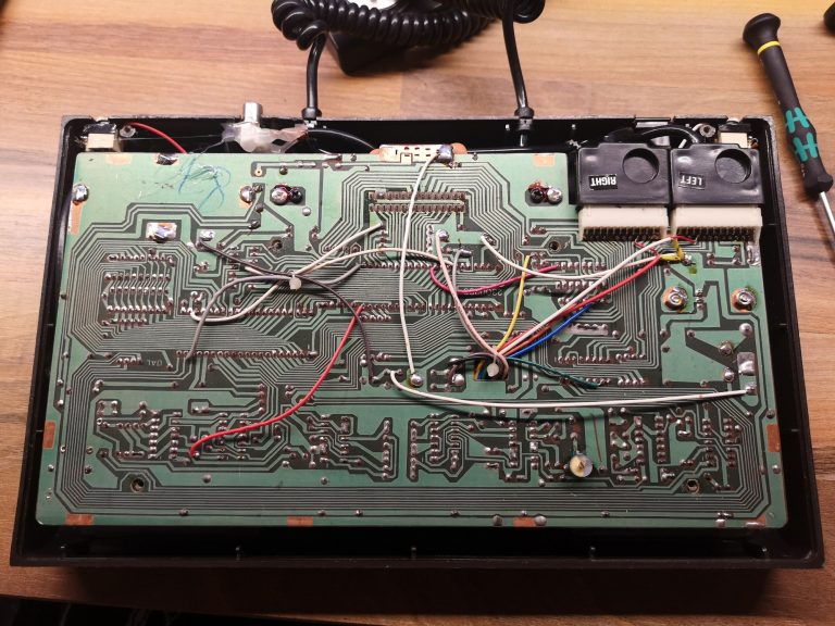 Folienkontakte erfreuten sich zu dieser Zeit großer Beliebtheit. So wurden die Tasten 0-9, clear und enter auf ein Folienfeld im Controller platziert. Auf dieses konnte dann, je nach Spiel, ein Overlay drüber geschoben werden und somit war der Controller individuell auf jedes Spiel mit seinen Tasten und Design zugeschnitten. Mit den Discs konnte man Richtungen übermitteln, wie bei einem Steuerkreuz. Durch das Gewinde in der Mitte konnte ein Stick eingeschraubt werden und somit eine Joysticksteuerung erzeugen. Auf jeder Seite waren zusätzlich noch jeweils ein Action Button. Gelagert wurden sie in Mulden auf der Konsole selbst, fest verbunden mit einem Spiralkabel. Reset, Select, Option, Start und natürlich Power waren als Knöpfe auf der Konsole selbst untergebracht. Um das lästige, fest verdrahtete Antennenkabel loszuwerden, habe ich noch eine Cinch Buchse anstelle dieses verbaut.