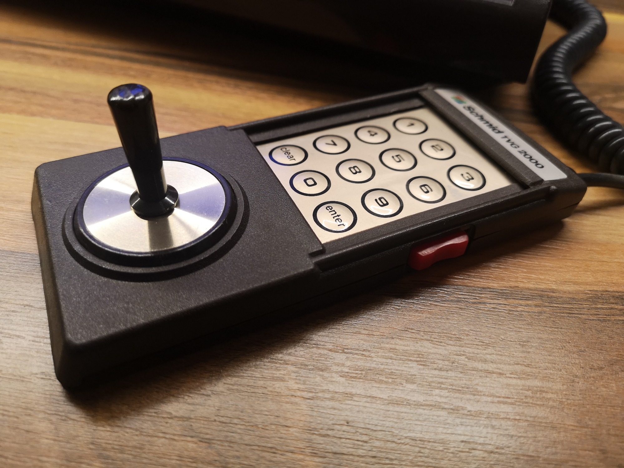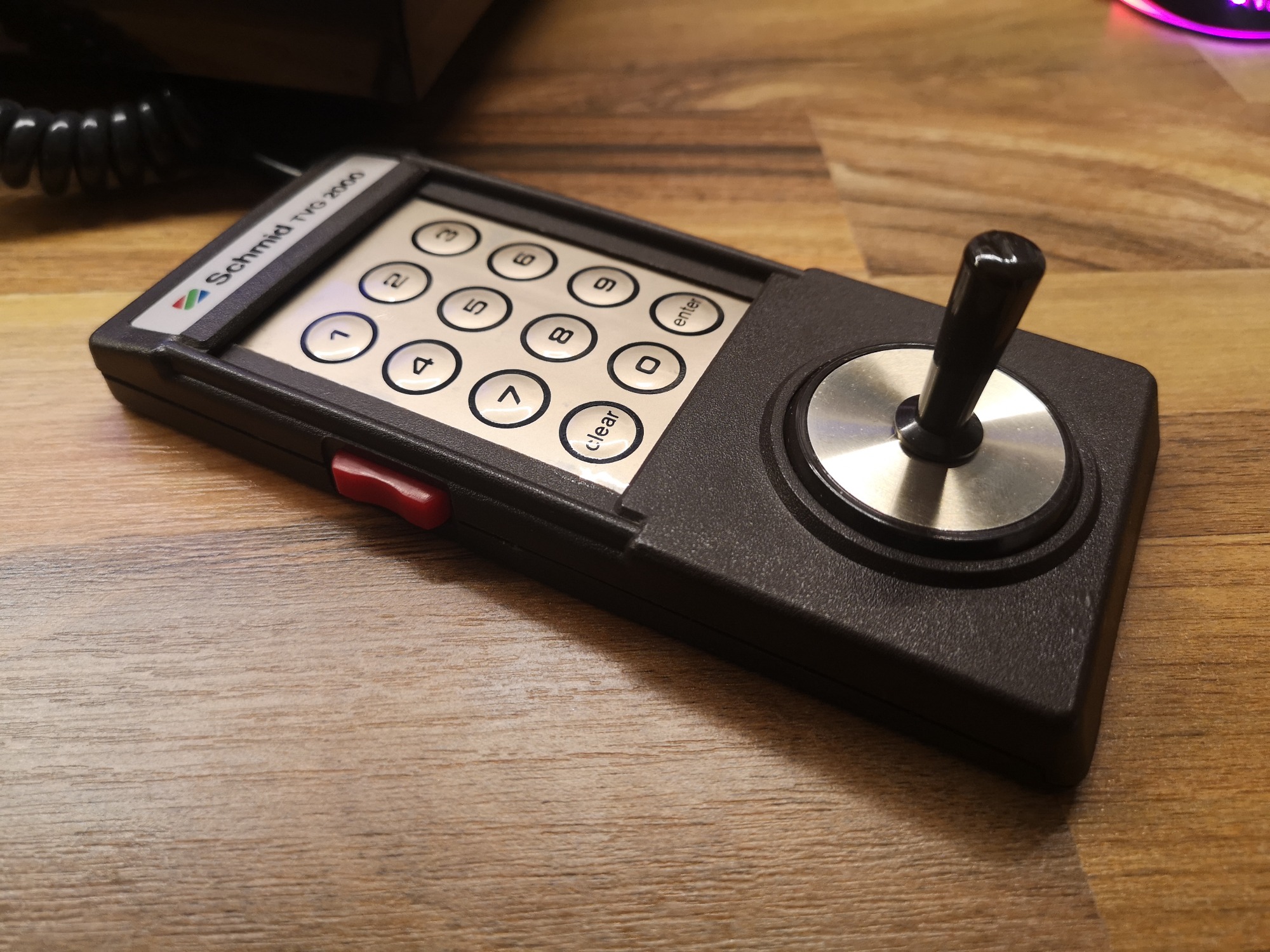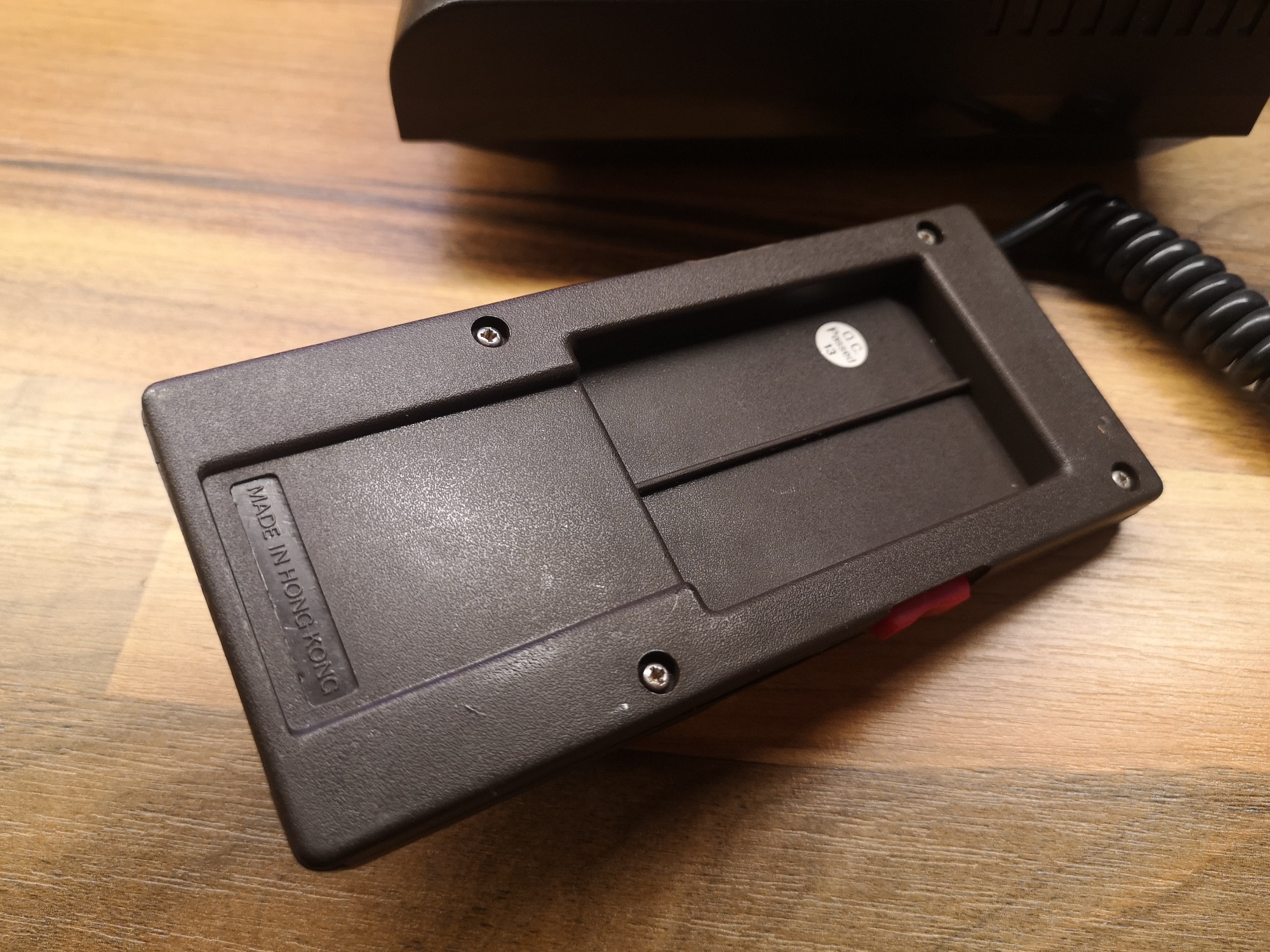 Folienkontakte erfreuten sich zu dieser Zeit großer Beliebtheit. So wurden die Tasten 0-9, clear und enter auf ein Folienfeld im Controller platziert. Auf dieses konnte dann, je nach Spiel, ein Overlay drüber geschoben werden und somit war der Controller individuell auf jedes Spiel mit seinen Tasten und Design zugeschnitten. Mit den Discs konnte man Richtungen übermitteln, wie bei einem Steuerkreuz. Durch das Gewinde in der Mitte konnte ein Stick eingeschraubt werden und somit eine Joysticksteuerung erzeugen. Auf jeder Seite waren zusätzlich noch jeweils ein Action Button. Gelagert wurden sie in Mulden auf der Konsole selbst, fest verbunden mit einem Spiralkabel. Reset, Select, Option, Start und natürlich Power waren als Knöpfe auf der Konsole selbst untergebracht. Um das lästige, fest verdrahtete Antennenkabel loszuwerden, habe ich noch eine Cinch Buchse anstelle dieses verbaut.
