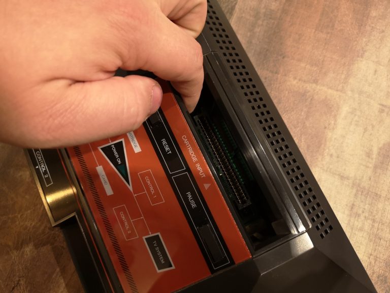 Das Sega Mark III, also die Basis unseres Master Systems aus Japan hat ein flaches, weißes Gehäuse mit Controller Haltern an beiden Seiten. Es ist auch schon sehr modern gestaltet. Wir bekommen ein schwarzes Gehäuse mit einem pyramidenartigen Design. Der Modul-Schacht und die Sega Card-Slots sind auch bei uns gegeben. Unter dem Modulschacht bekamen wir ein großes rotes Feld mit einer Art Ablaufdiagramm von Modul bis TV. Das lässt die Konsole noch futuristisch, technischer erscheinen. In den 80ern zum SynthWave Zeitgeist passend. Pause- und Reset-Button waren hier auch deponiert. An der vorderen Unterkante befanden sich dann Power-Button und die 2 Controller-Ports.