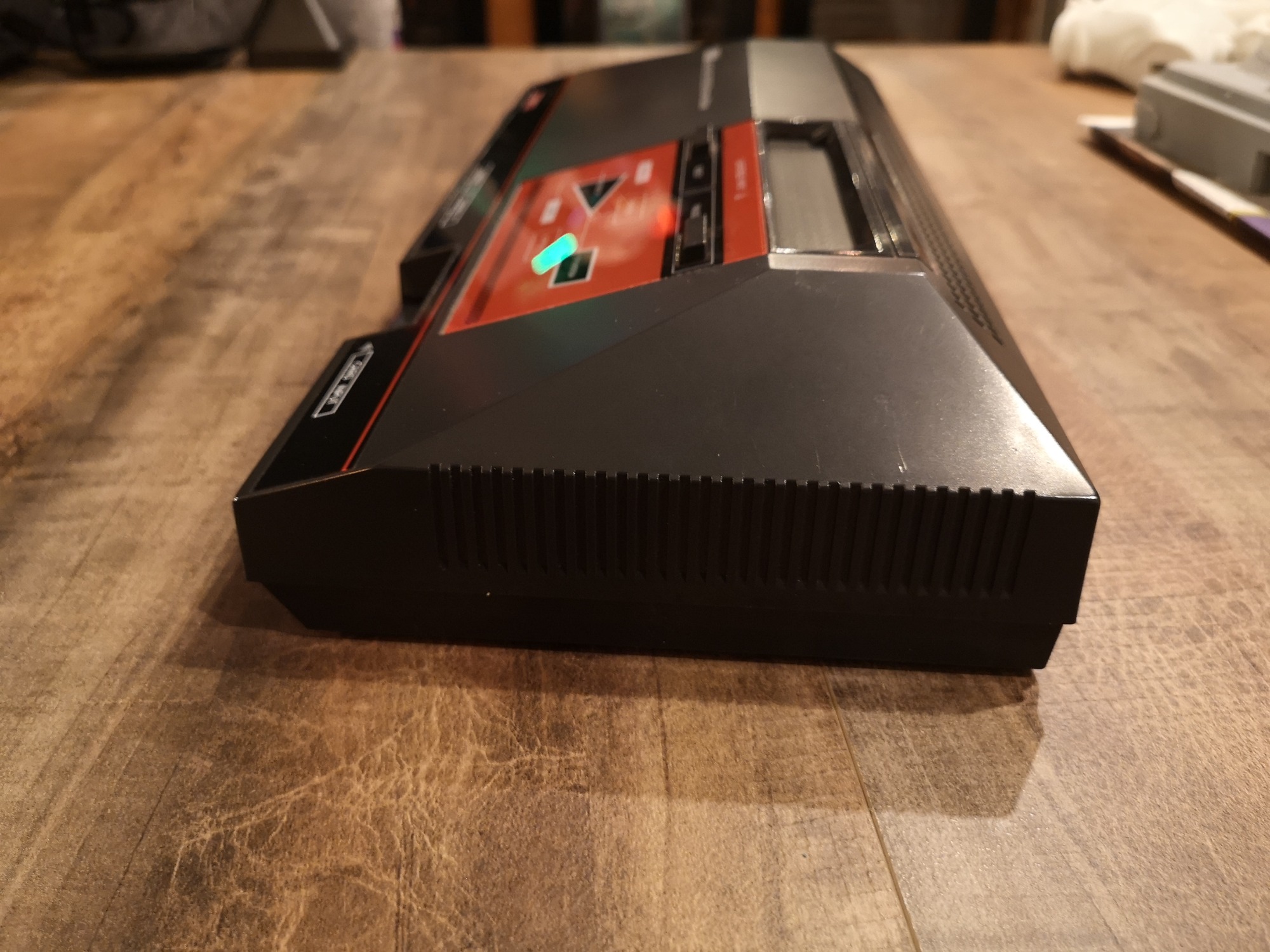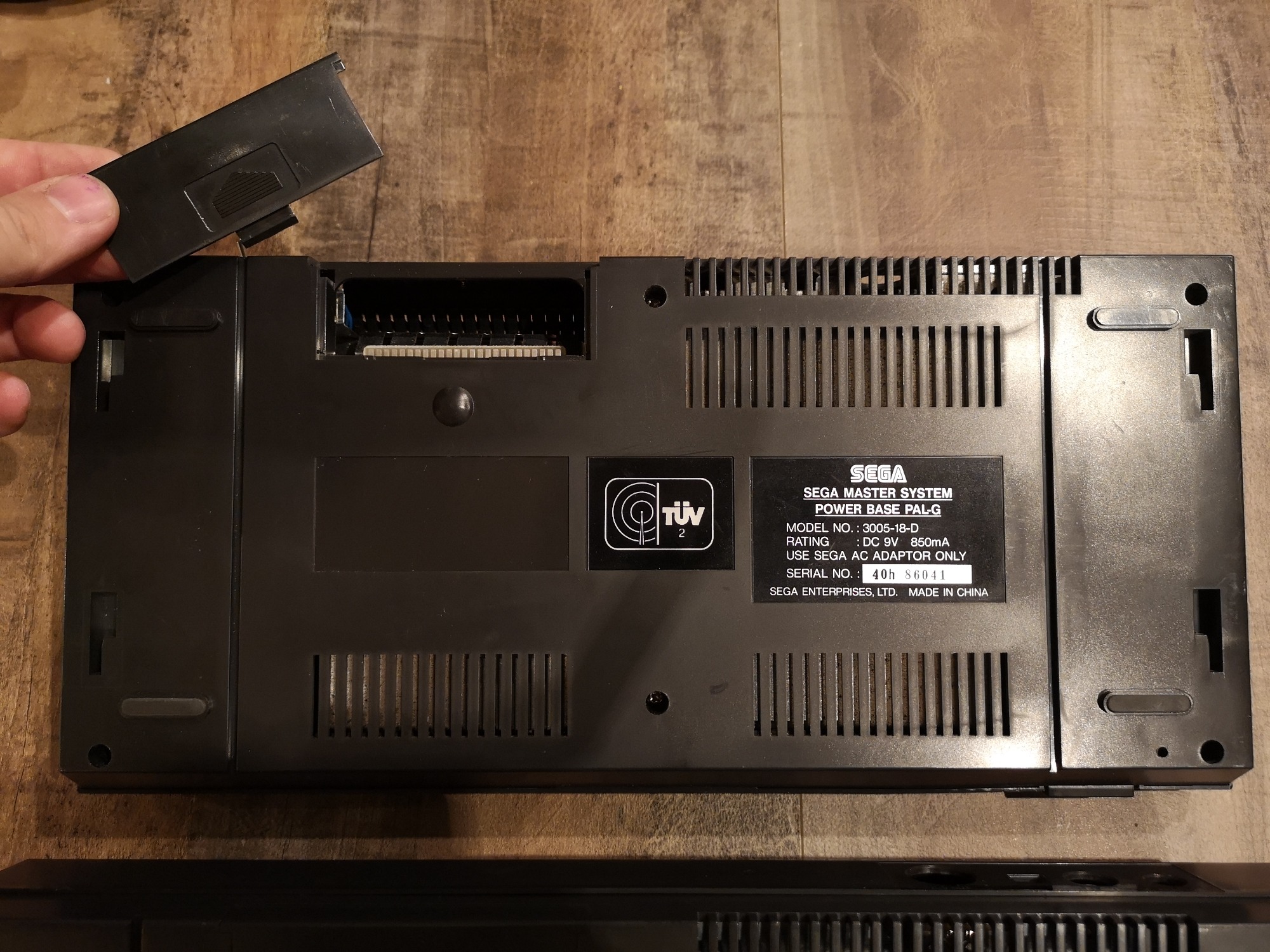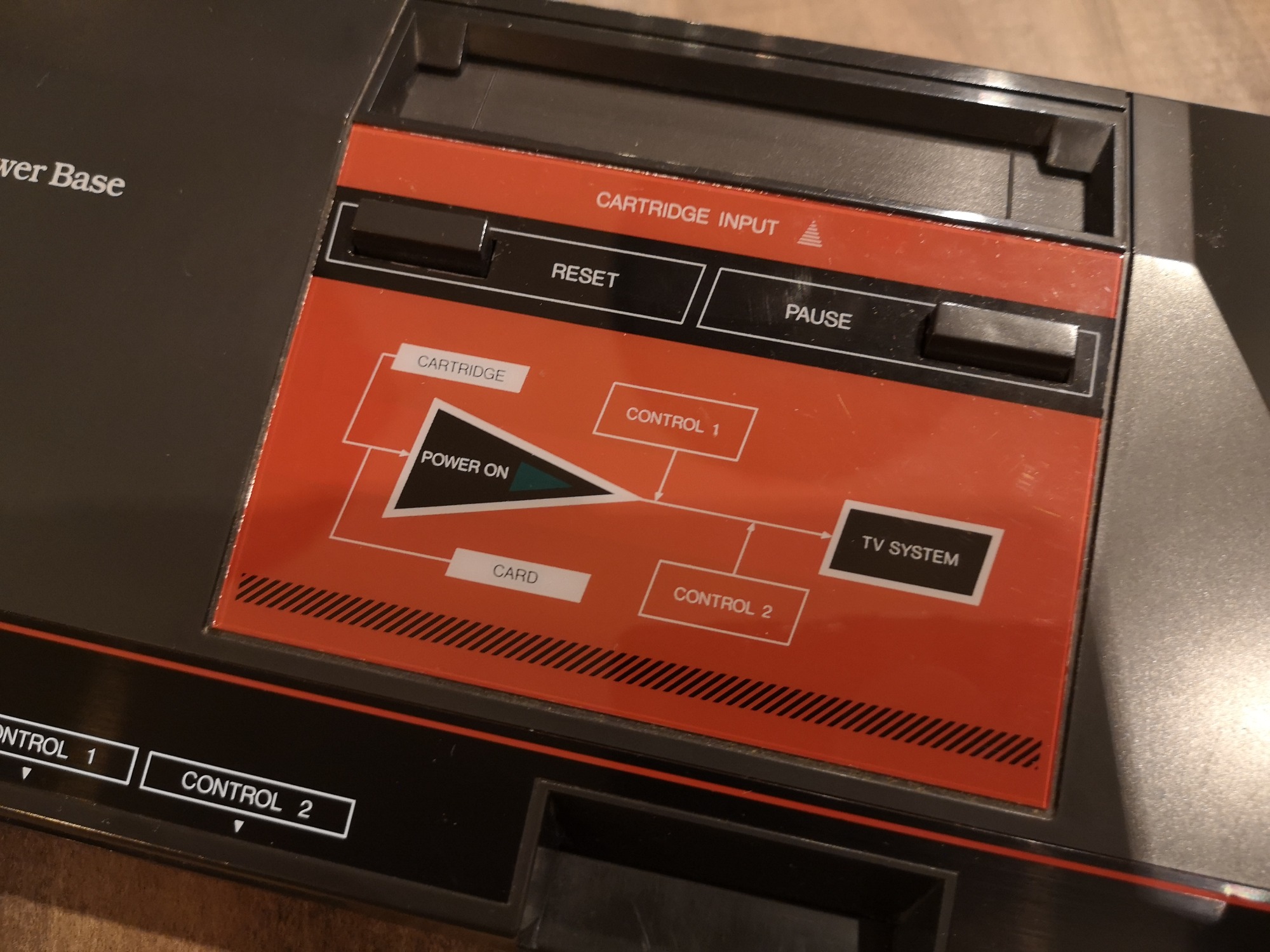 Das Sega Mark III, also die Basis unseres Master Systems aus Japan hat ein flaches, weißes Gehäuse mit Controller Haltern an beiden Seiten. Es ist auch schon sehr modern gestaltet. Wir bekommen ein schwarzes Gehäuse mit einem pyramidenartigen Design. Der Modul-Schacht und die Sega Card-Slots sind auch bei uns gegeben. Unter dem Modulschacht bekamen wir ein großes rotes Feld mit einer Art Ablaufdiagramm von Modul bis TV. Das lässt die Konsole noch futuristisch, technischer erscheinen. In den 80ern zum SynthWave Zeitgeist passend. Pause- und Reset-Button waren hier auch deponiert. An der vorderen Unterkante befanden sich dann Power-Button und die 2 Controller-Ports.