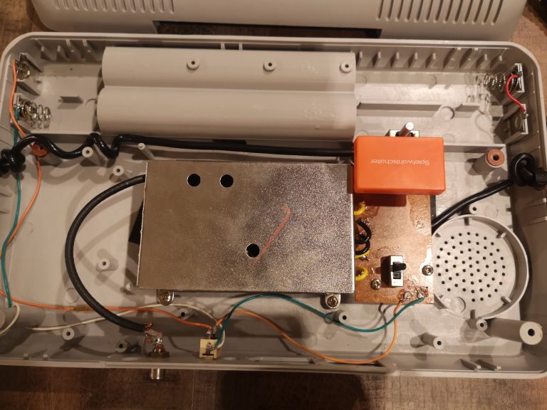 Auffällig ist, dass die Konsole mit einem 18 Volt Netzteil betrieben wird. Üblich waren zu der Zeit immer 9 Volt. Diese konnten auch mit 6 x 1,5 Volt C-Batterien erzeugt werden, sodass diese Option eigentlich fast alle Pongs hatten. Sportron hat die doppelte Menge an Versorgungsspannung und trotzdem ein Batteriefach integriert. Naja, man muss sagen, das haben sie recht geschickt gelöst, oder so... In die Konsole kommen sage und schreibe 12x C-Batterien, was eine Maglite dann fast schon leicht wirken lässt. Also zur Einbrecherbekämpfung eure Sportron mit Batterien bestücken und mit dem neu gewonnenen Meinungsverstärker den Übeltäter verjagen! Öffnet man das Gehäuse sieht es elektronisch aber anders aus!