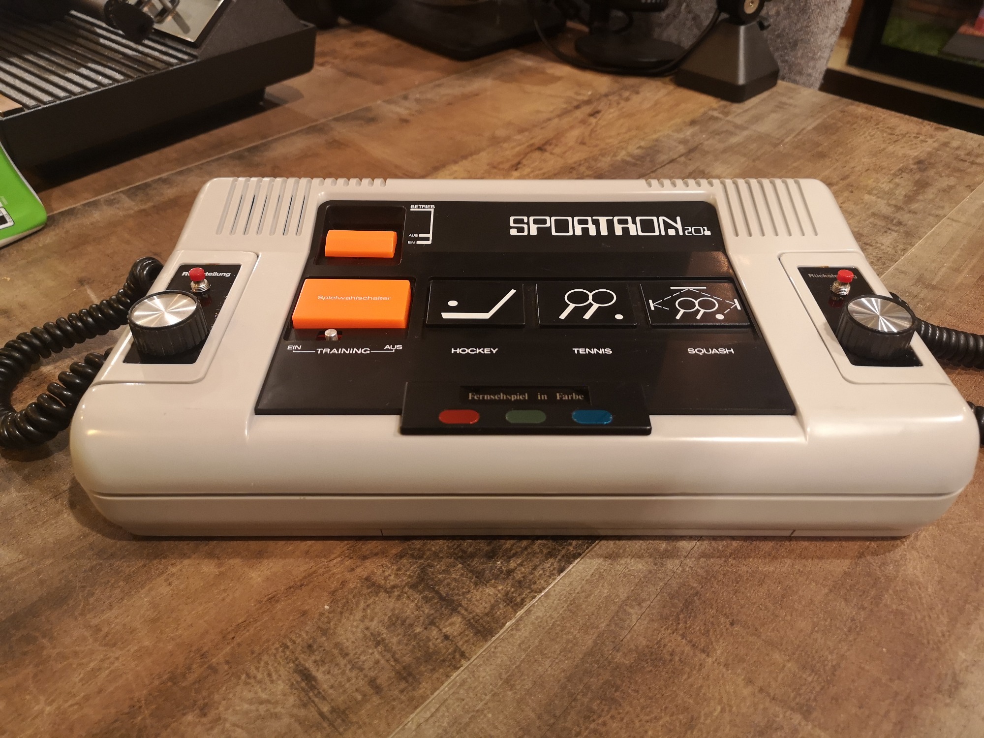 Etwas wuchtig kommt diese Pong Konsole daher, wenngleich mir ihr Design doch sehr gefällt. Das Hellgrau, Schwarz und Orange erinnern an die Black Point Konsolen von SHG, welche mir schon doll zusagten. Durch die kompakt schmalen Controller wirkt sie noch wuchtiger, die großzügig abgerundeten Kanten erledigen den Rest. Sie wirkt wie ein großes Retro-Steuerpult, toll. Viel gibt es hier aber nicht zu steuern. Wir haben einen großen Taster, der zwischen den 3 bekannten Pong Spielen Hockey, Tennis und Squash wechselt , Training Ein/Aus und den generellen Ein-/Aus-Schalter. Das wars, ganz simpel. Auf den Controllern befinden sich zu den Drehreglern noch Rückstellungsbuttons.