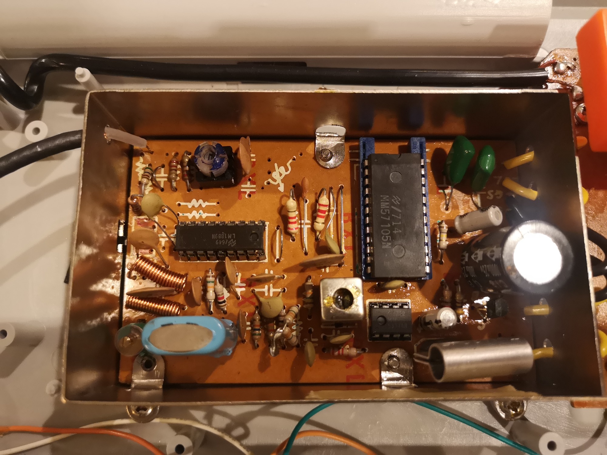 Überraschung! Hier haben wir die wohl kleinste Hauptplatine unter den Pong-Geräten. Was die Batterien an Gehäusemaße aufblähen ist der Wahnsinn. Wäre man hier auf 1 oder 2 9 Volt Block-Batterien gegangen oder die Option einfach weglassen, wäre man auf Taschenrechner Niveau gekommen. Und wer ziert diese Platine nun? Ein alter bekannter aus der Interton 2501, der National Semiconductor MM-57105N. Er versucht als abgespeckter Allrounder mit den 3 Games, aber dafür in Farbe, zu dem AY-3-8500 von GI aufzuschließen, für alle die einen Farb-Fernseher haben. Pong in bunt wird auf die nächste Stufe gehoben.