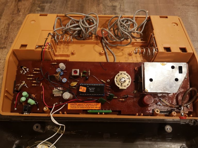 Nahezu alle Universum Pongs sind ähnlich aufgebaut. Sie haben einen internen Lautsprecher für die Sound-Effekte, die Möglichkeit per 9 Volt Netzteil oder alternativ mit 6x C-Batterien betrieben zu werden. Die Controller sind ohne Stecker fest verbaut, sowie das Antennenkabel. Das Antennenkabel habe ich durch eine Cinch-Buchse ersetzt, so kann man mit einem RF-Cinch Kabel die Konsole bei Bedarf anschließen, ohne den Kabelsalat. Zudem macht sie sich in der Vitrine so besser. Im inneren sehen wir noch handverlötete Platinen und einzelne Bauteile mit Kabeln kreuz und quer verdrahtet. Hier galt mehr die Funktion im Vordergrund, als ein strukturierter Aufbau oder Kabelmanagement.