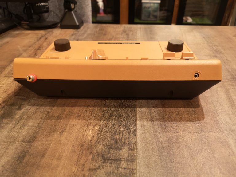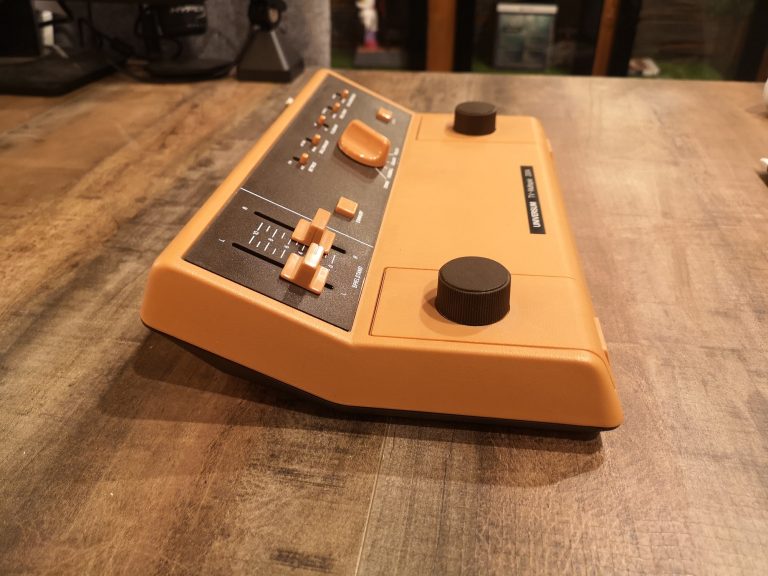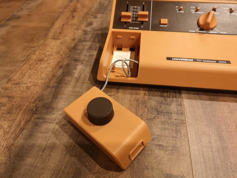 Der GI AY-3-8500 Chip prägte über Jahre die Heimkonsolen Geschichte. Der Pong Allrounder war in unzähligen Konsolen aller möglichen Hersteller verbaut, wie auch in einer Serie an Universum Geräten. Diese hier ist eine von ihnen, gehalten in einem Nougat-Beige Ton in Kombination mit einem ganz dunklen Braun. Die Kombination finde ich sehr gelungen und spiegelt die Zeit der 1970er wieder. Die Controller sind in der Konsole verstaut, lassen sich herausnehmen, was eine saubere Optik gewehrleistet. Diese Ausführung kommt mit der bekannten Drehregler-Steuerung daher. Die Spiele werden auch über einen Drehschalter gewählt.