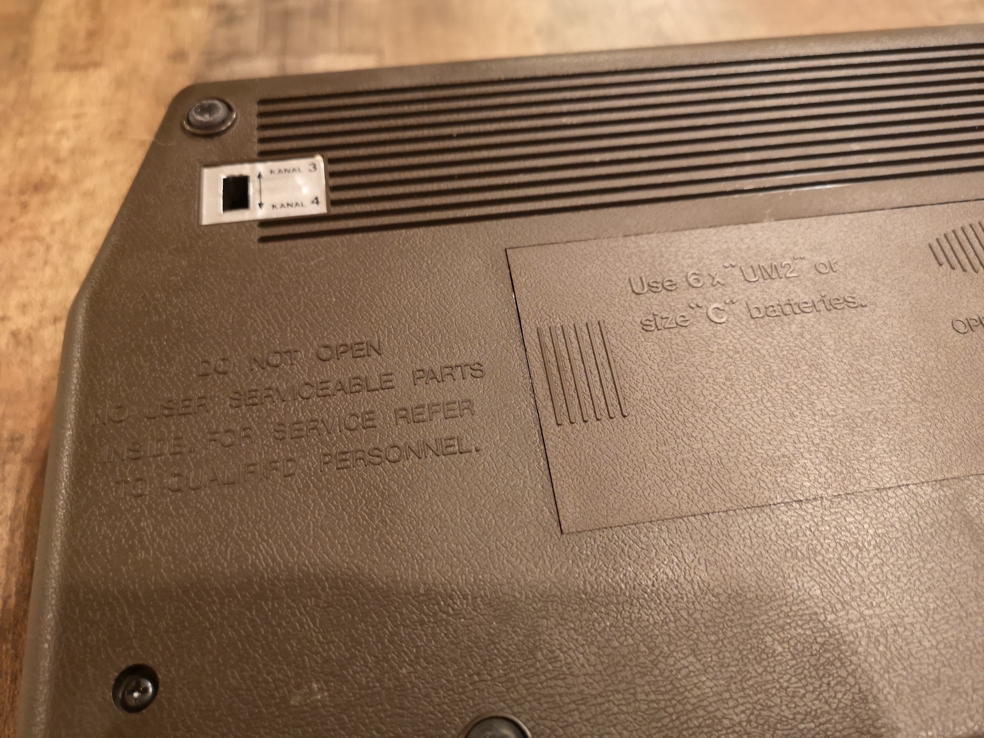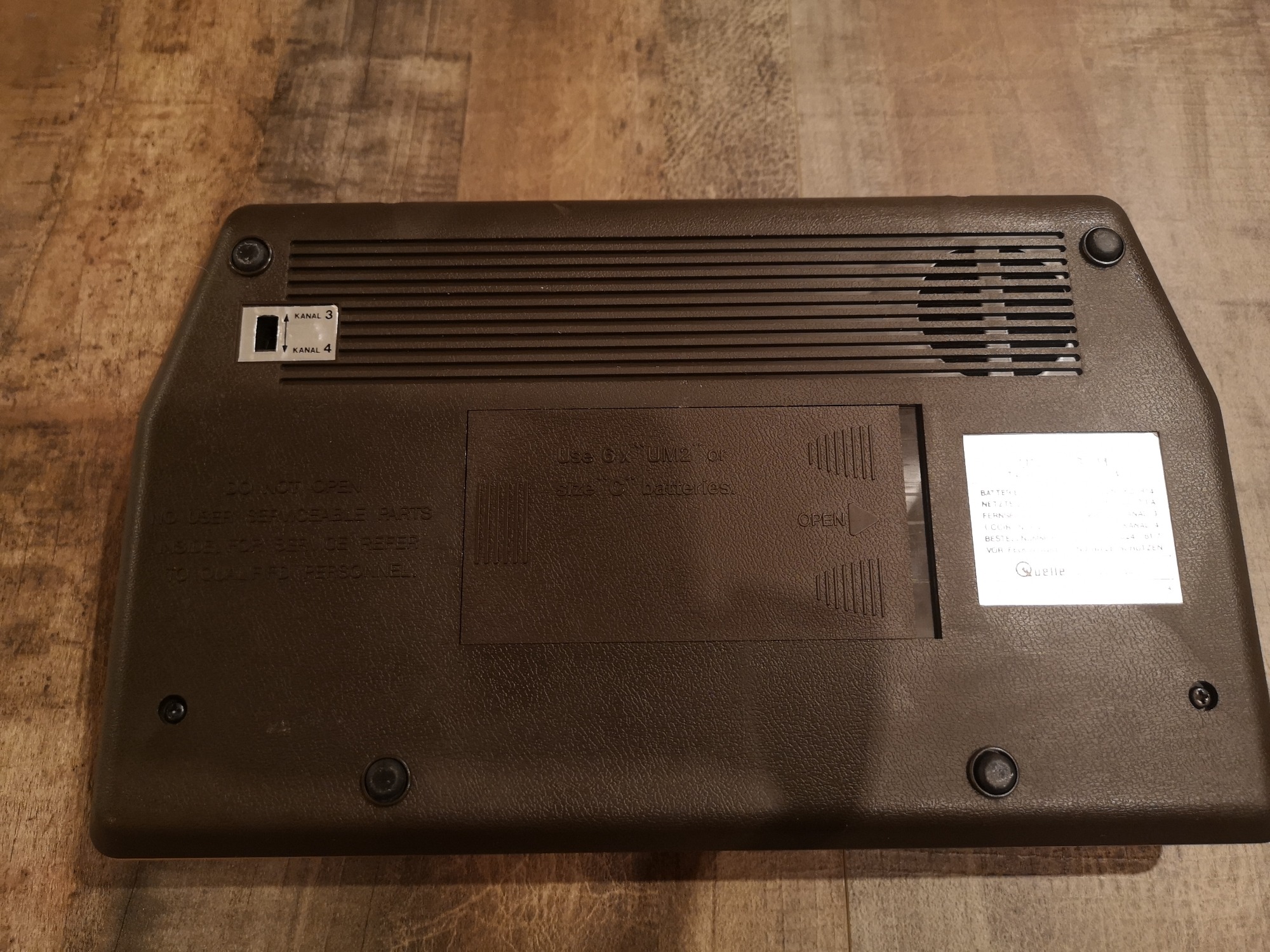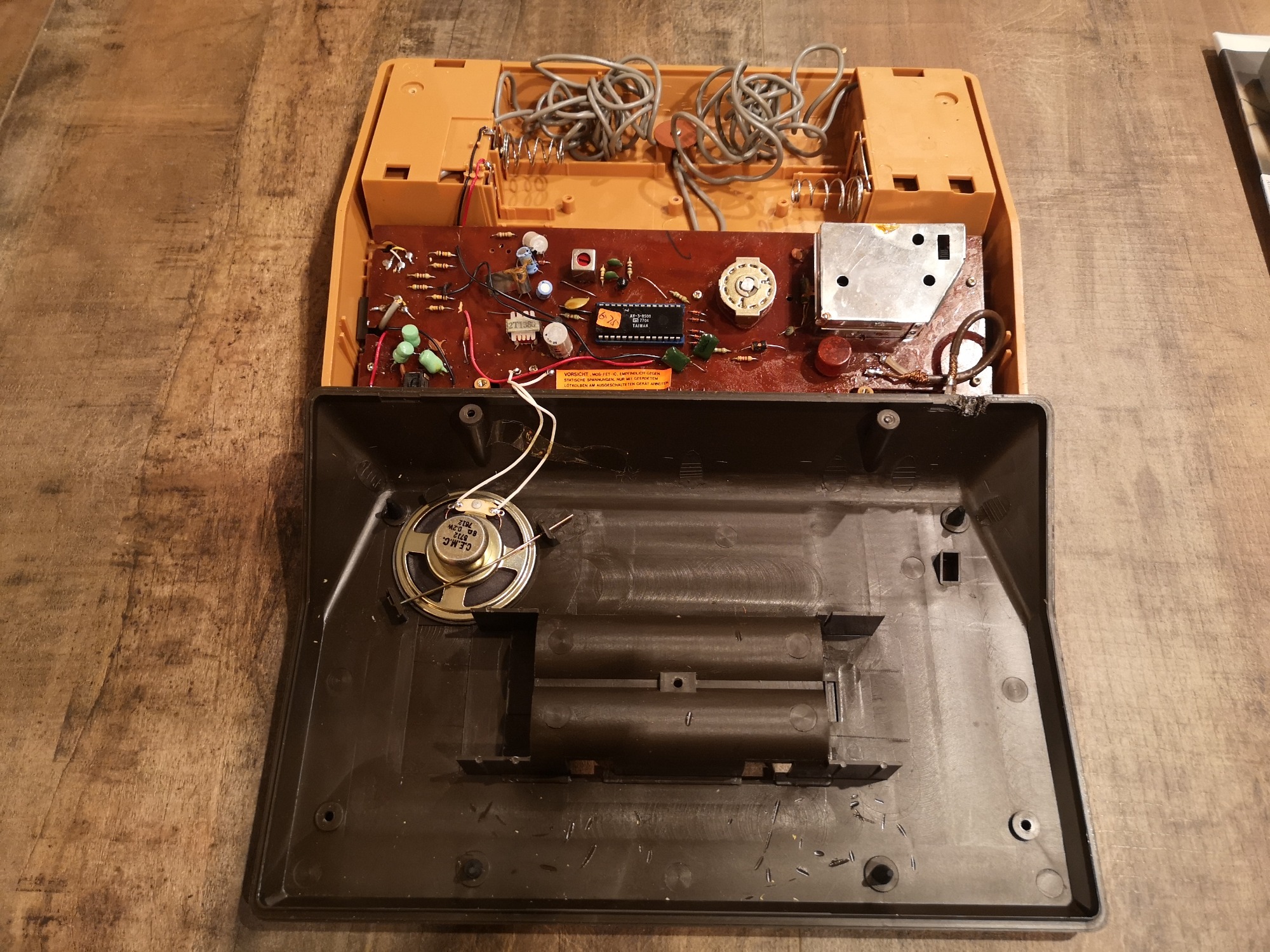Nahezu alle Universum Pongs sind ähnlich aufgebaut. Sie haben einen internen Lautsprecher für die Sound-Effekte, die Möglichkeit per 9 Volt Netzteil oder alternativ mit 6x C-Batterien betrieben zu werden. Die Controller sind ohne Stecker fest verbaut, sowie das Antennenkabel. Das Antennenkabel habe ich durch eine Cinch-Buchse ersetzt, so kann man mit einem RF-Cinch Kabel die Konsole bei Bedarf anschließen, ohne den Kabelsalat. Zudem macht sie sich in der Vitrine so besser. Im inneren sehen wir noch handverlötete Platinen und einzelne Bauteile mit Kabeln kreuz und quer verdrahtet. Hier galt mehr die Funktion im Vordergrund, als ein strukturierter Aufbau oder Kabelmanagement.