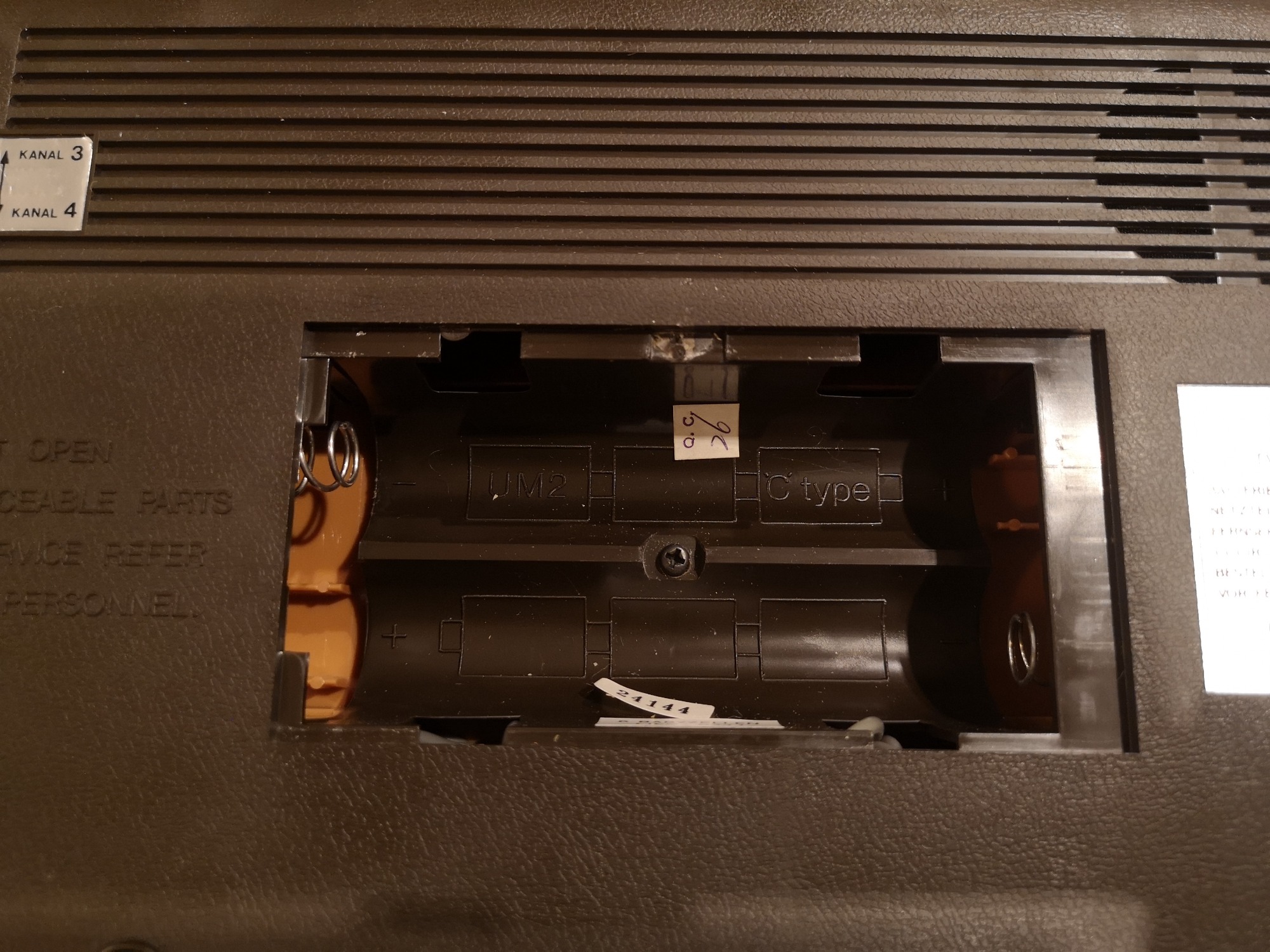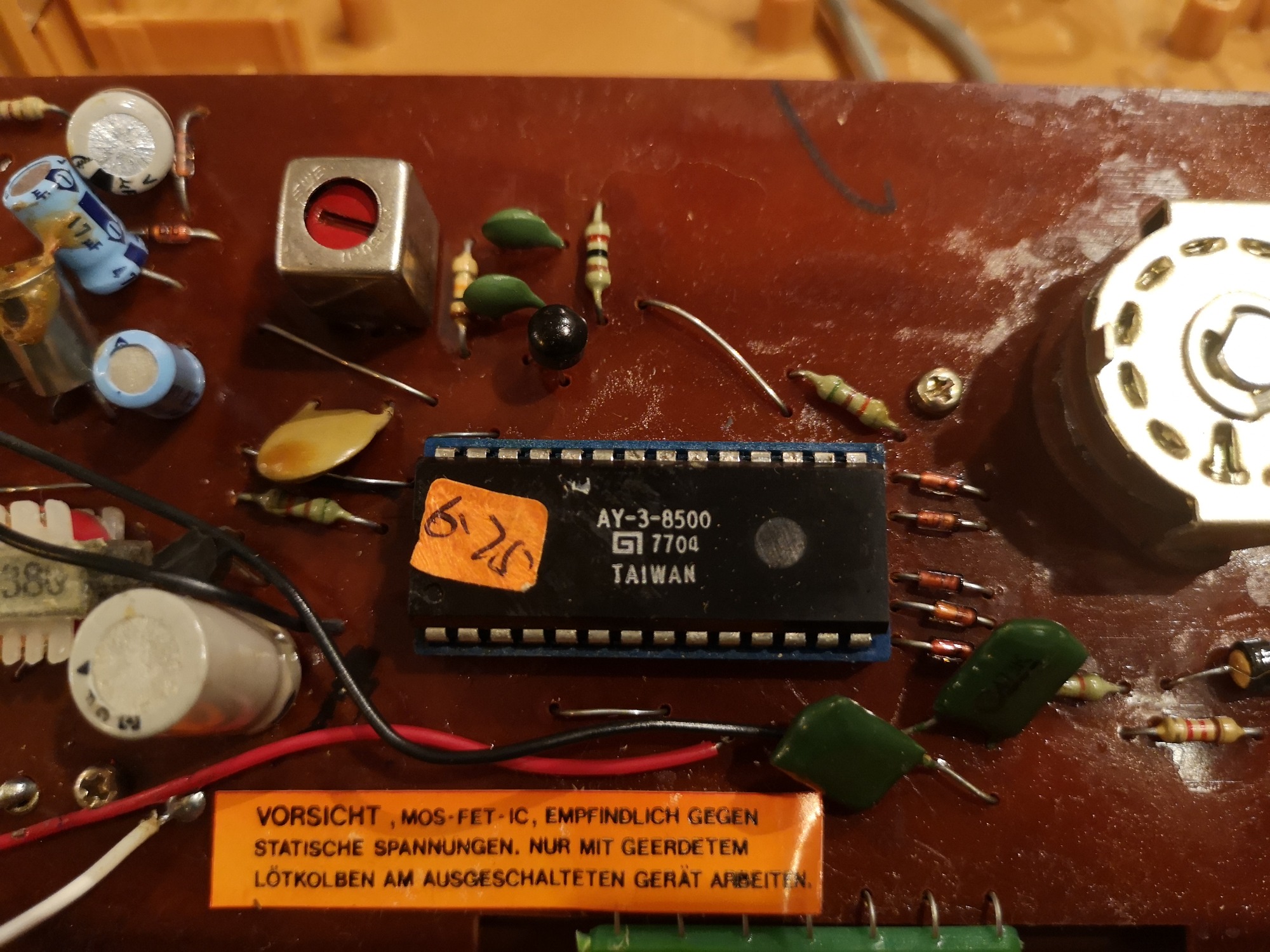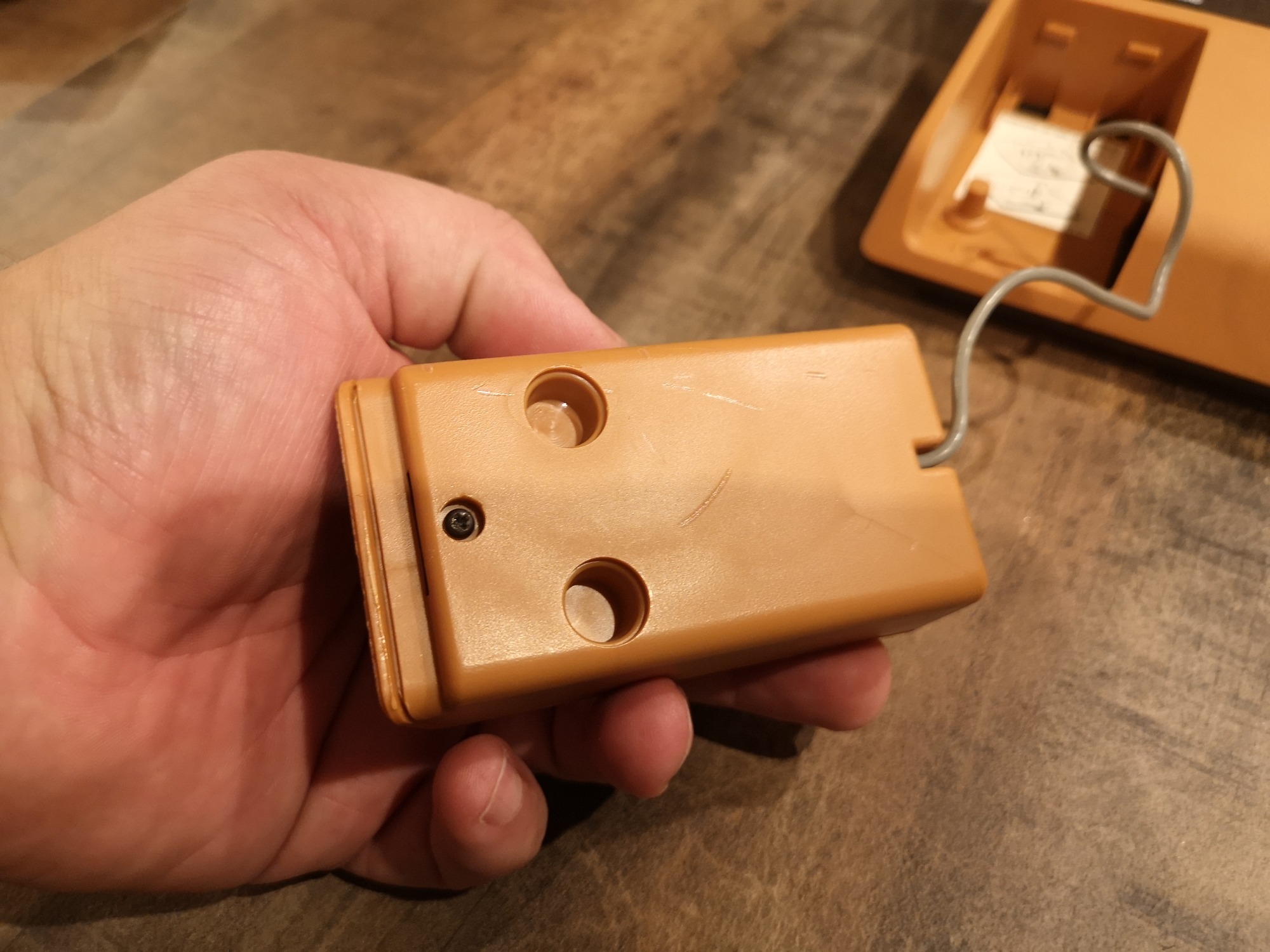 Nahezu alle Universum Pongs sind ähnlich aufgebaut. Sie haben einen internen Lautsprecher für die Sound-Effekte, die Möglichkeit per 9 Volt Netzteil oder alternativ mit 6x C-Batterien betrieben zu werden. Die Controller sind ohne Stecker fest verbaut, sowie das Antennenkabel. Das Antennenkabel habe ich durch eine Cinch-Buchse ersetzt, so kann man mit einem RF-Cinch Kabel die Konsole bei Bedarf anschließen, ohne den Kabelsalat. Zudem macht sie sich in der Vitrine so besser. Im inneren sehen wir noch handverlötete Platinen und einzelne Bauteile mit Kabeln kreuz und quer verdrahtet. Hier galt mehr die Funktion im Vordergrund, als ein strukturierter Aufbau oder Kabelmanagement.